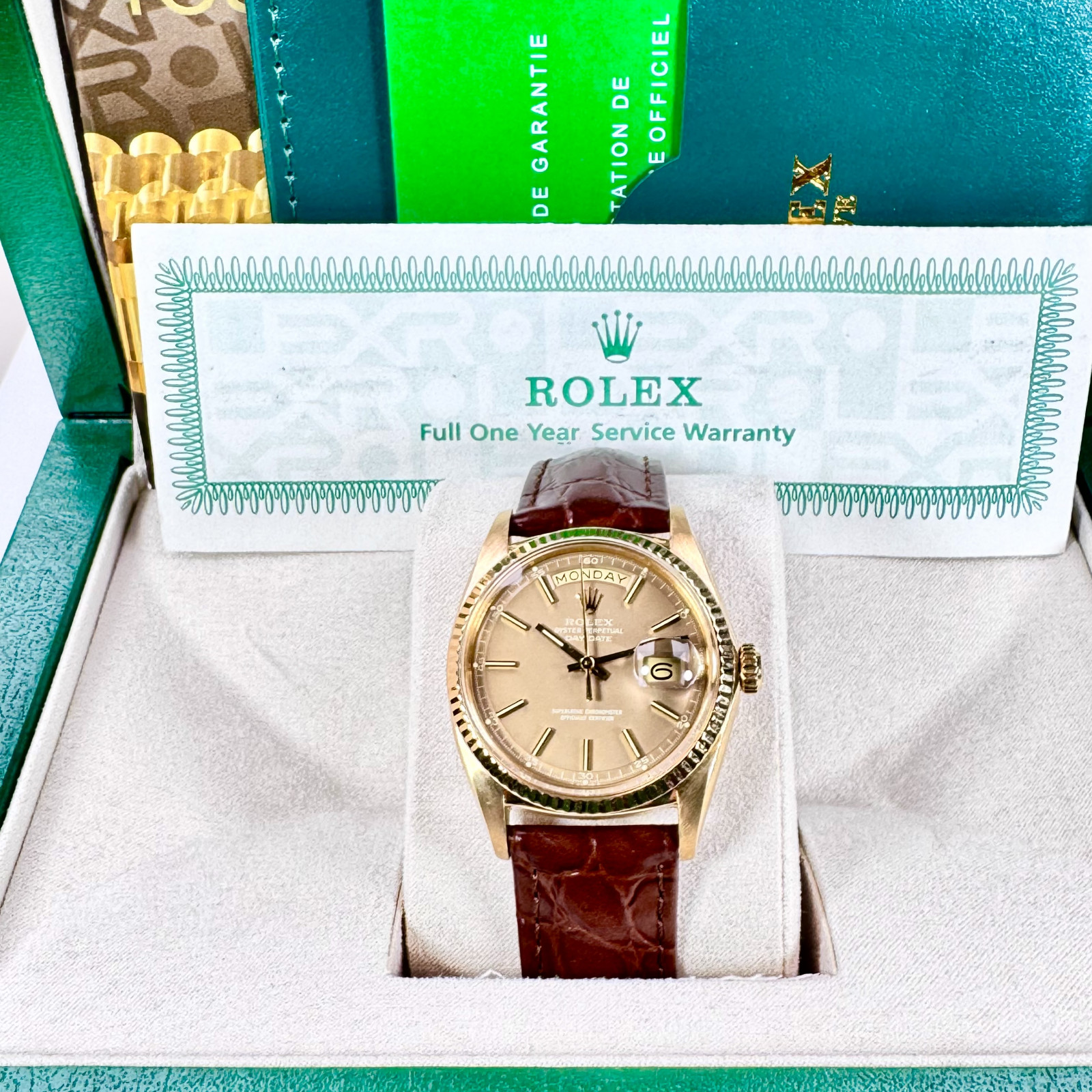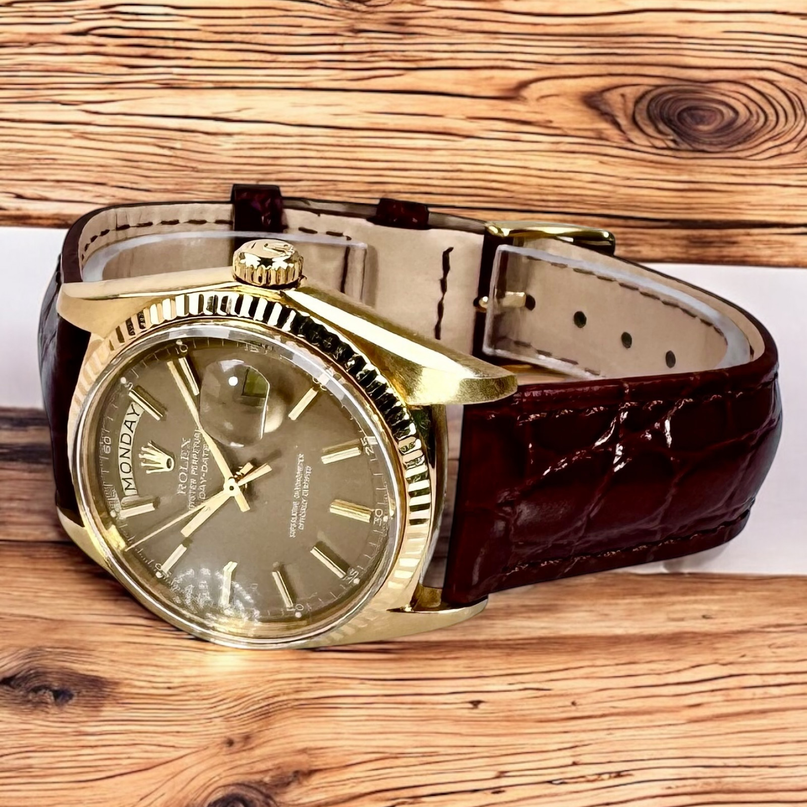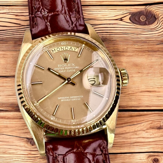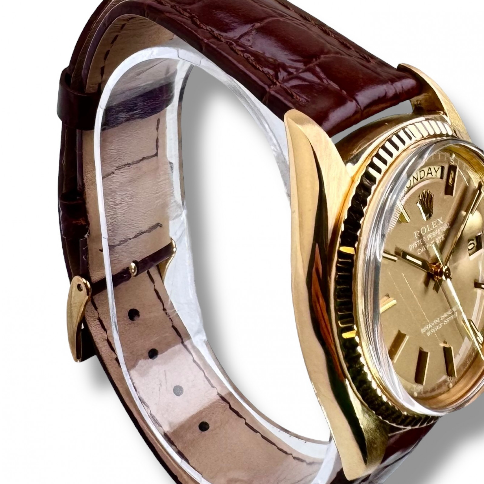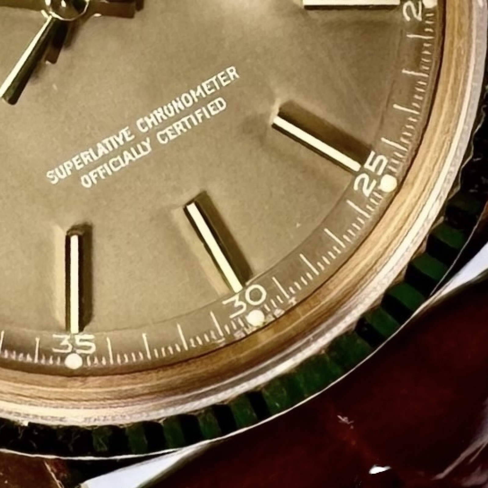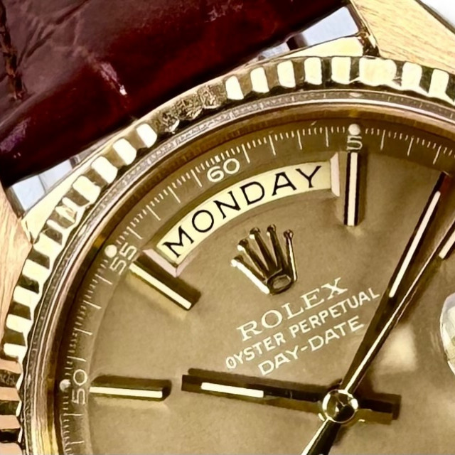 The Rolex 1803 also showcases an 18 karat gold Fluted bezel, a very iconic frame style that Rolex enthusiasts have come to admire. This exquisitely designed bezel adds a layer of sophistication to the watch, enhancing its timeless allure.