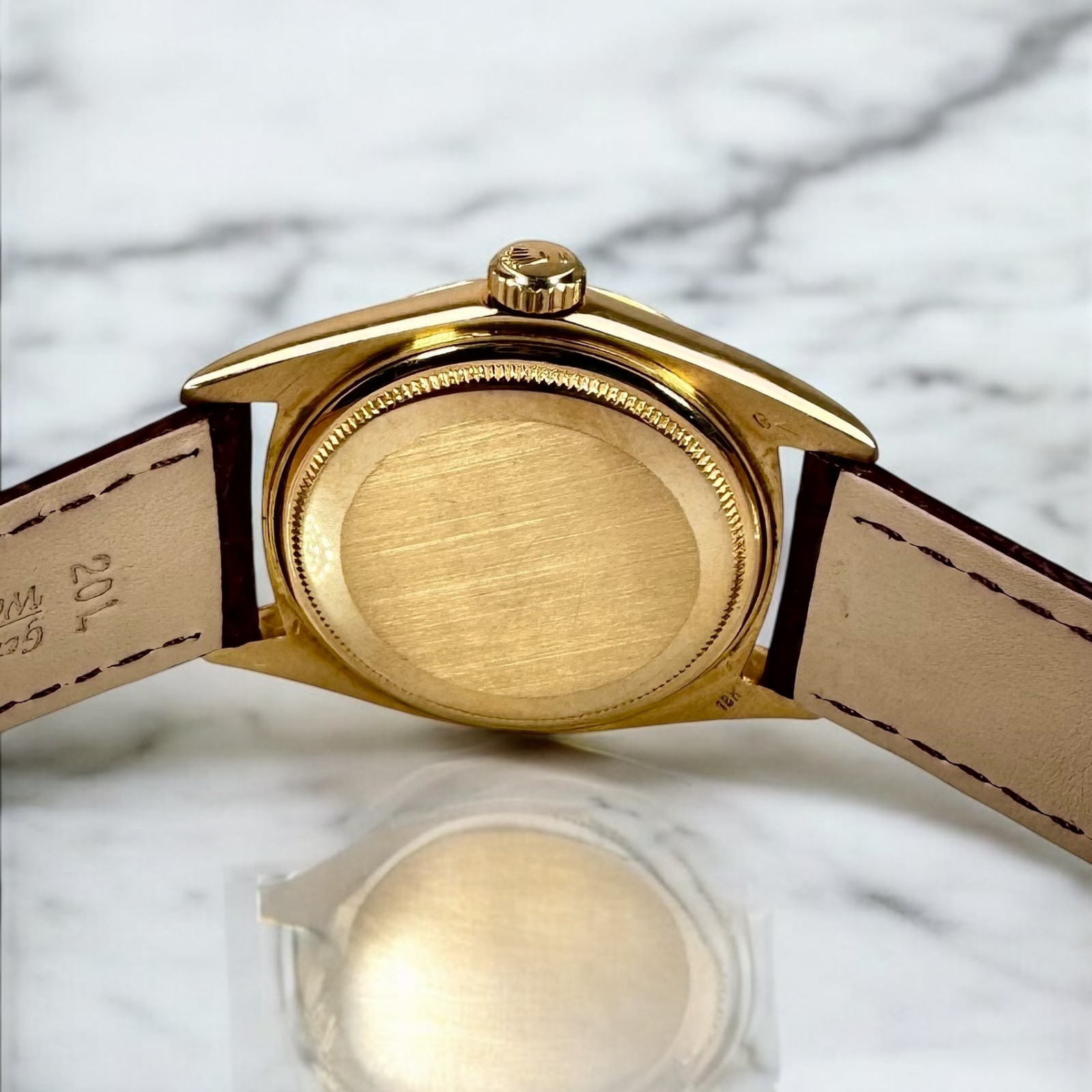 Encased in an 18 karat solid yellow gold, the watch's case measures 36 mm in diameter, offering a perfect balance between subtlety and prominence on the wrist. A testament to Rolex's expert craftsmanship, this classic model is crafted to endure, without compromising its eye-catching design.