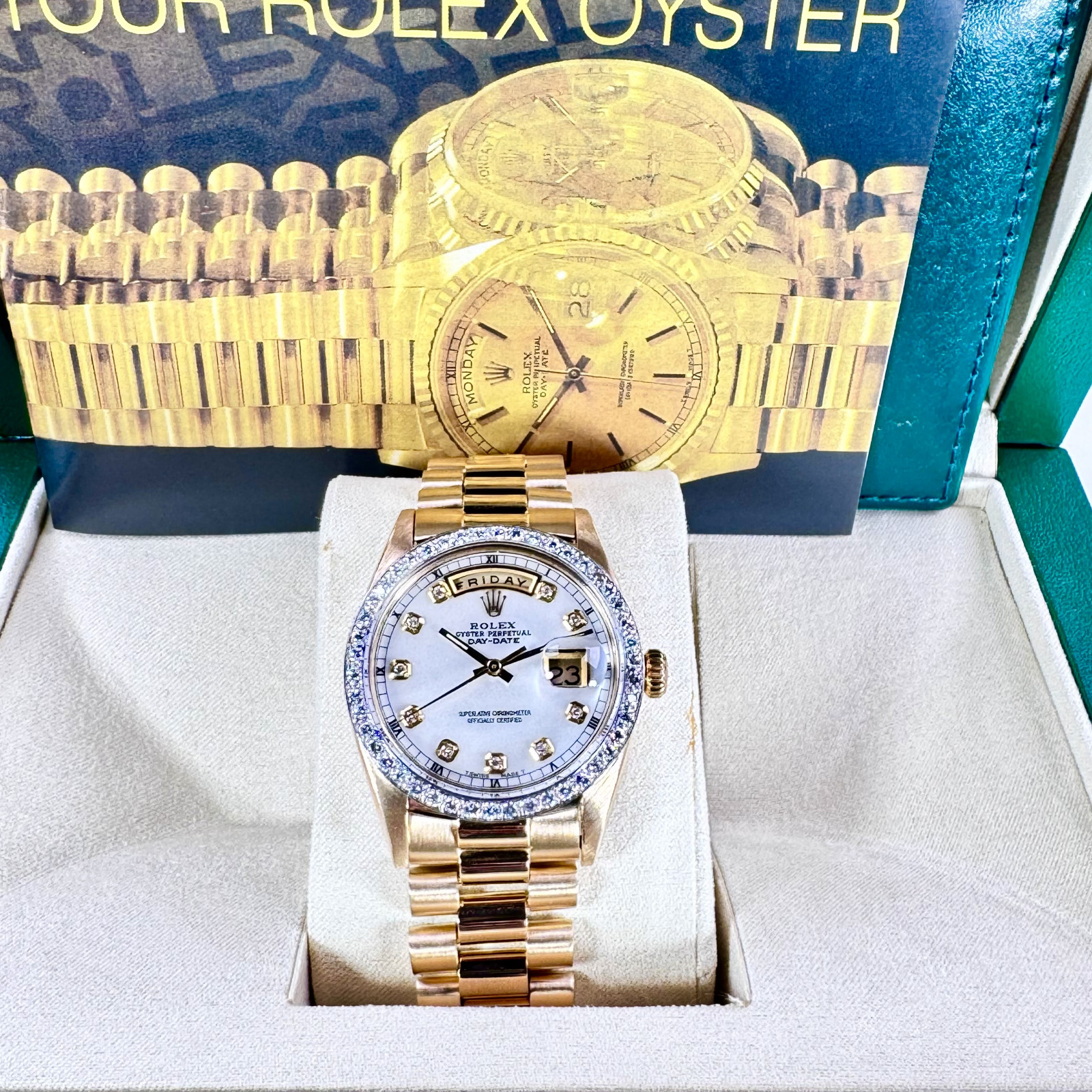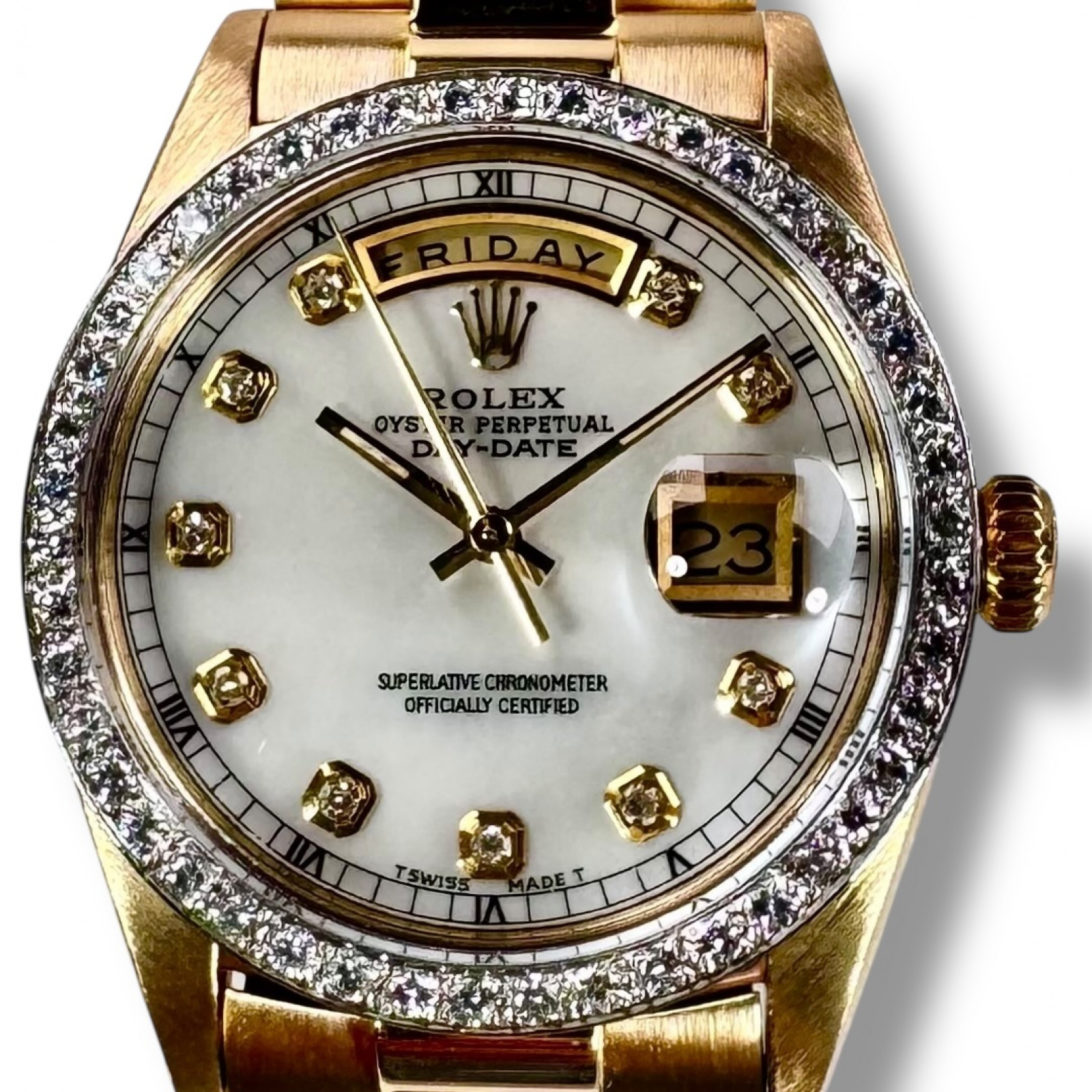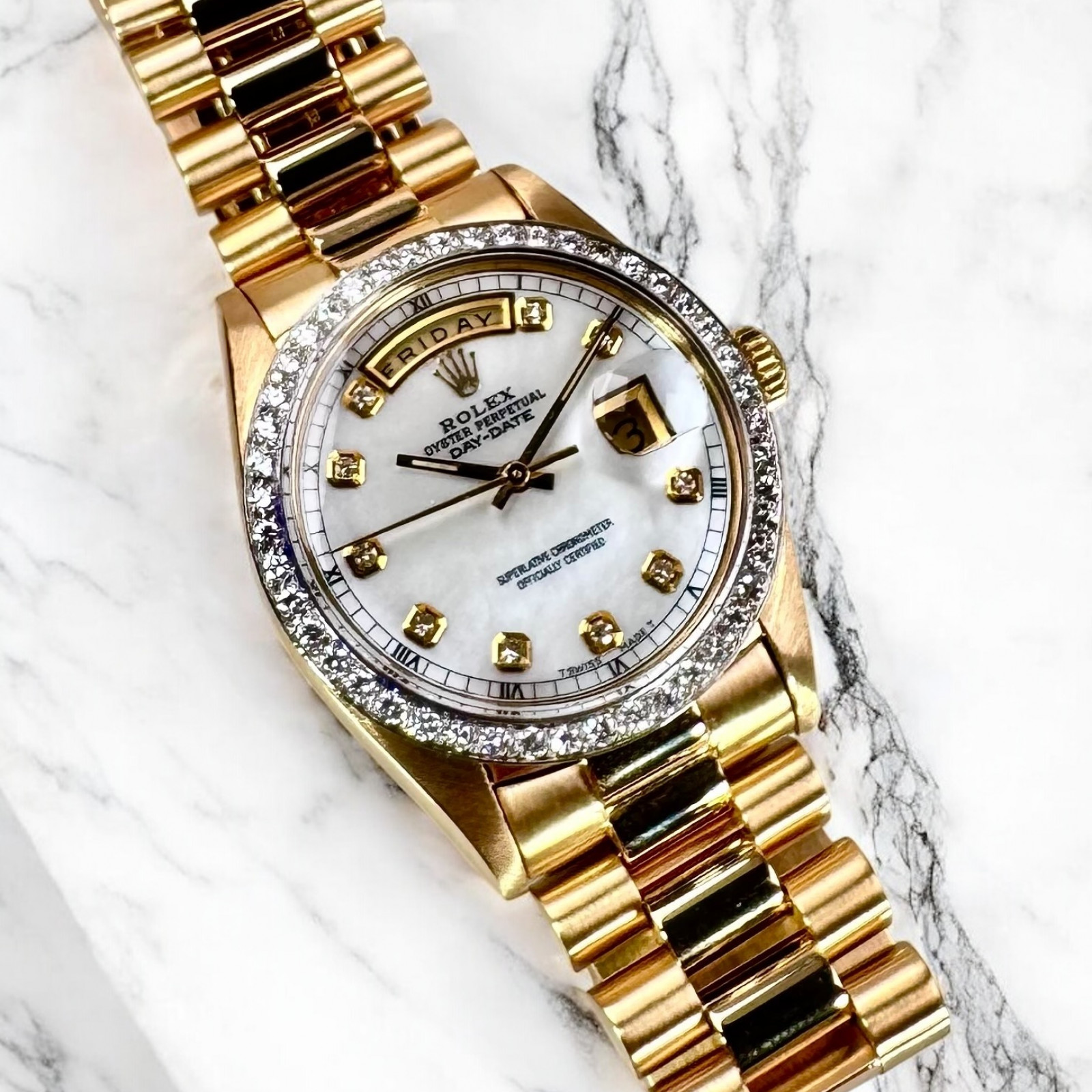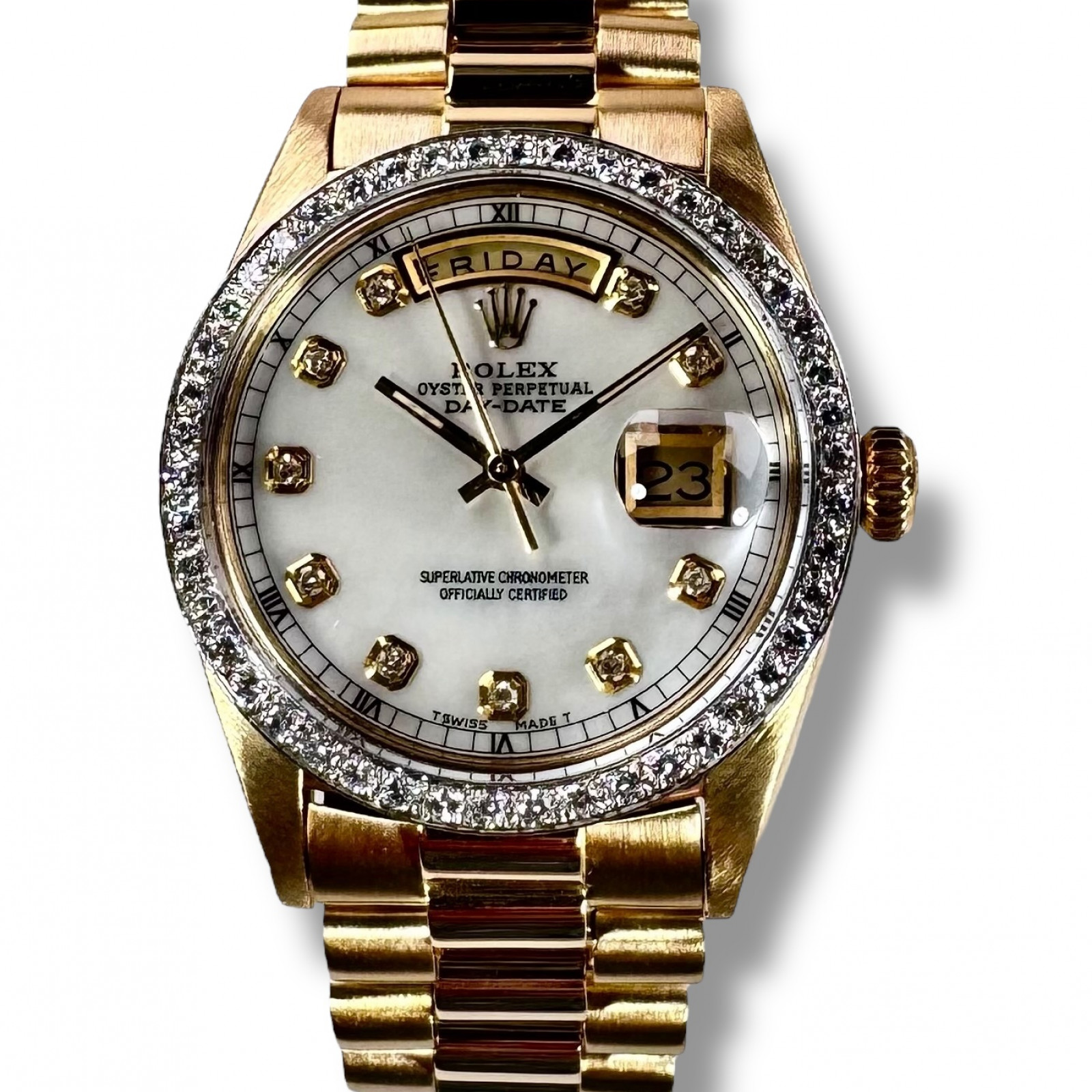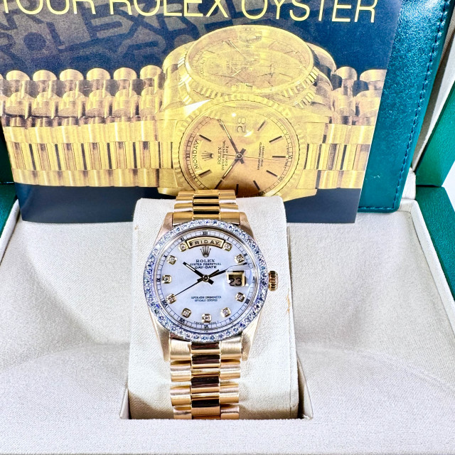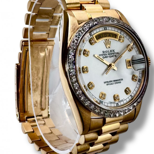 Beautifully encased in a professionally polished solid 18 karat gold frame with a masterfully crafted classic 36mm diameter, this breathtakingly magnificent watch serves as a sophisticated representation of Rolex’s painstaking artistry and distinctive opulence. Revered and coveted internationally, it boasts a personalized Diamond bezel and a magnificent Mother-of-Pearl (MOP) Diamond dial.