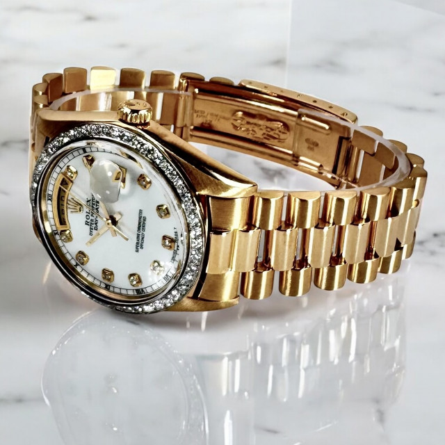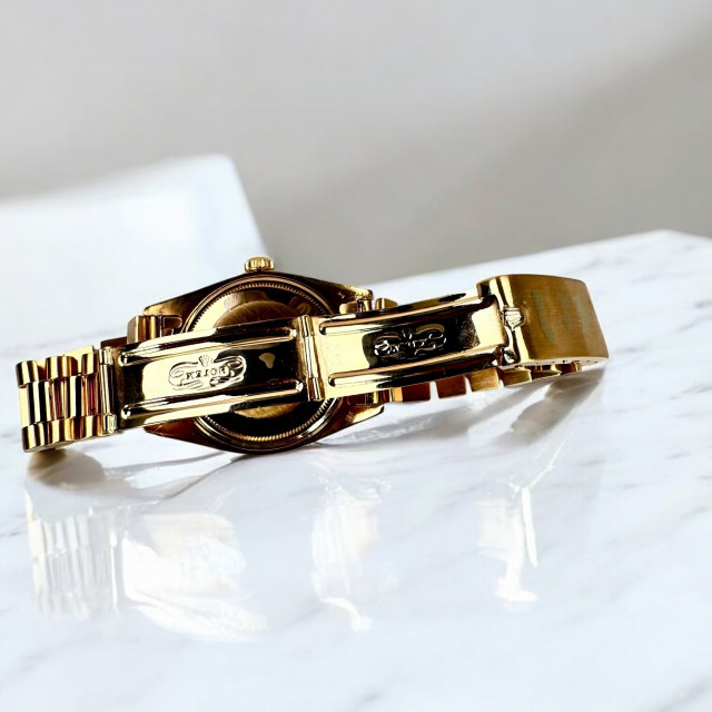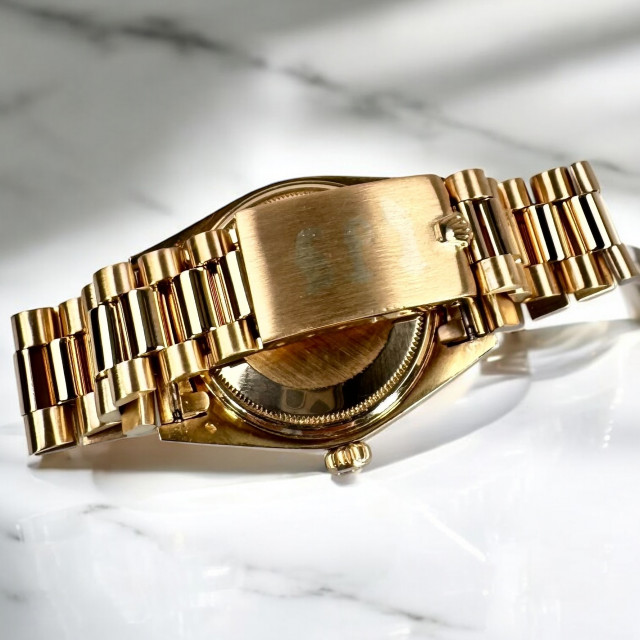 In conclusion, the Rolex 1803 President is a depiction of a striking fusion of unparalleled elegance, enriching historical relevance, and utilitarian brilliance. Nestled in its regal 18kt solid gold casing, buttressed by a robust 100-meter water resistance, fortified by the staunch sapphire crystal, and made irresistible by the gold fluted bezel, the Rolex 1803 etches a place of honour in the pantheon of horological masterpieces. This remarkable gem from the esteemed House of Rolex consistently mesmerizes its spectators, boldly asserting its pride of place as a timeless symbol of enduring allure that weathers the passing eras with admirable grace.