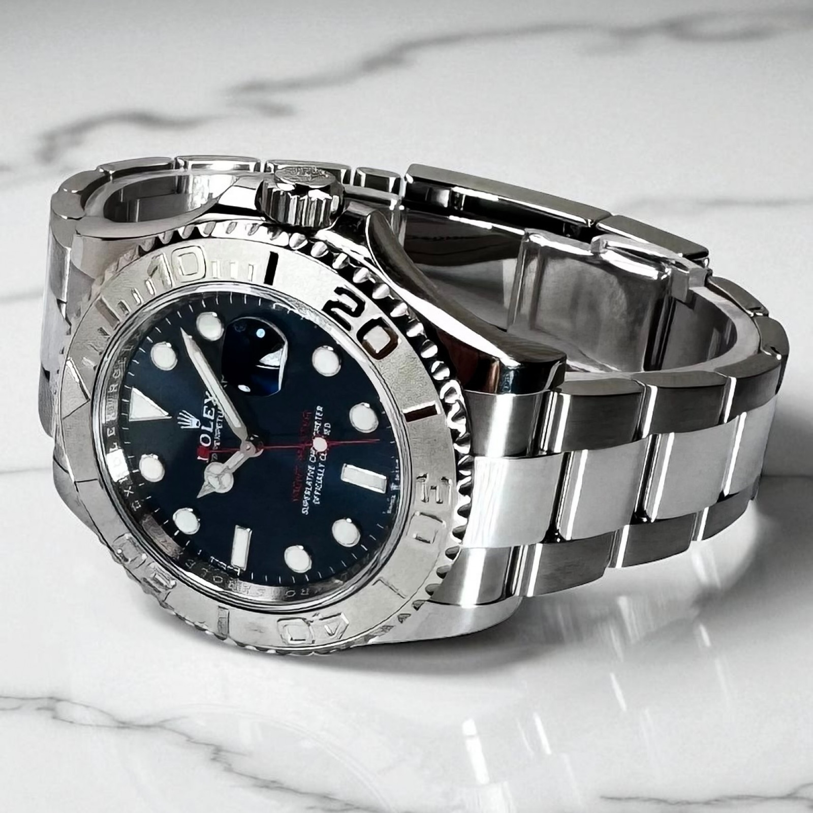 The Yacht-Master 126622 is an embodiment of refined taste and unique personality, marked by its distinctive blue dial. This vibrant dial color brilliantly contrasts with the sleek silver-tone of the watch, culminating in a breathtaking aesthetic profile that is a true attention magnet. Intricately woven into the dial's stunning facade design, this Rolex Yacht-Master is indeed an ultimate status symbol for the discerning connoisseur in pursuit of distinction and uniqueness.