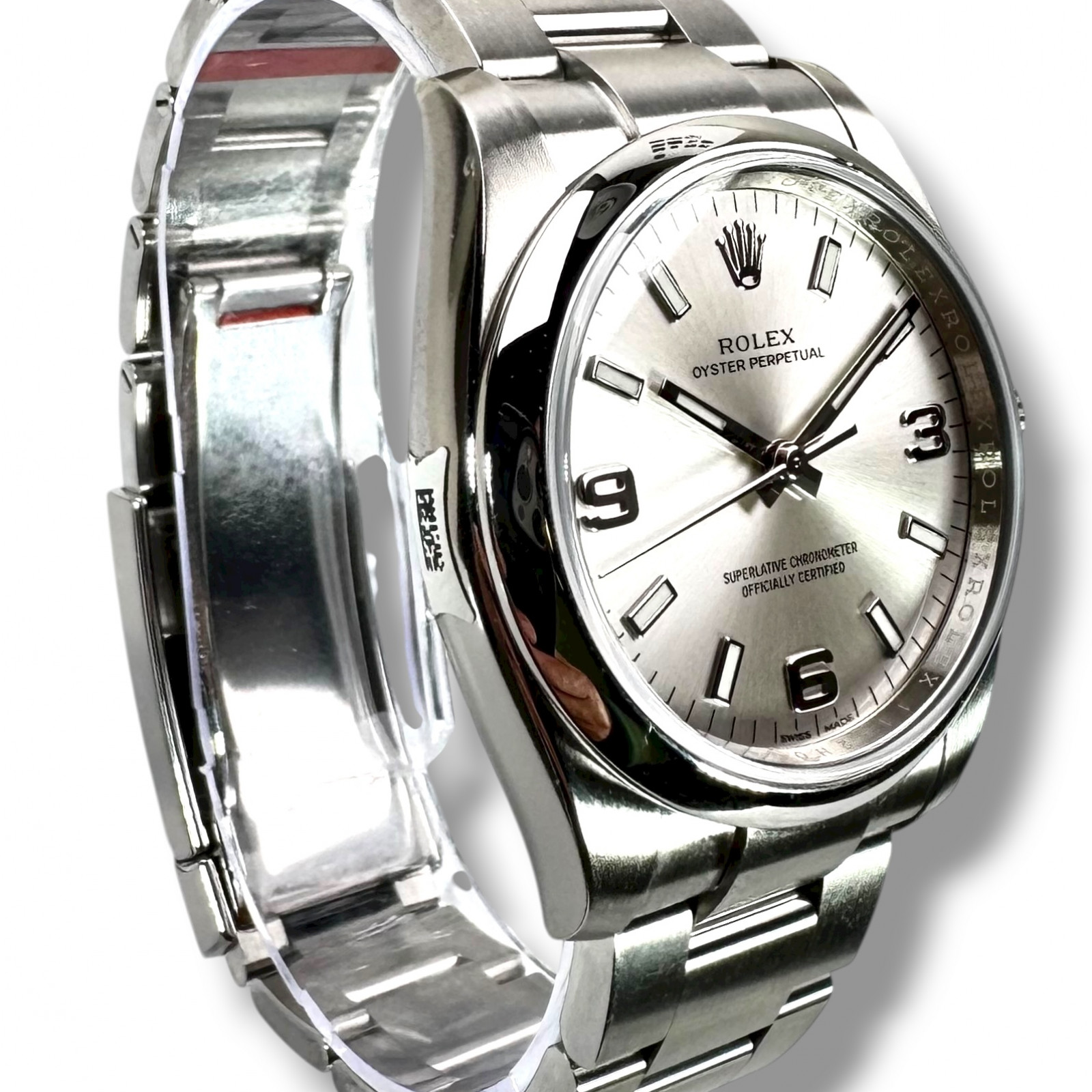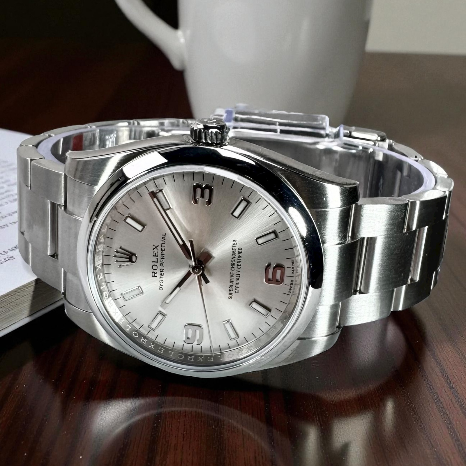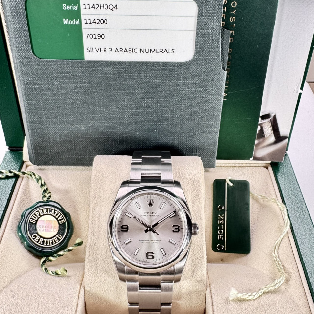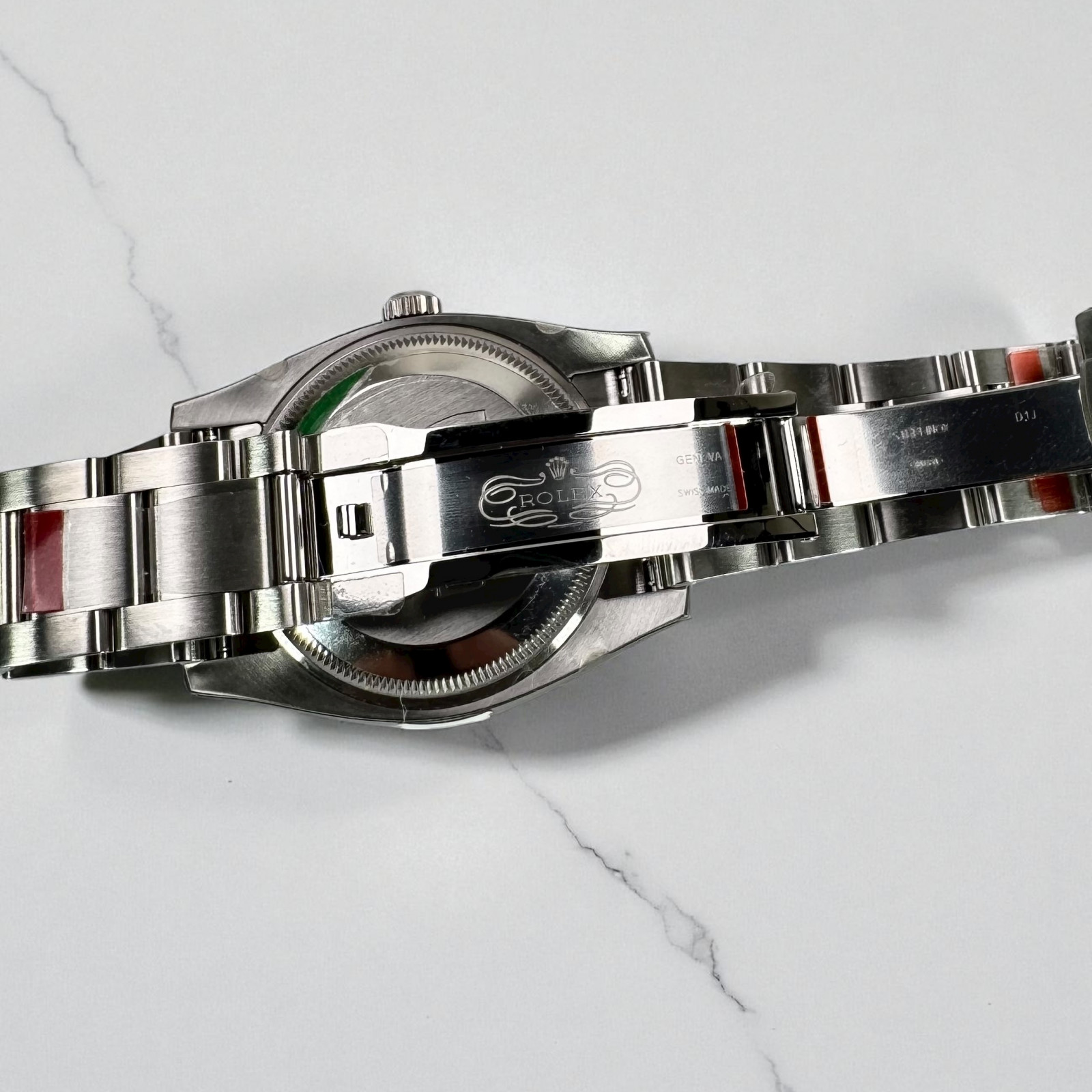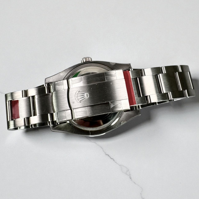 Underneath its sturdy and flawlessly polished exterior, the Oyster Perpetual 114200 operates with the reliable Caliber 3130 movement. This automatic, self-winding movement was exclusively developed by Rolex, reputed for its exceptional precision, reliability, and resilience, making it an excellent choice for the discerning watch collector.