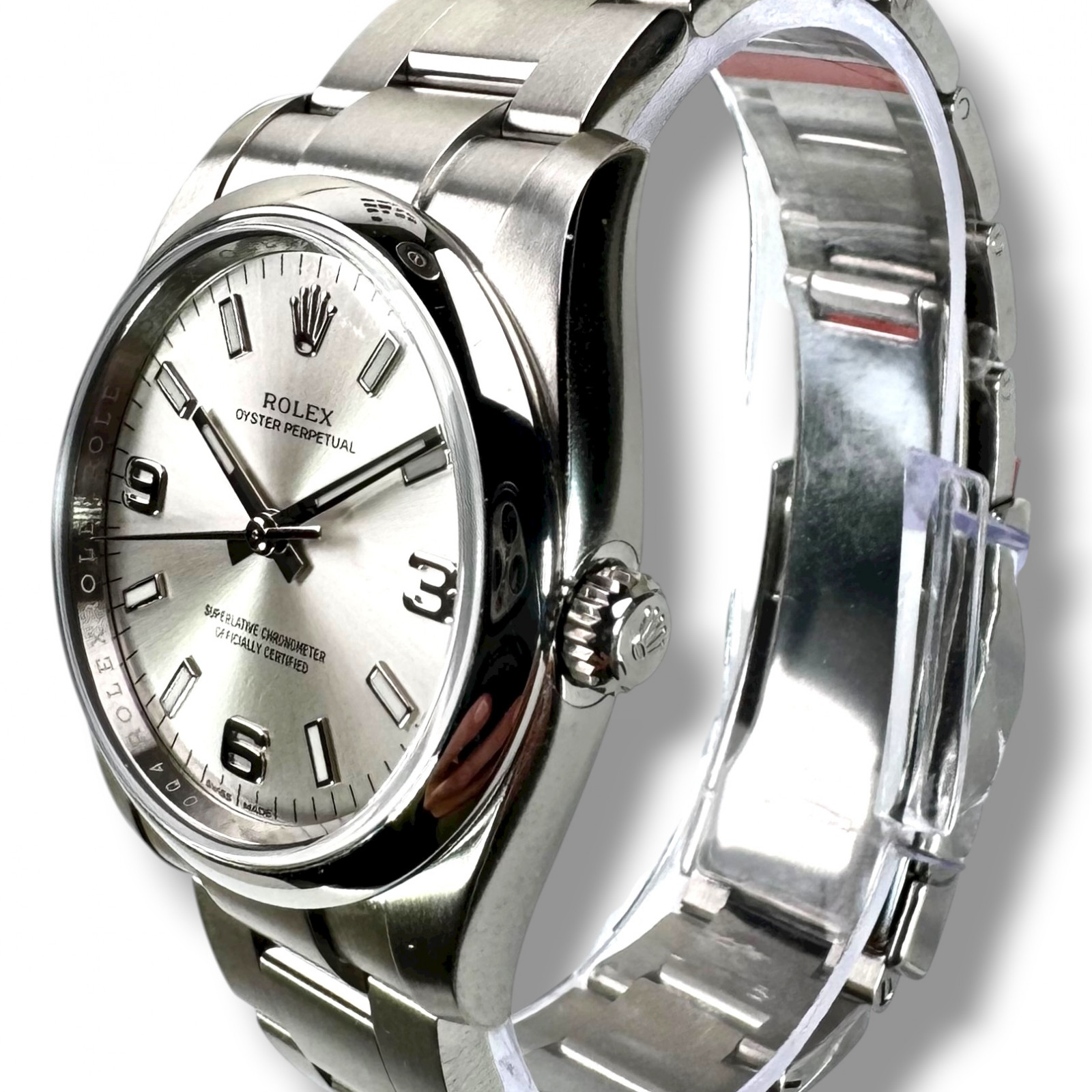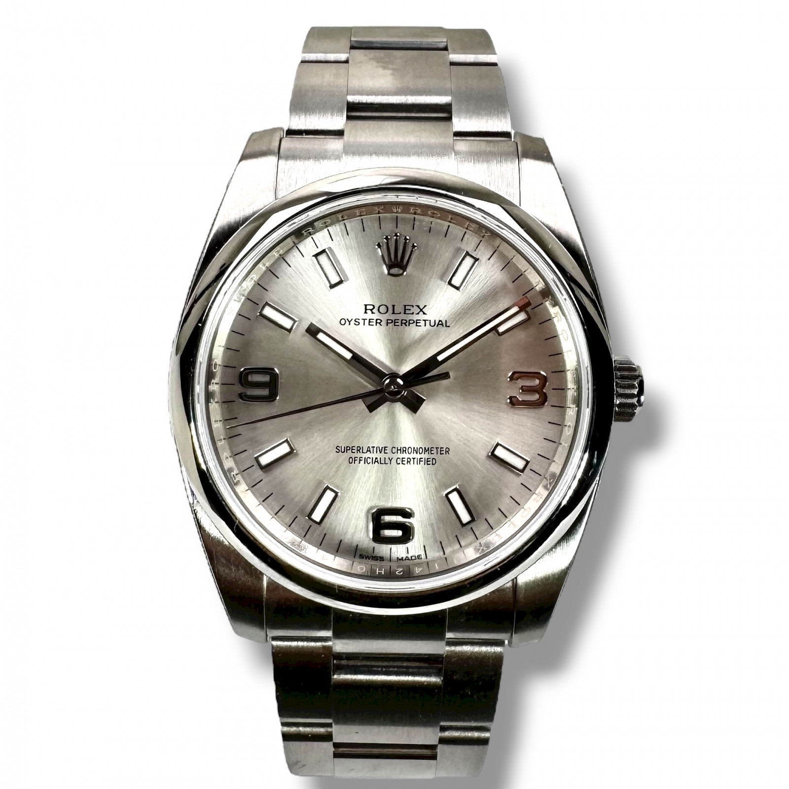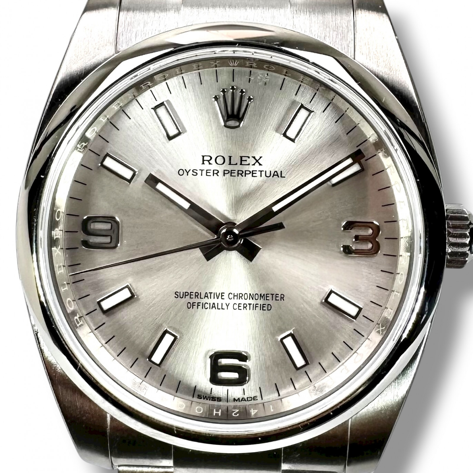 Underneath its sturdy and flawlessly polished exterior, the Oyster Perpetual 114200 operates with the reliable Caliber 3130 movement. This automatic, self-winding movement was exclusively developed by Rolex, reputed for its exceptional precision, reliability, and resilience, making it an excellent choice for the discerning watch collector.