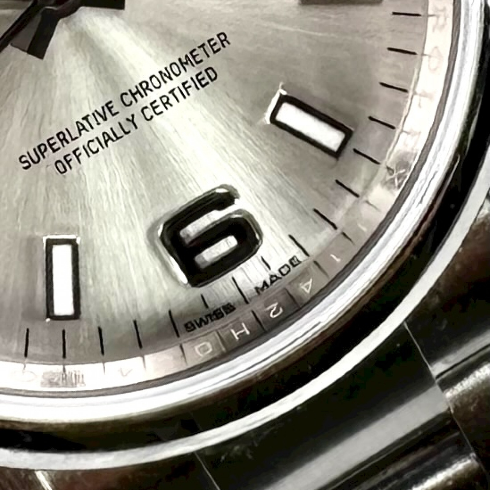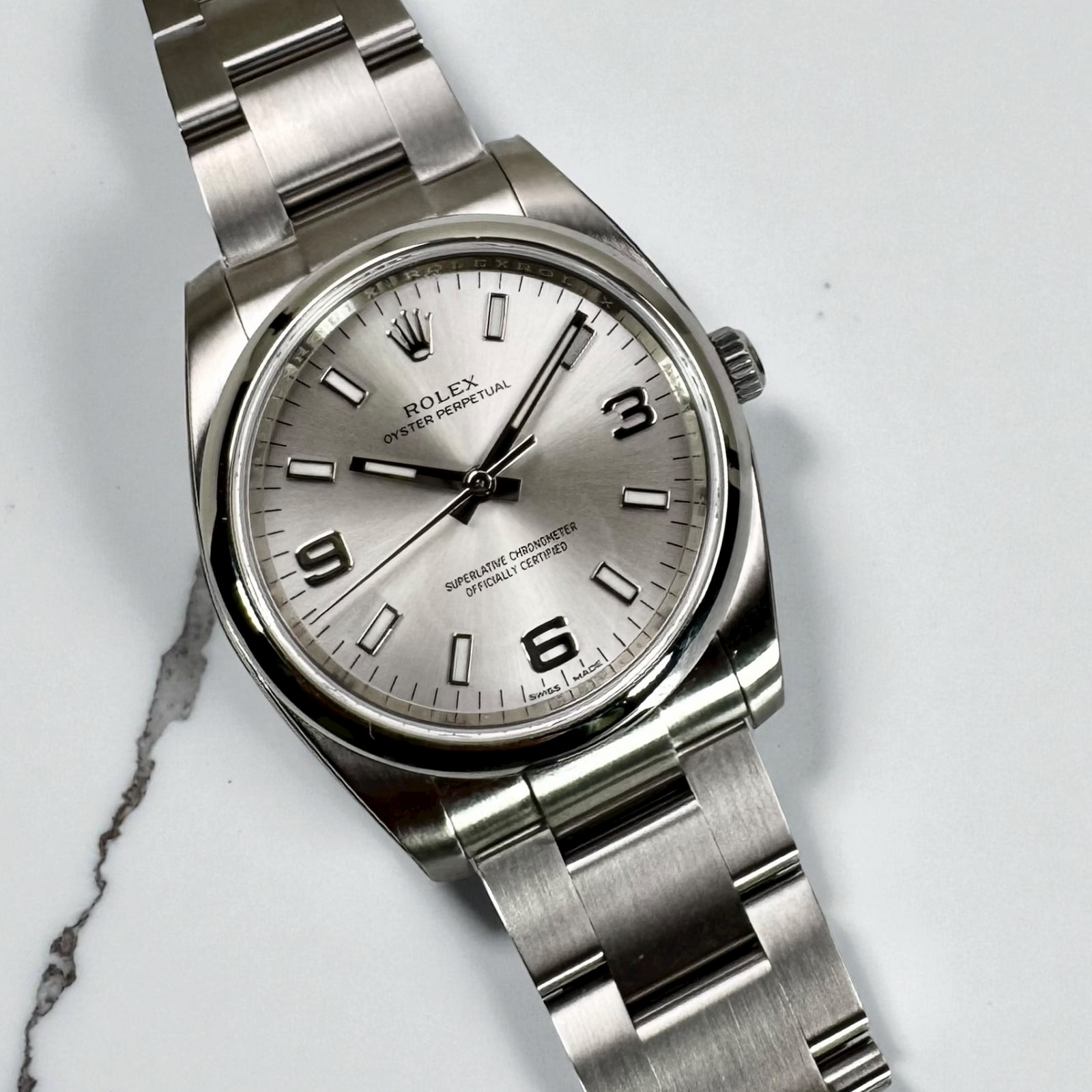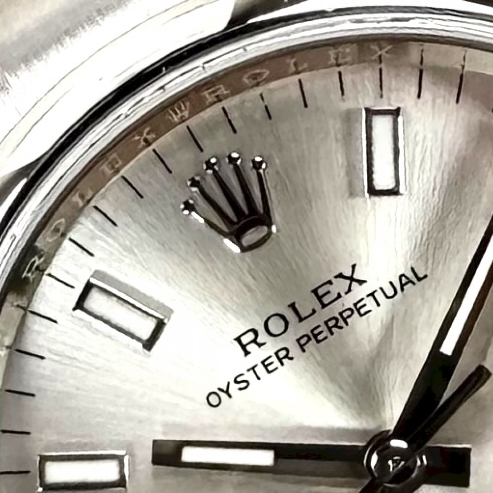 The dial of the Oyster Perpetual 114200 presents an added layer of class with its shimmering silver finish. This selection enhances the visibility of the watch hands and markers, and allows the wearer to check time swiftly and effortlessly, while also adding a touch of sophistication to the overall design.