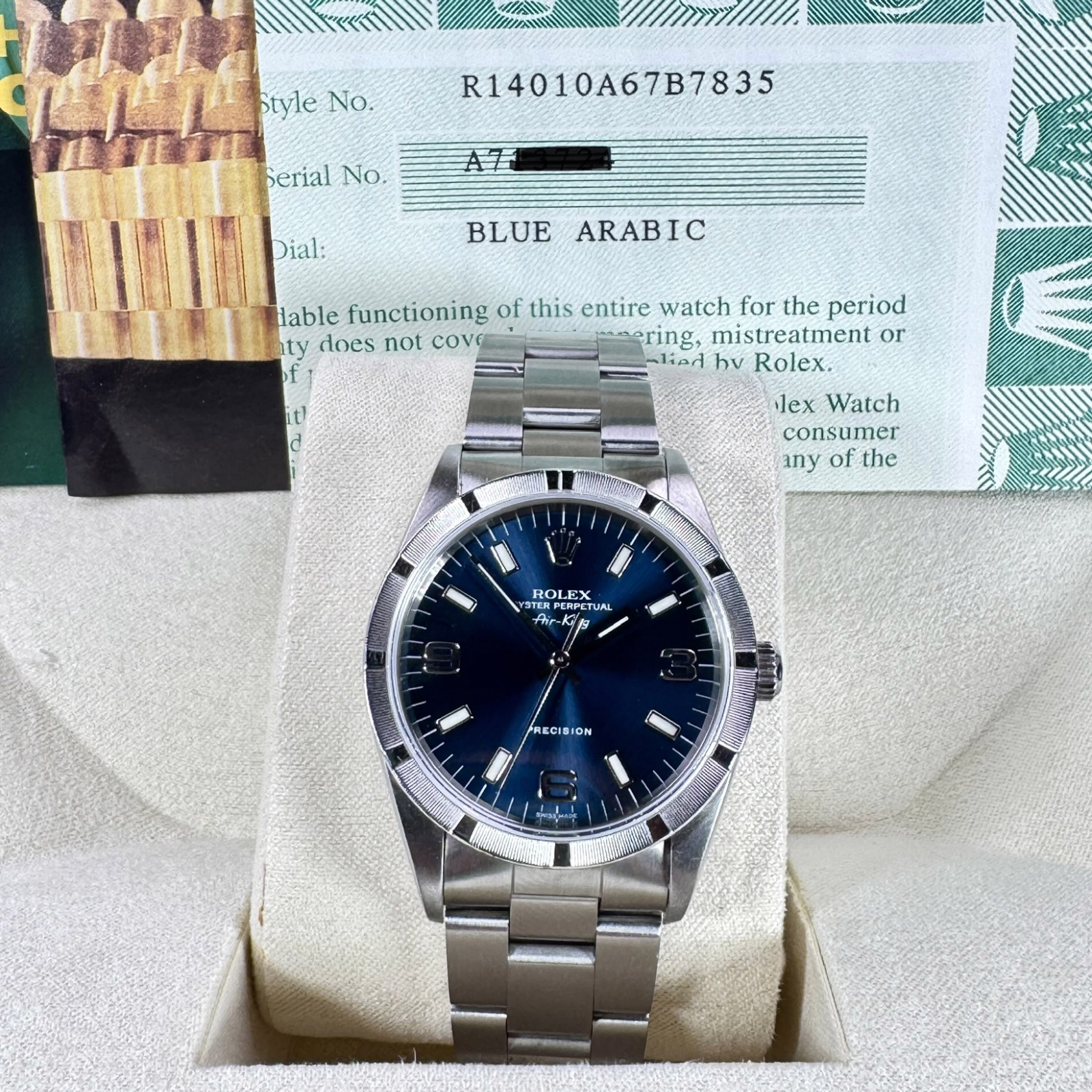 This particular 2001 model of the Rolex Reference 14010 Air King comes with accompanying papers effectively validating the authenticity of the timepiece. These papers are a crucial aspect for collectors worldwide, contributing significantly to the after-market value of the piece.