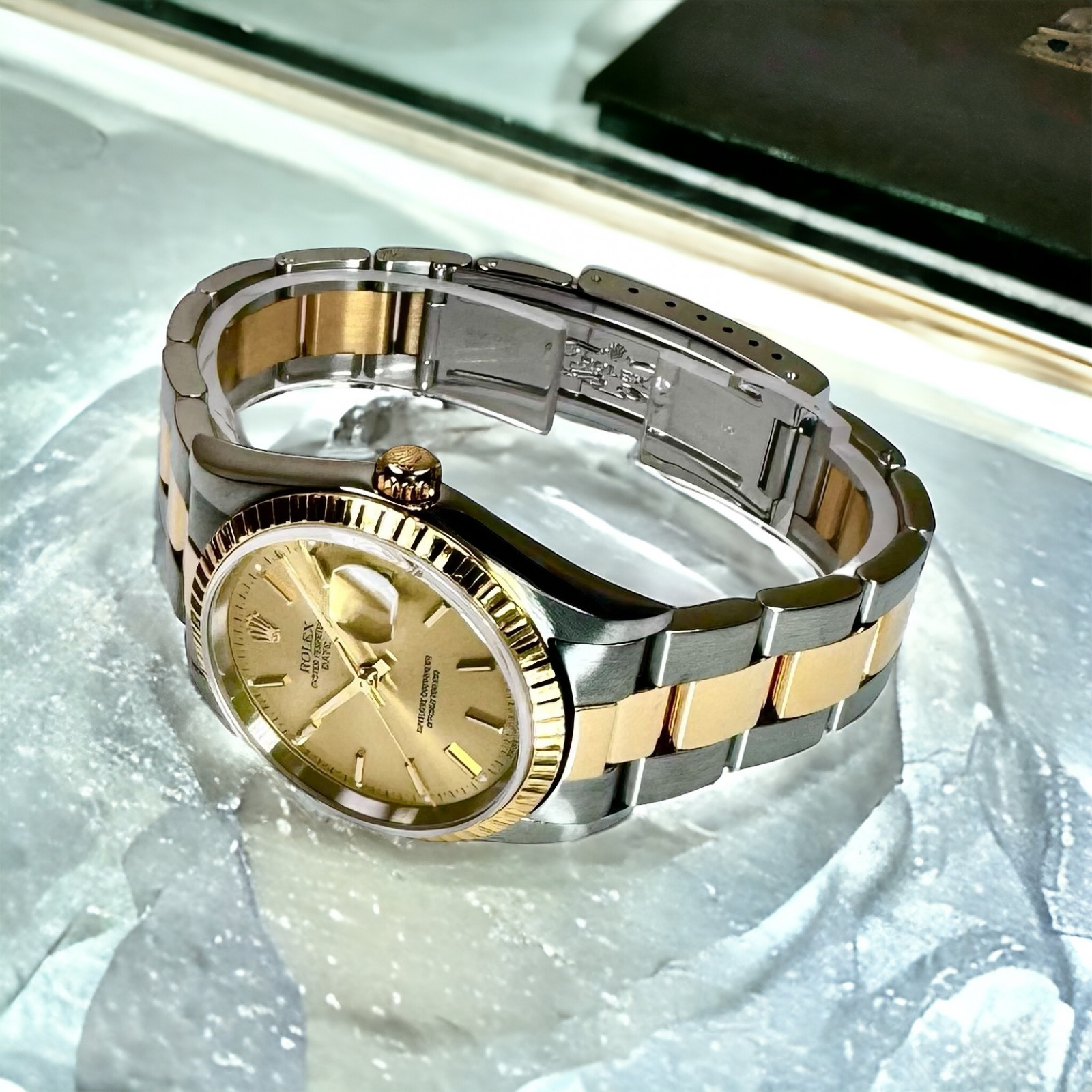 Setting the Rolex 15223 apart from its compatriots is the meticulously crafted 18 KT gold bezel. Engineered to demonstrate precise workmanship, the engine-turned bezel flaunts a unique character, a feature immensely esteemed by connoisseurs.