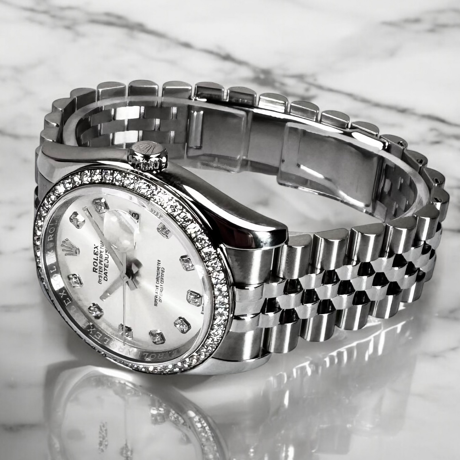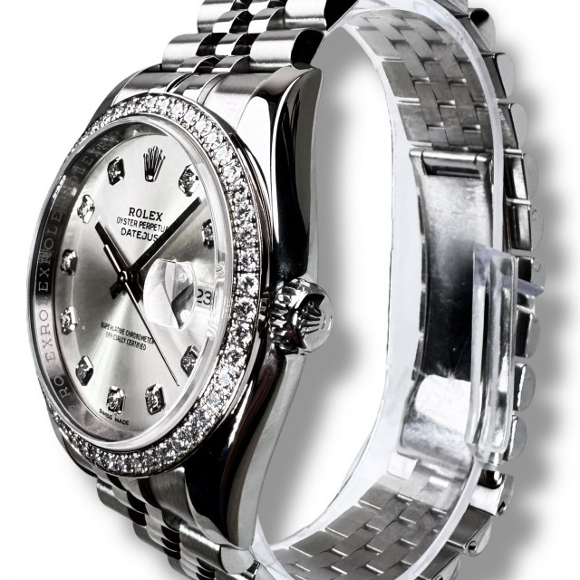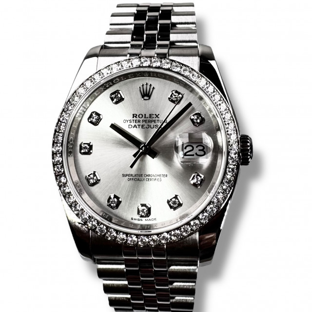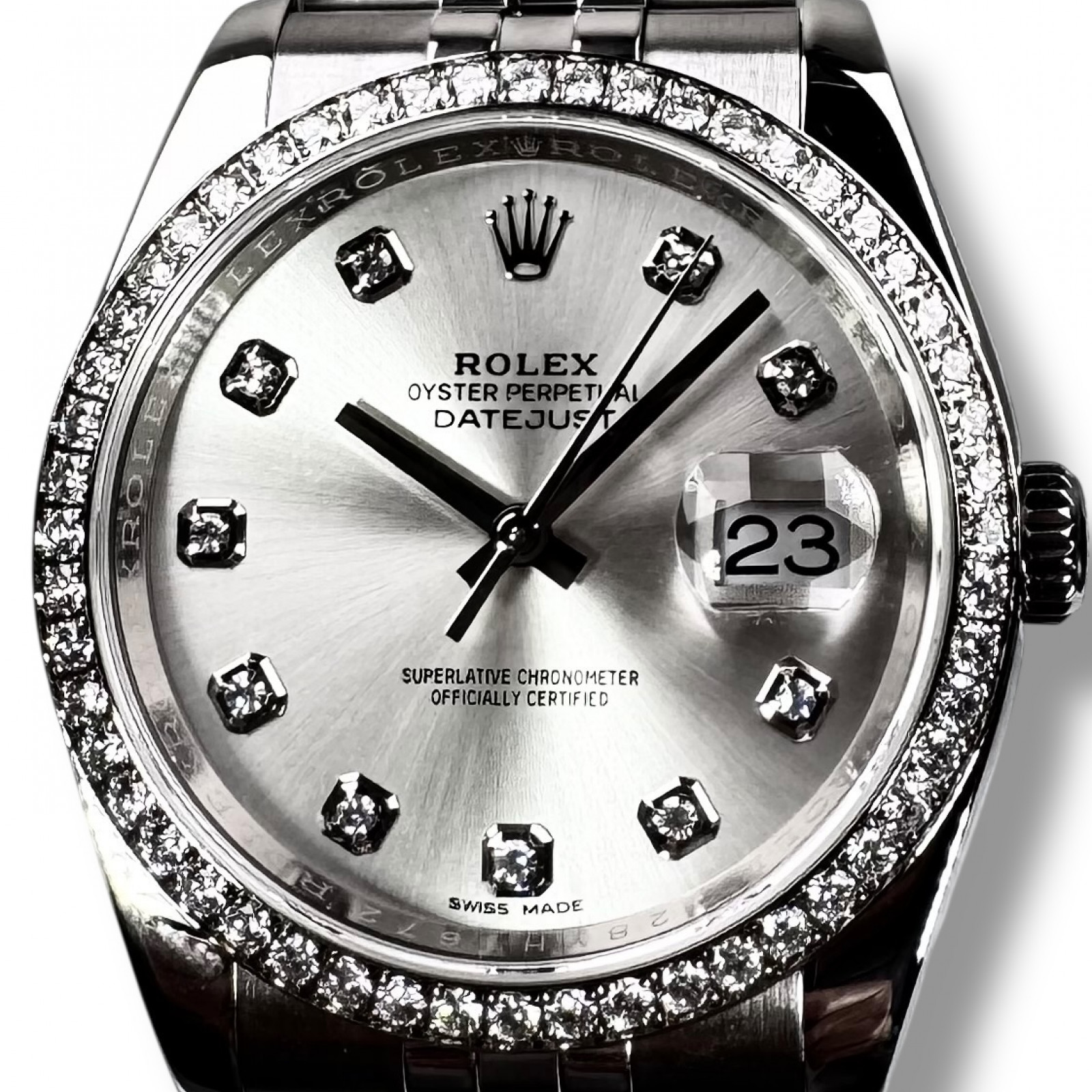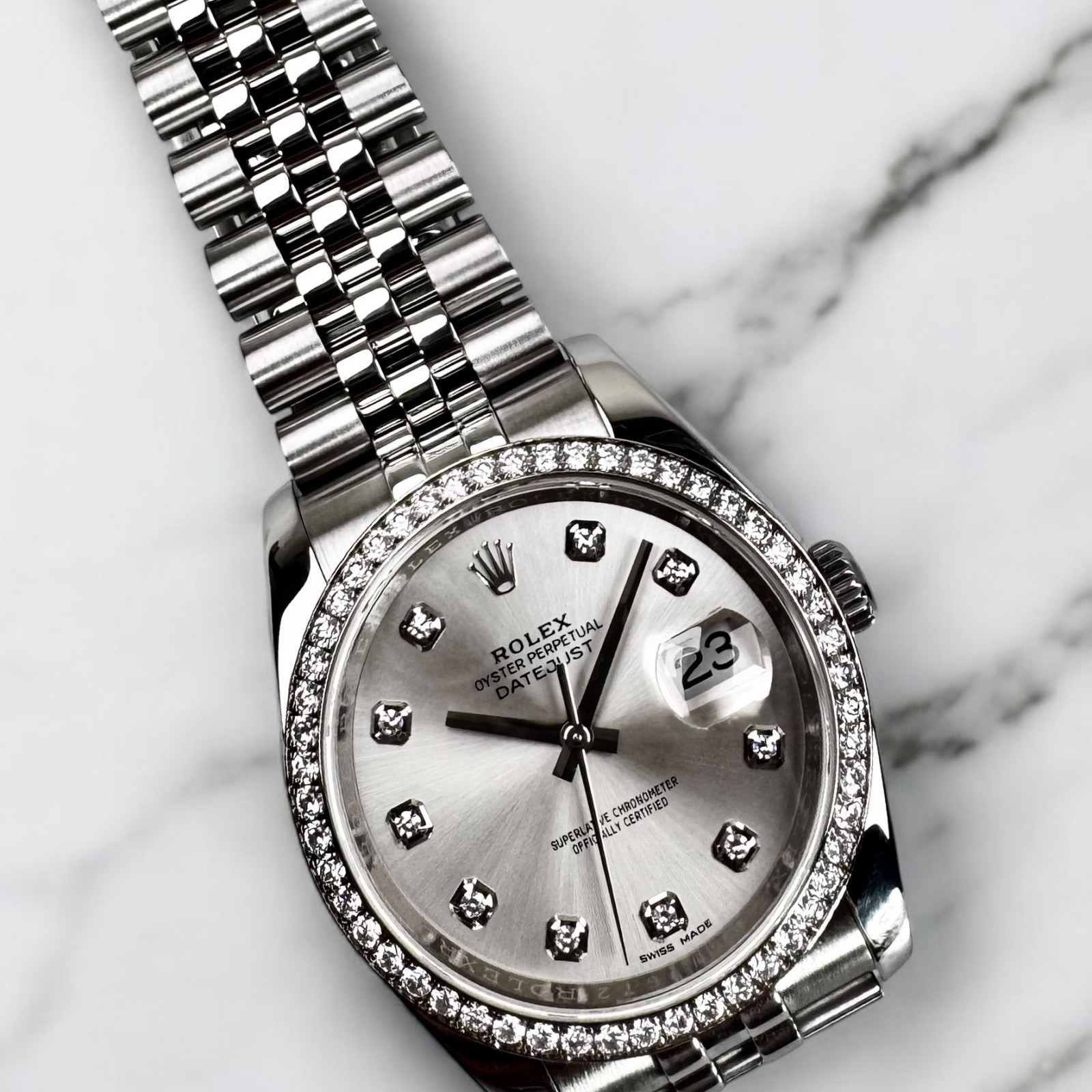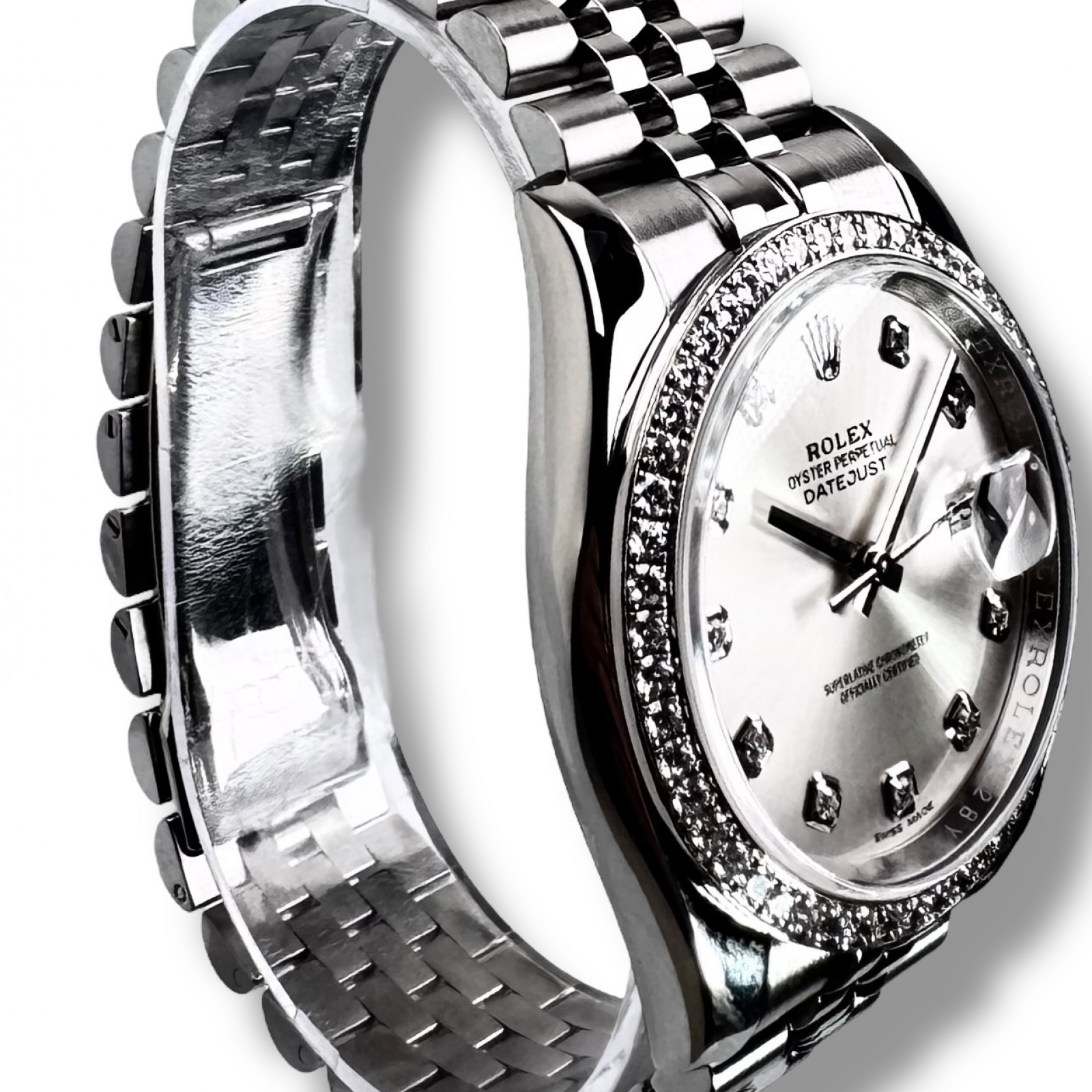 With the Rolex Datejust 116244, you can expect an exceptional automatic movement with a unique hand-finished quality. This model is highlighted by its 18kt white gold fluted bezel and features a sleek 36mm stainless steel case, complemented by a beautiful silver dial adorned with radiant diamond hour markers that glisten in any light.