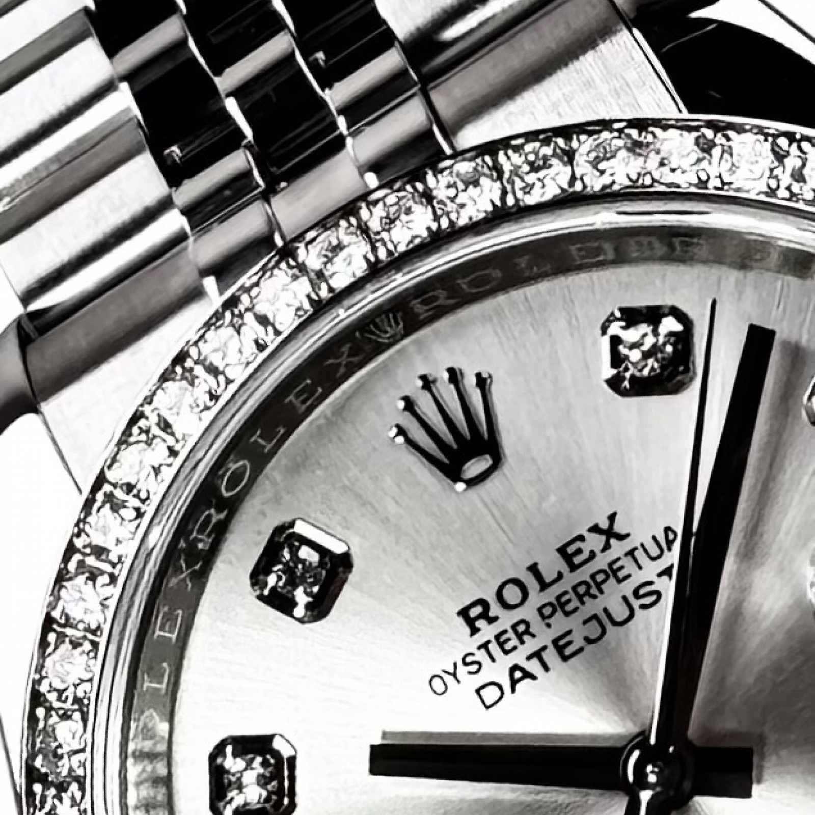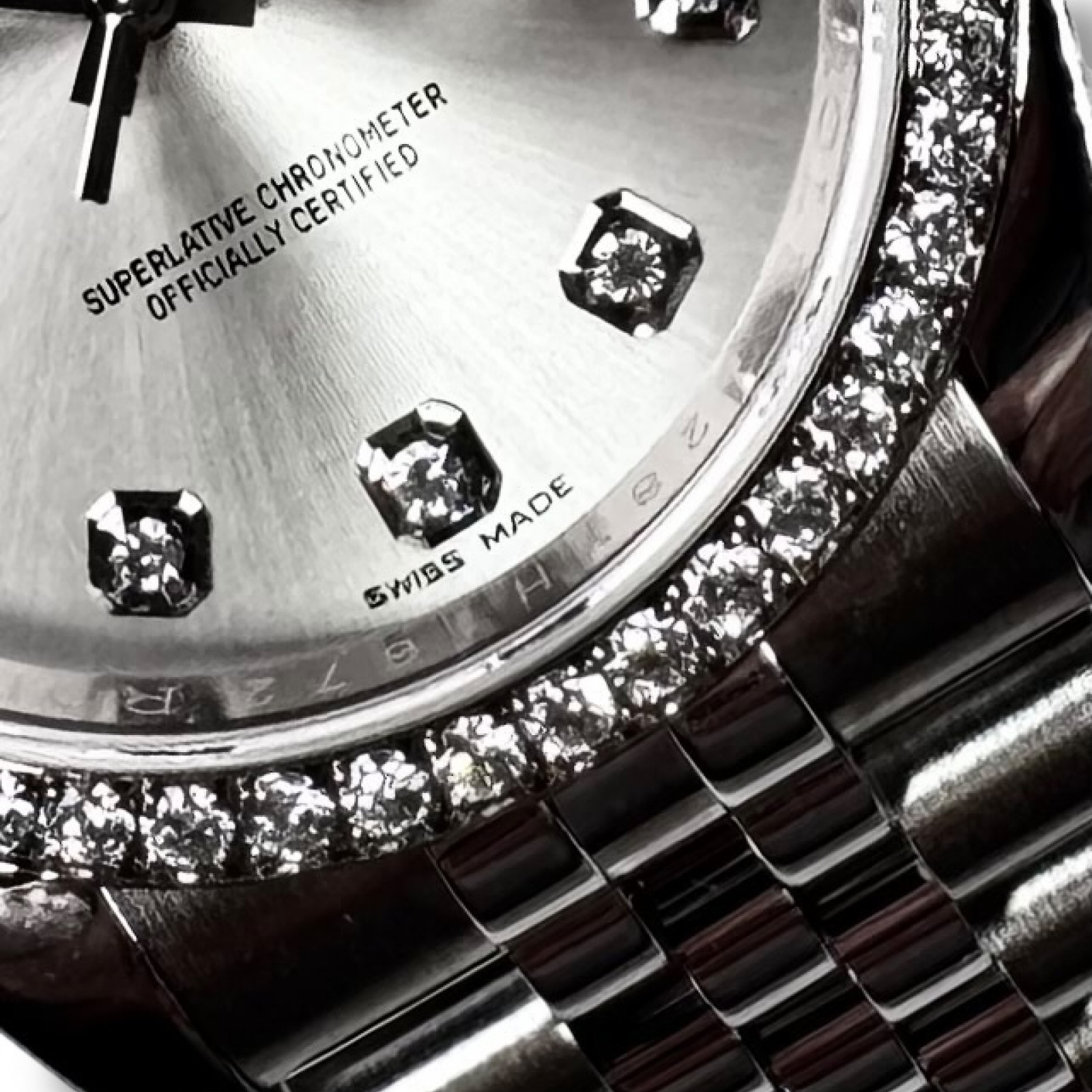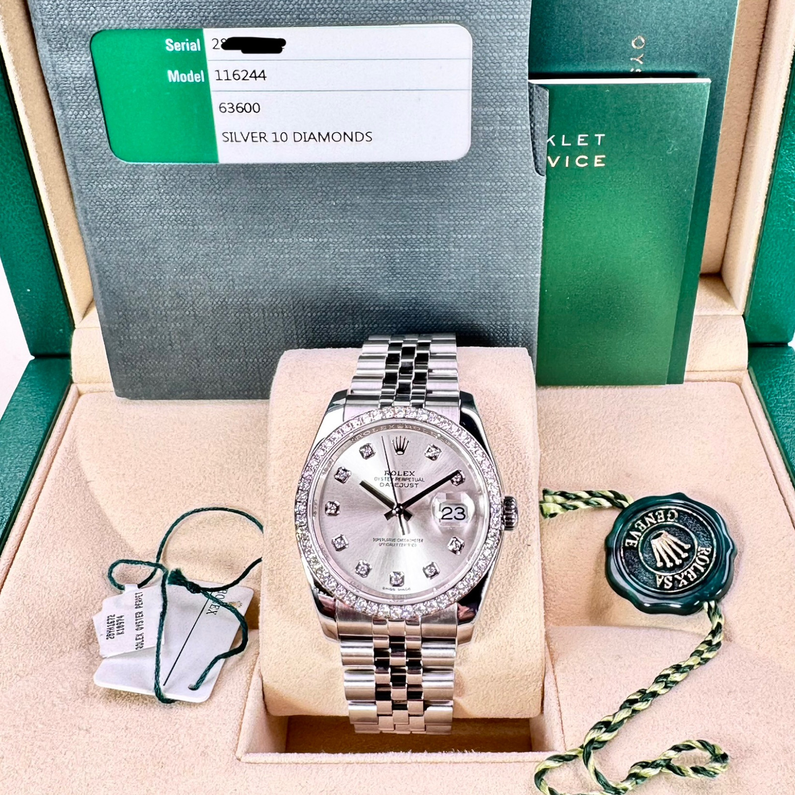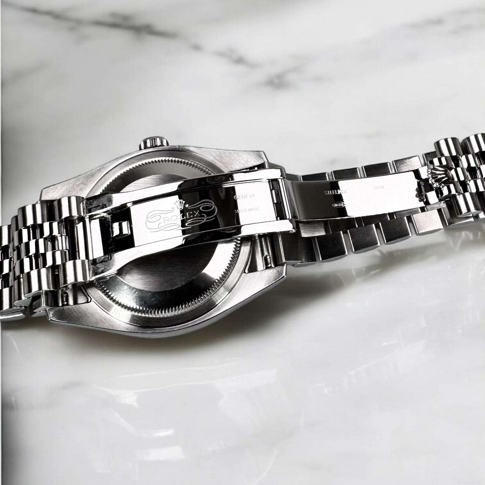 With the Rolex Datejust 116244, you can expect an exceptional automatic movement with a unique hand-finished quality. This model is highlighted by its 18kt white gold fluted bezel and features a sleek 36mm stainless steel case, complemented by a beautiful silver dial adorned with radiant diamond hour markers that glisten in any light.