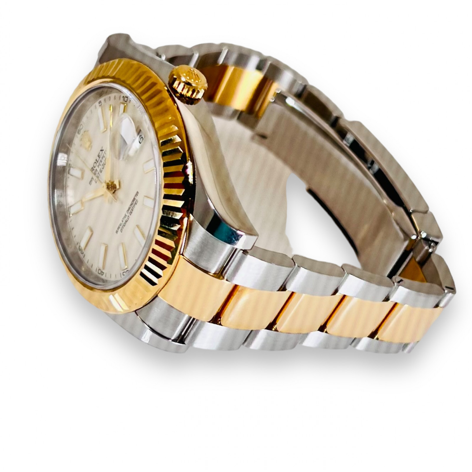 The Datejust 116333 model comes with a robust and sizeable 41 mm stainless steel case that offers durability with an edge of sophistication. The case is complemented seamlessly by the 18 kt gold fluted bezel. The fluted bezel adds a touch of grandeur and luxury, creating a captivating contrast against the smooth, polished finish of the stainless steel case.