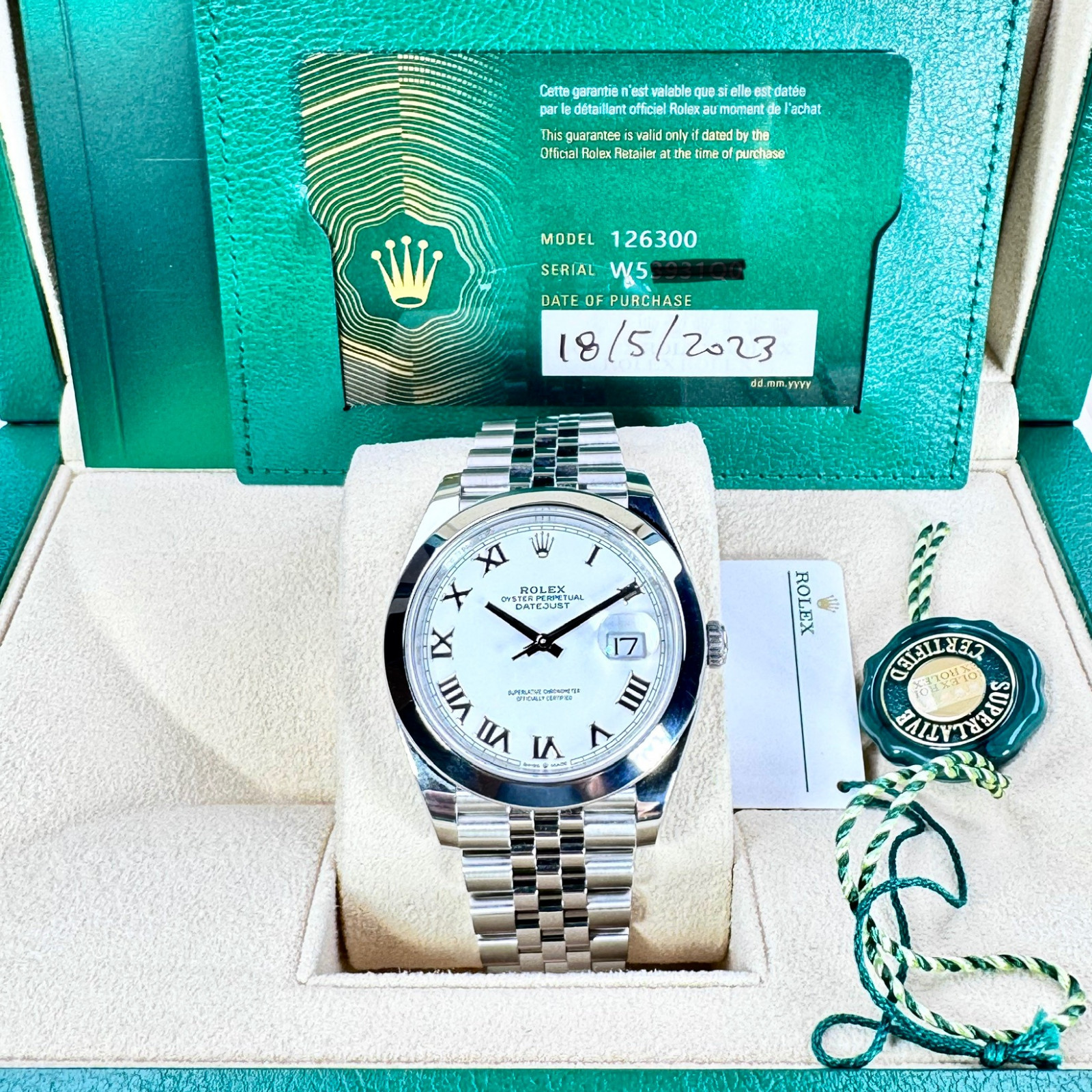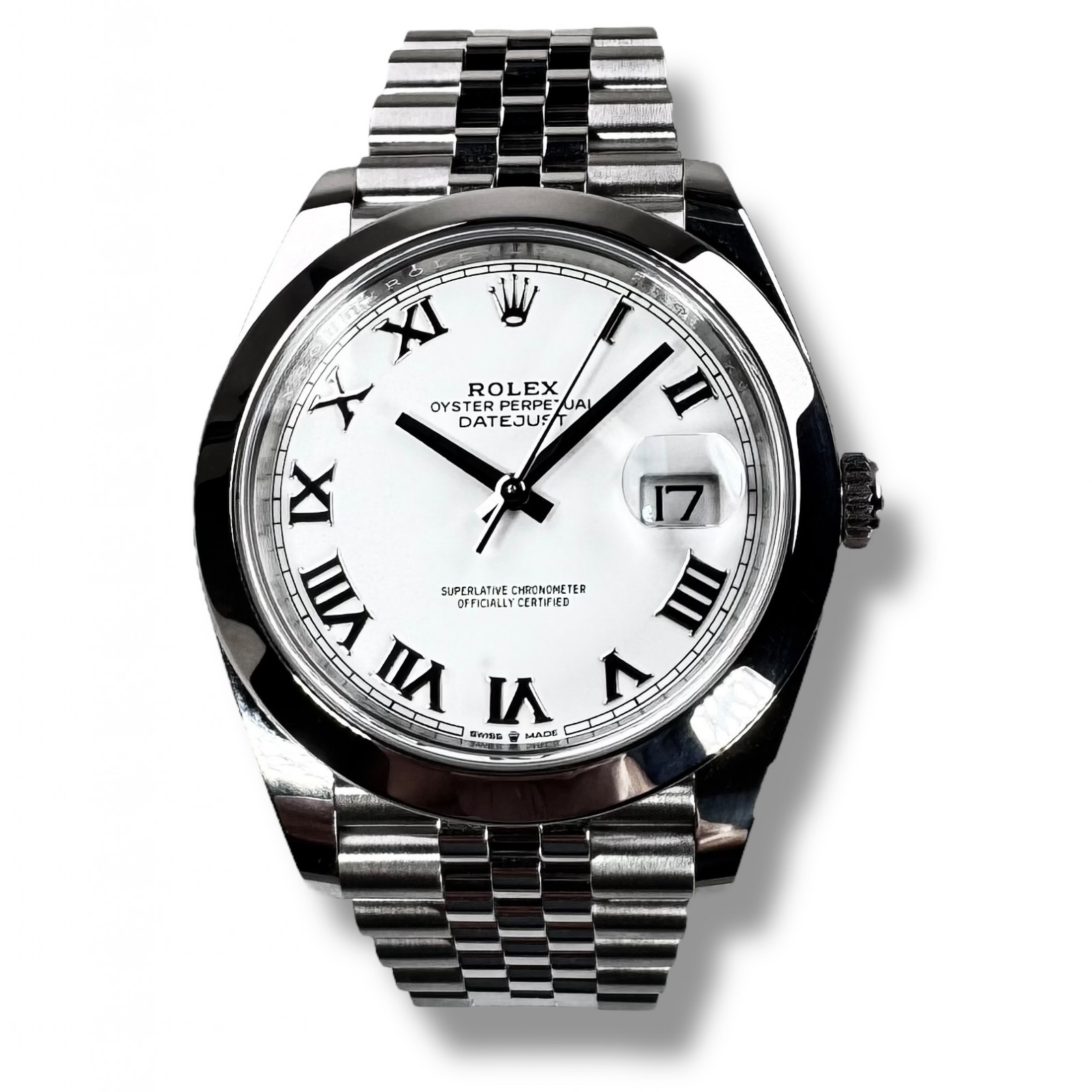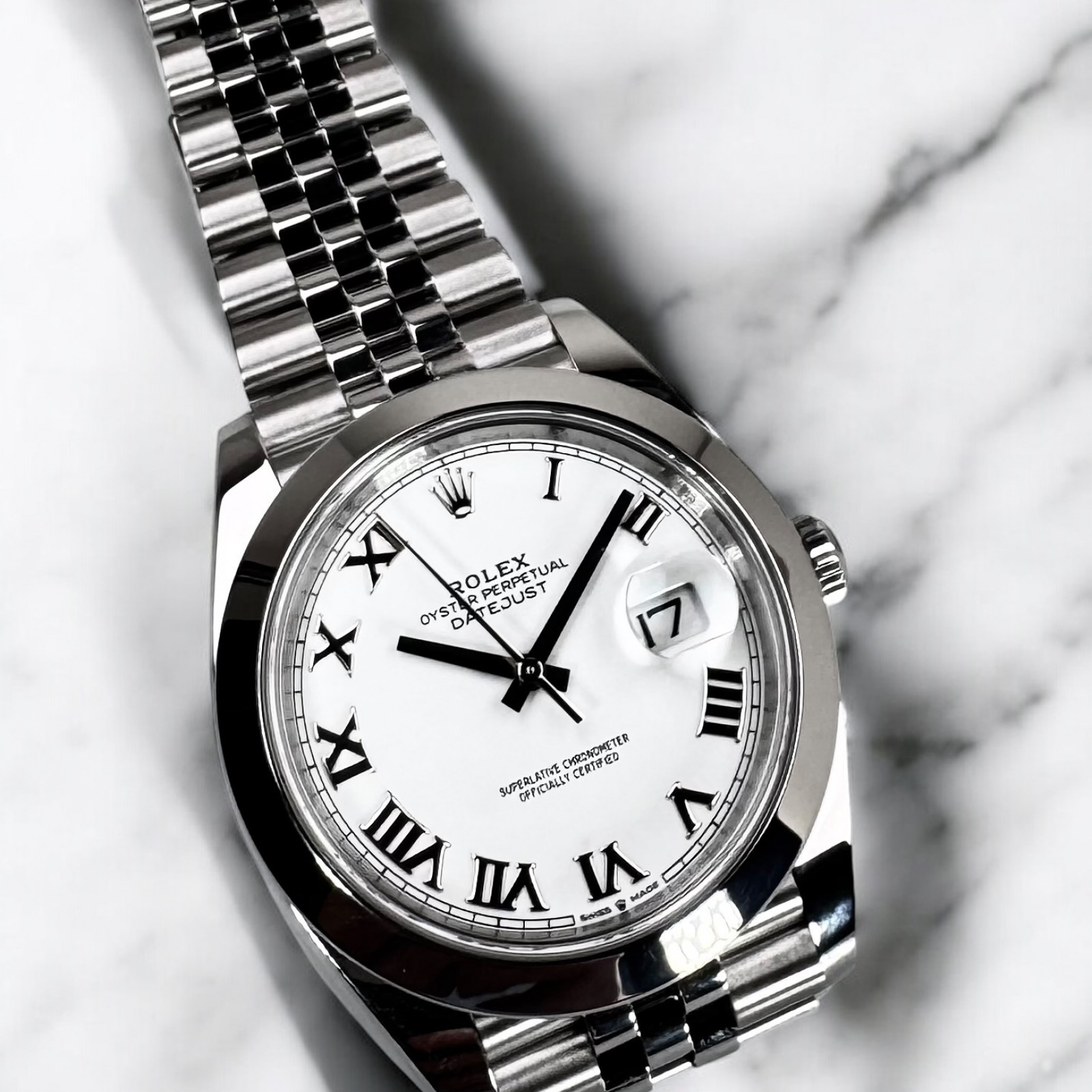 Experience unparalleled elegance and trailblazing performance in the exquisite Rolex Datejust 41 126300, a contemporary horological masterpiece that boasts a radiant white dial, projecting an aura of striking sophistication. First manufactured in 2023, this pristine timekeeper stands as a gleaming beacon, illuminating the prestigious legacy of the coveted Datejust collection. This remarkable timepiece masterfully marries the meticulous precision of traditional craftsmanship with high-tech advancements, resulting in a design that leaves an indelible impression.