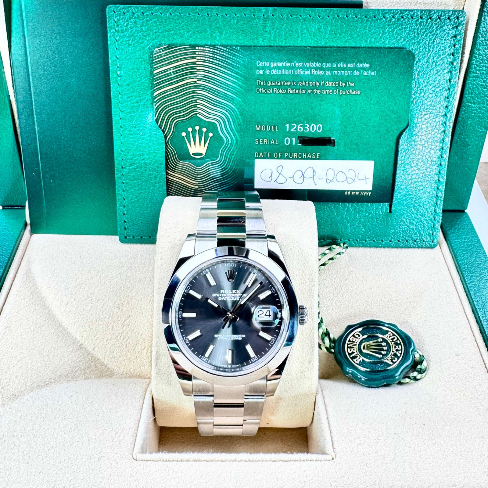 Introducing the awe-inspiring Rolex Datejust 41 126300—a highly coveted timepiece that made its debut as a 2024 model. This mesmerizing masterpiece, untouched and in pristine condition, captures the eye with its magnetic slate dial that captures the light in the most captivating way. It stands out as an adding dignified and elegant complement to the globally honored Rolex Datejust lineage. The Rolex Datejust 41 126300 is an expert and seamless fusion of the Freudian trio of luxury, practicality, and a deeply entrenched tradition of horological craftsmanship, ensuring an utterly enthralling time-telling experience for its fortunate wearer.
