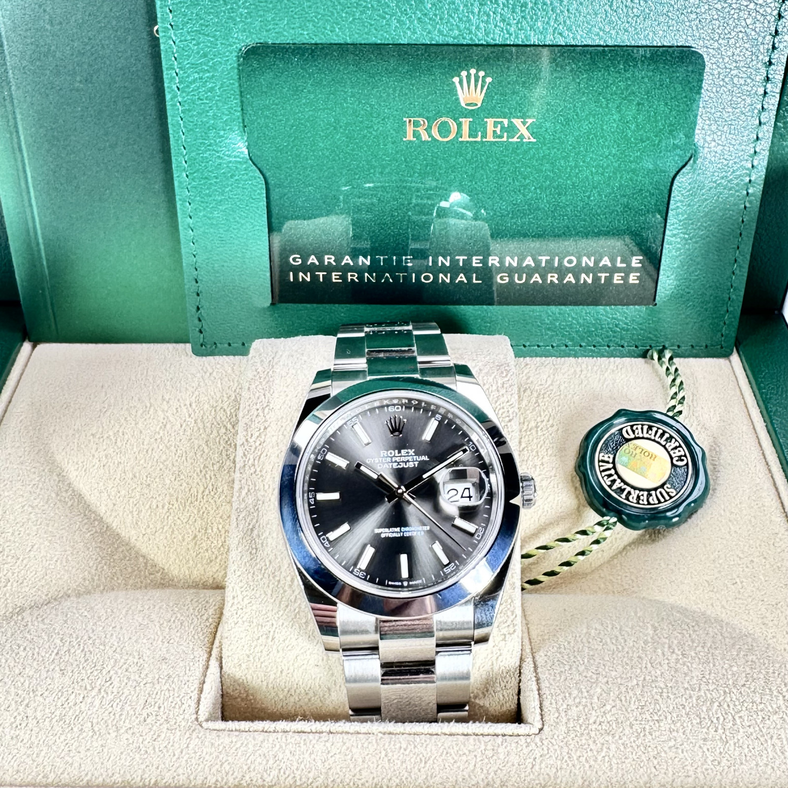 Introducing the marvelously masterful Rolex Datejust 41 126300—a highly sought-after timepiece that first enchantingly entered the horology spotlight as a 2023 model. This mesmerizing masterpiece, pristinely preserved and untouched in its original glory, captivates the senses with its magnetic slate dial. As it lures light into its silvery surface, it sparks an ethereal dance of illuminated charm that incites intrigue and allure. Emblematic of dignified elegance and sophistication, this distinguished addition enhances the acclaimed Rolex Datejust lineage while preserving its tradition-backed pedigree.