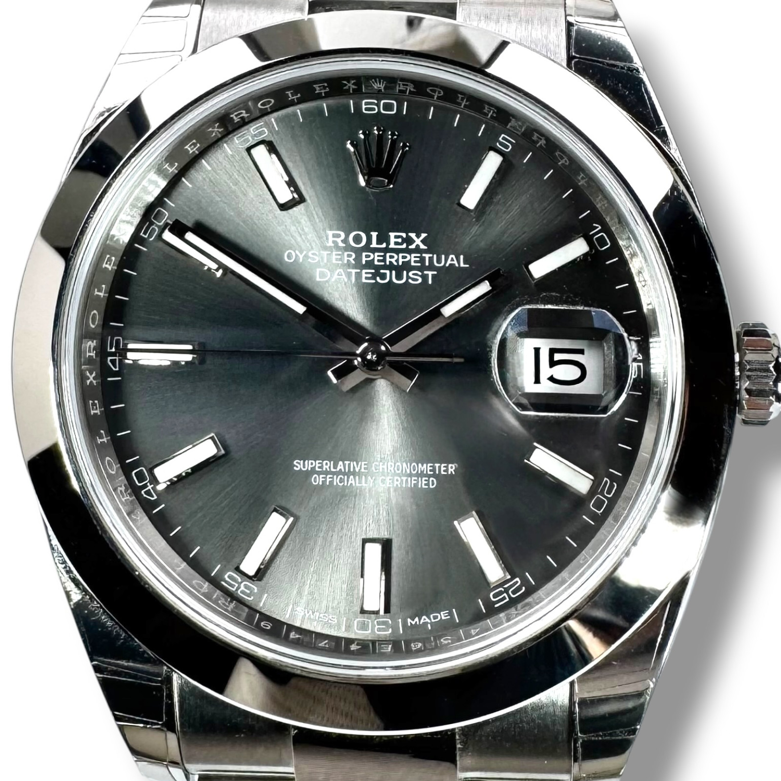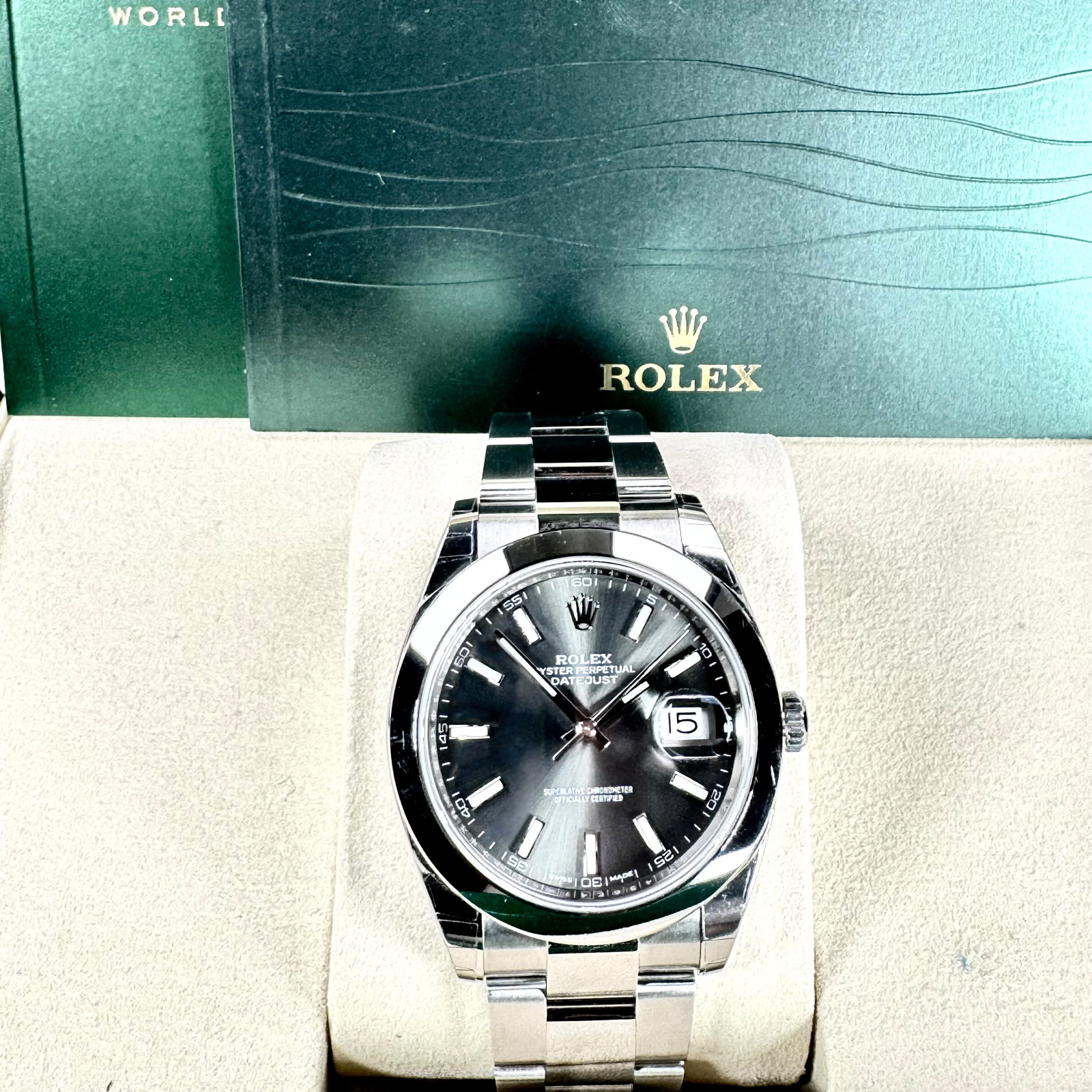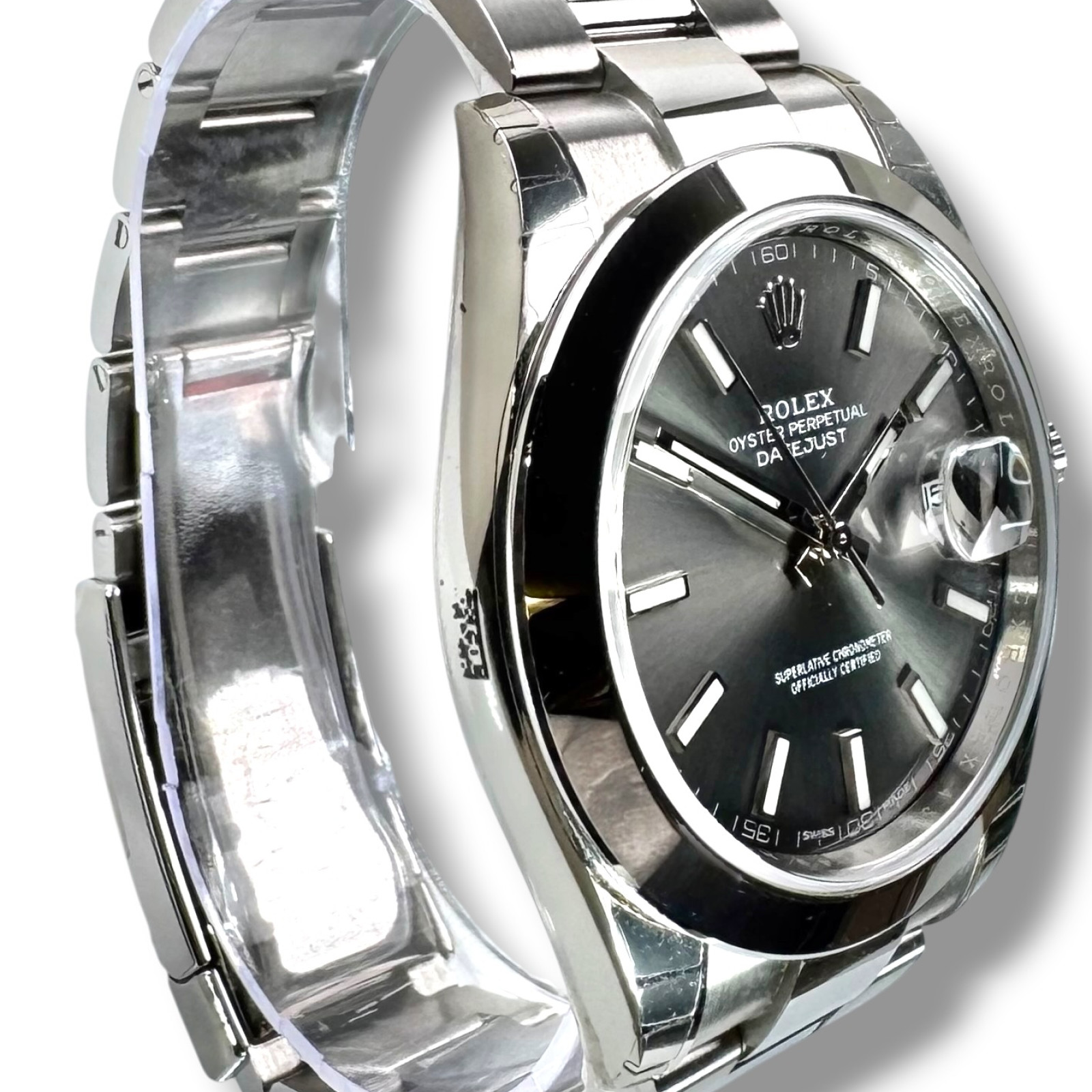 We are thrilled and privileged to present to you the magnificent Rolex Datejust 41 126300—which effortlessly distinguishes itself as a timepiece of unfathomable machismo and universal admiration. This awe-inspiring piece of horological dexterity first made its grand entrance into the world of luxury watches as a sparkling sensation in the year 2019, and it still bears its original factory seals and stickers as an unworn model. This mesmerising marvel of time-telling finesse, flawlessly finished in every possible aspect, never fails to draw the attention and veneration of all who set their eyes upon its glimmering and somewhat bewitching slate dial. This dial has an undying affinity for the ambient light, reflecting it in a hypnotically captivating spectacle that is ever entertaining to behold.