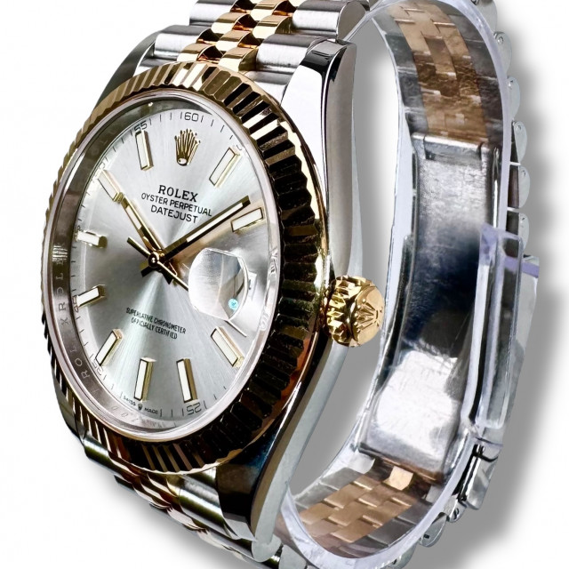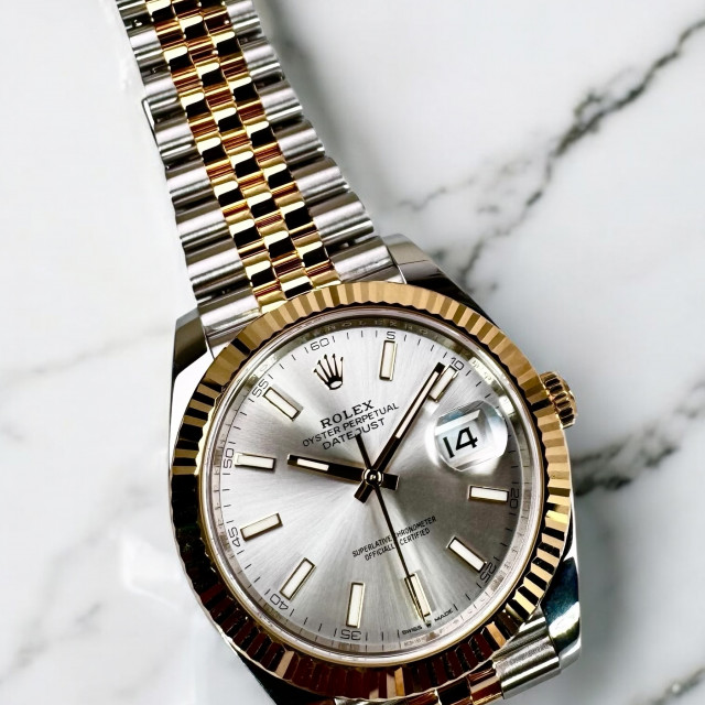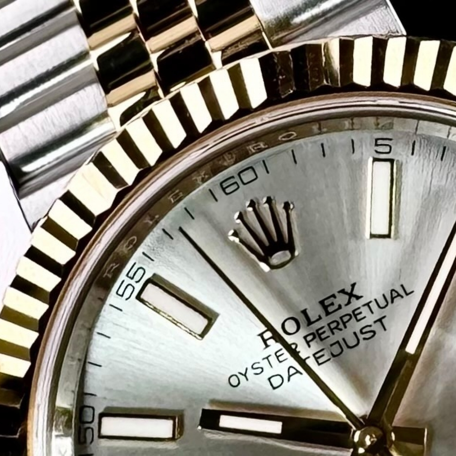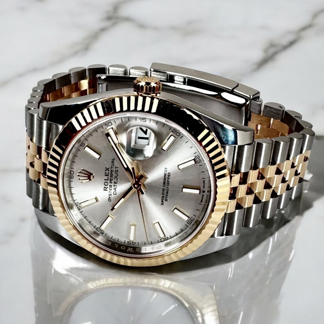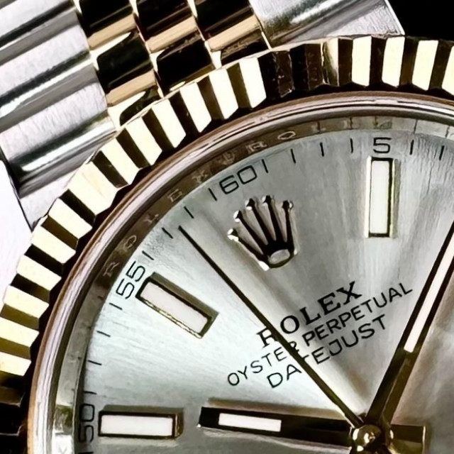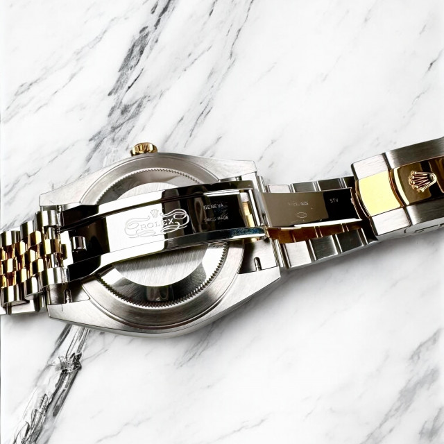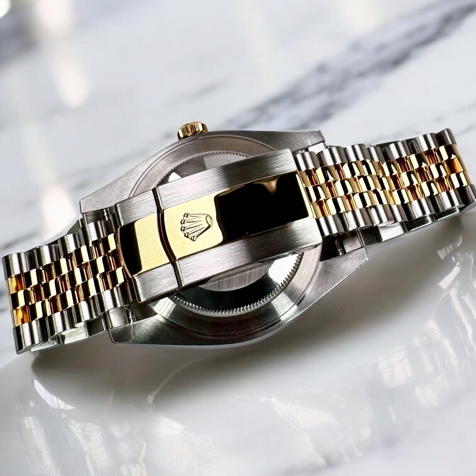 The Rolex Datejust is graced with an opulent Jubilee bracelet, structured with five-piece links. This stately bracelet is expertly crafted from premium 18 karat gold and pure stainless steel, achieving a commendable balance between luxuriant grandeur and comfort, promising the perfect fit for every wearer.