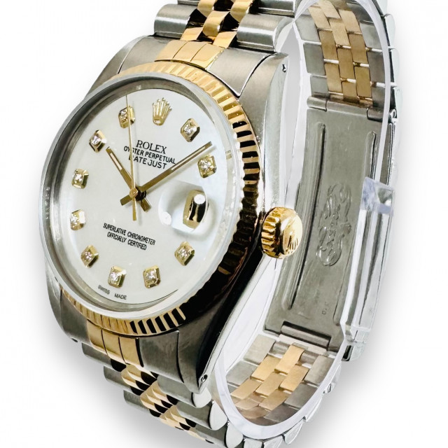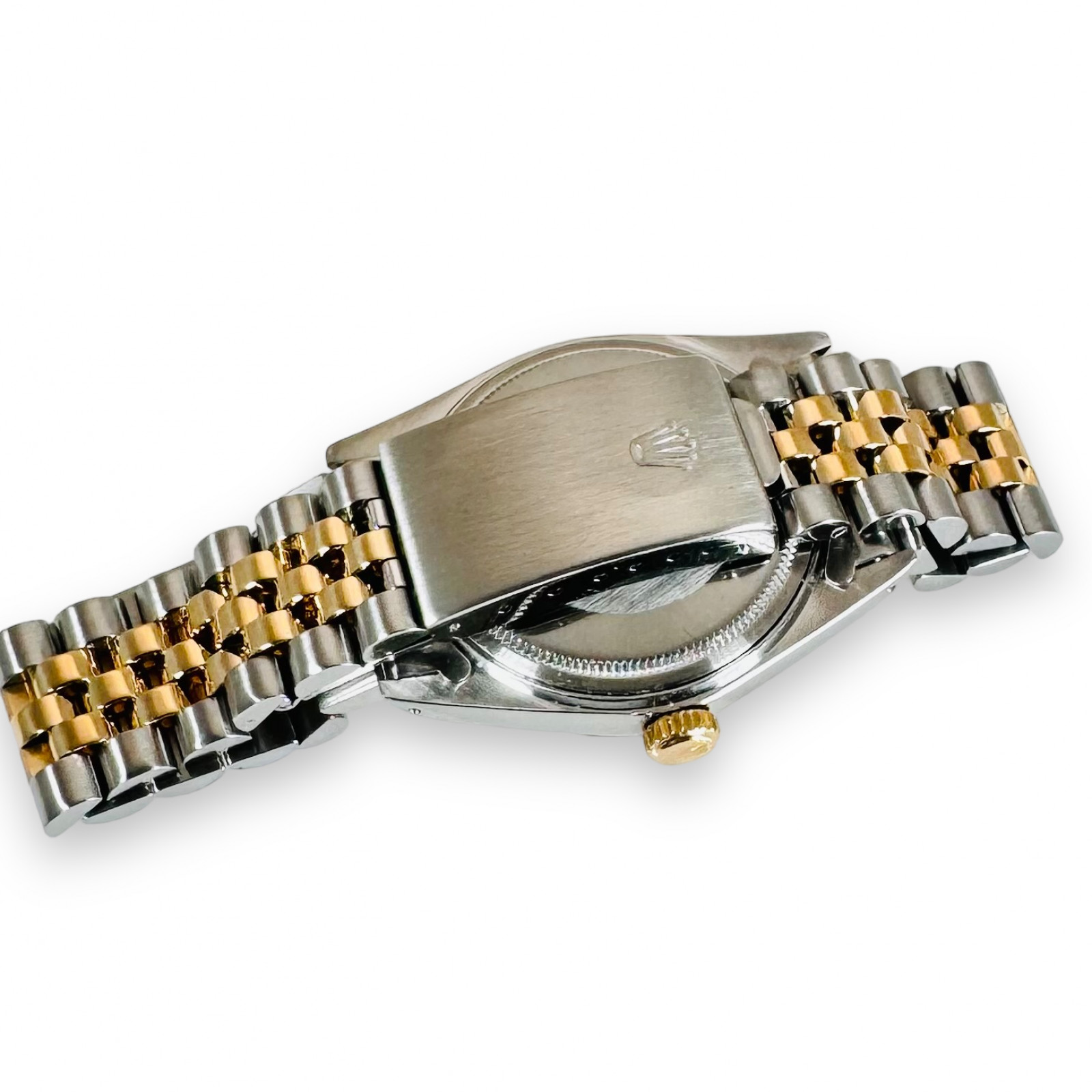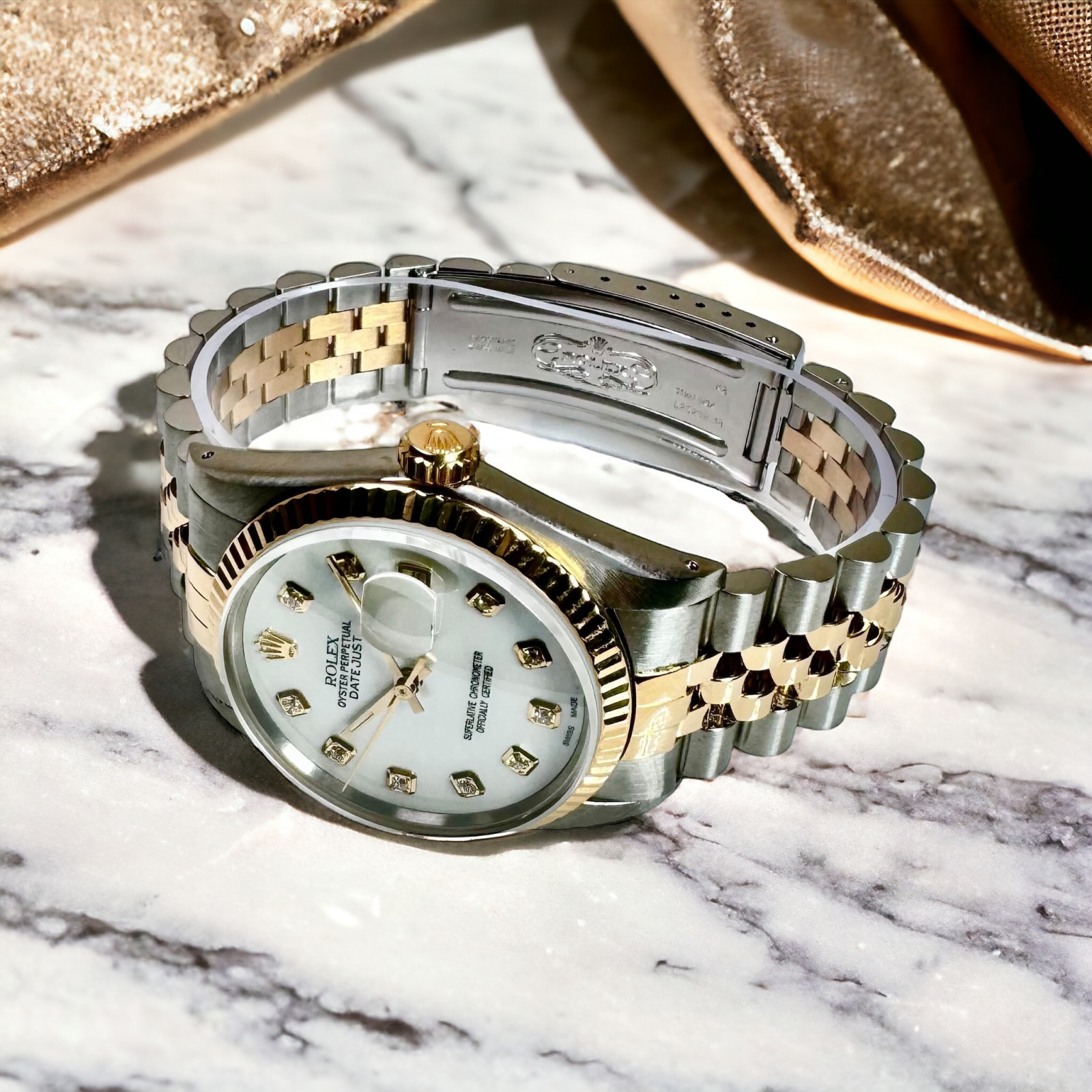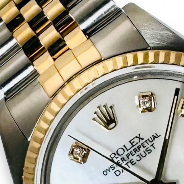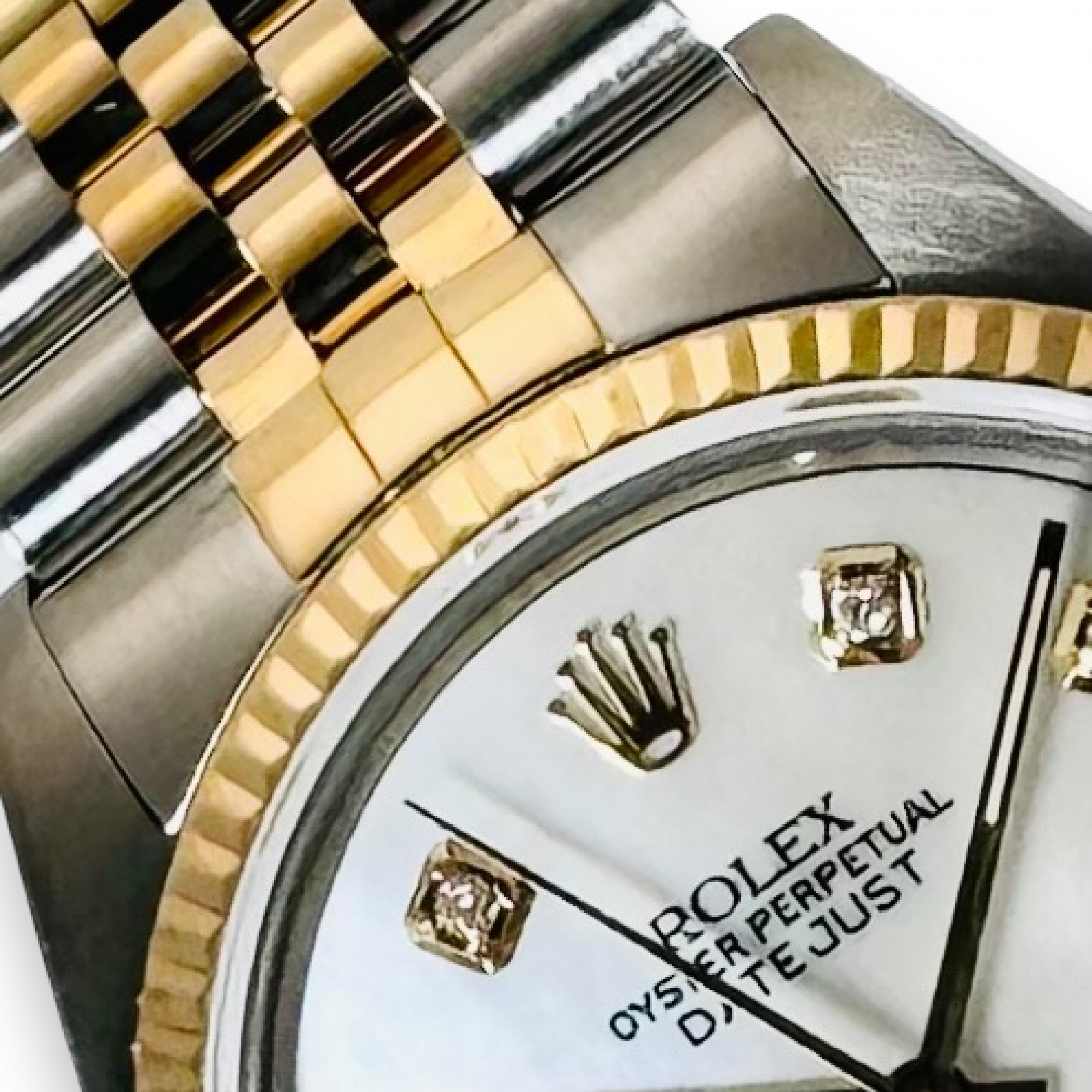 In conclusion, the Rolex 16013 18k Gold & Steel Datejust adorned with a mesmerizing Mother Of Pearl diamond dial, is not just a device for tracking time- it is a statement of style, a hallmark of prestige, and an undeniable testament to impeccable craftsmanship. This timepiece is the very embodiment of elegance and luxury, making it an indispensably glamorous accessory for those who value the nuanced finesse and sheer artistry of high-end watch design.