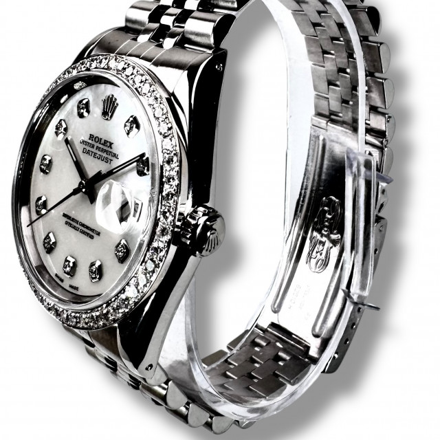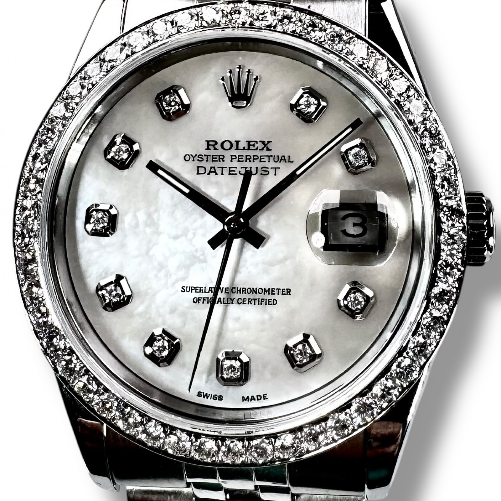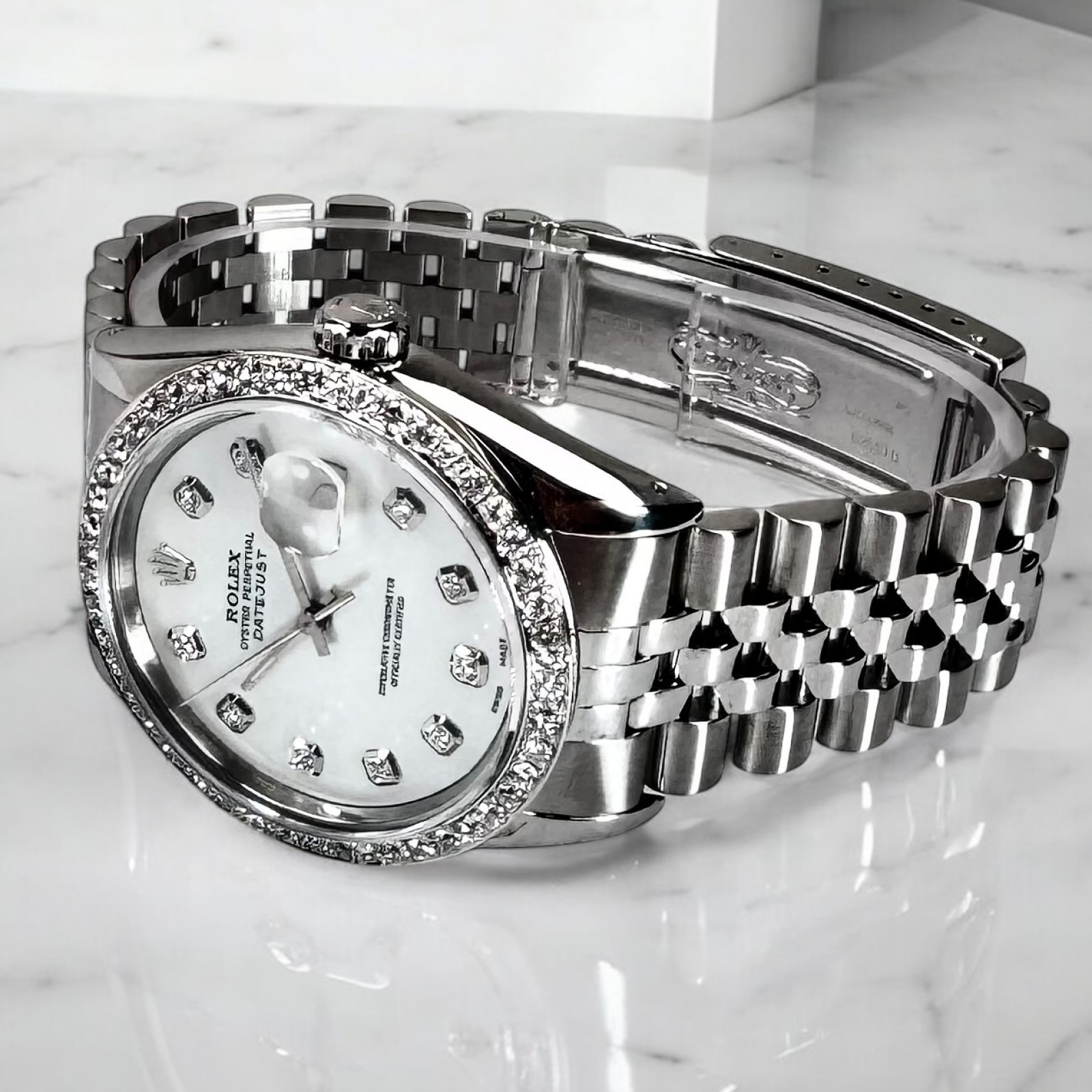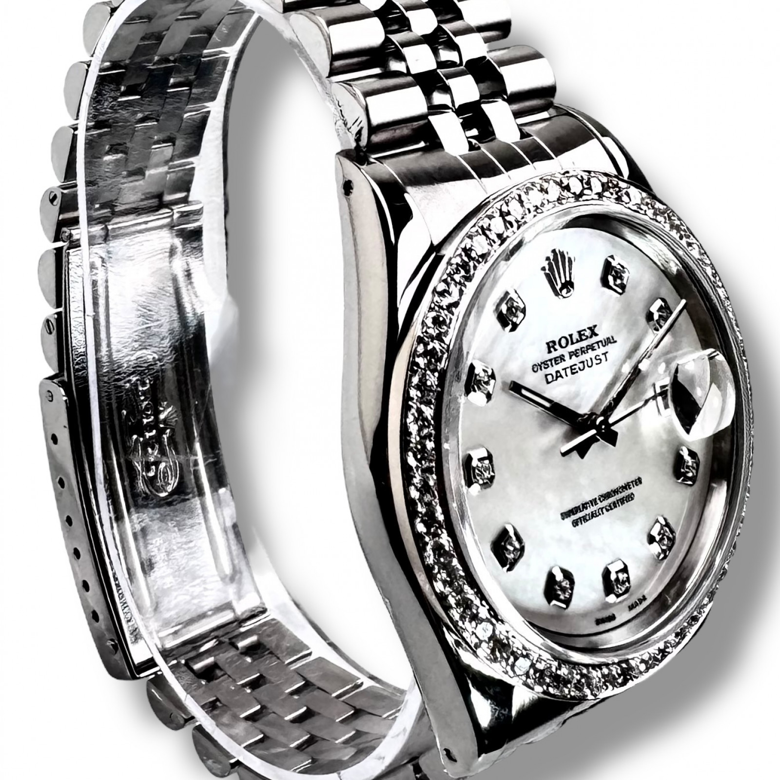 We are thrilled to showcase the iconic Rolex Datejust model 16220, an unparalleled wristwatch that is a personification of opulence and precision. This effortlessly sophisticated masterpiece, with a meticulously designed diamond dial and glittering bezel, stands bathed in a unique, alluring mother of pearl hue, emanating an inimitable aura of gracefully matured sophistication and style. What serves as a backdrop for the dial is less a surface and more a creatively textured canvas, flamboyantly illuminating the bold silver-toned hands and hour markers, reinforcing the watch's quintessential allure.