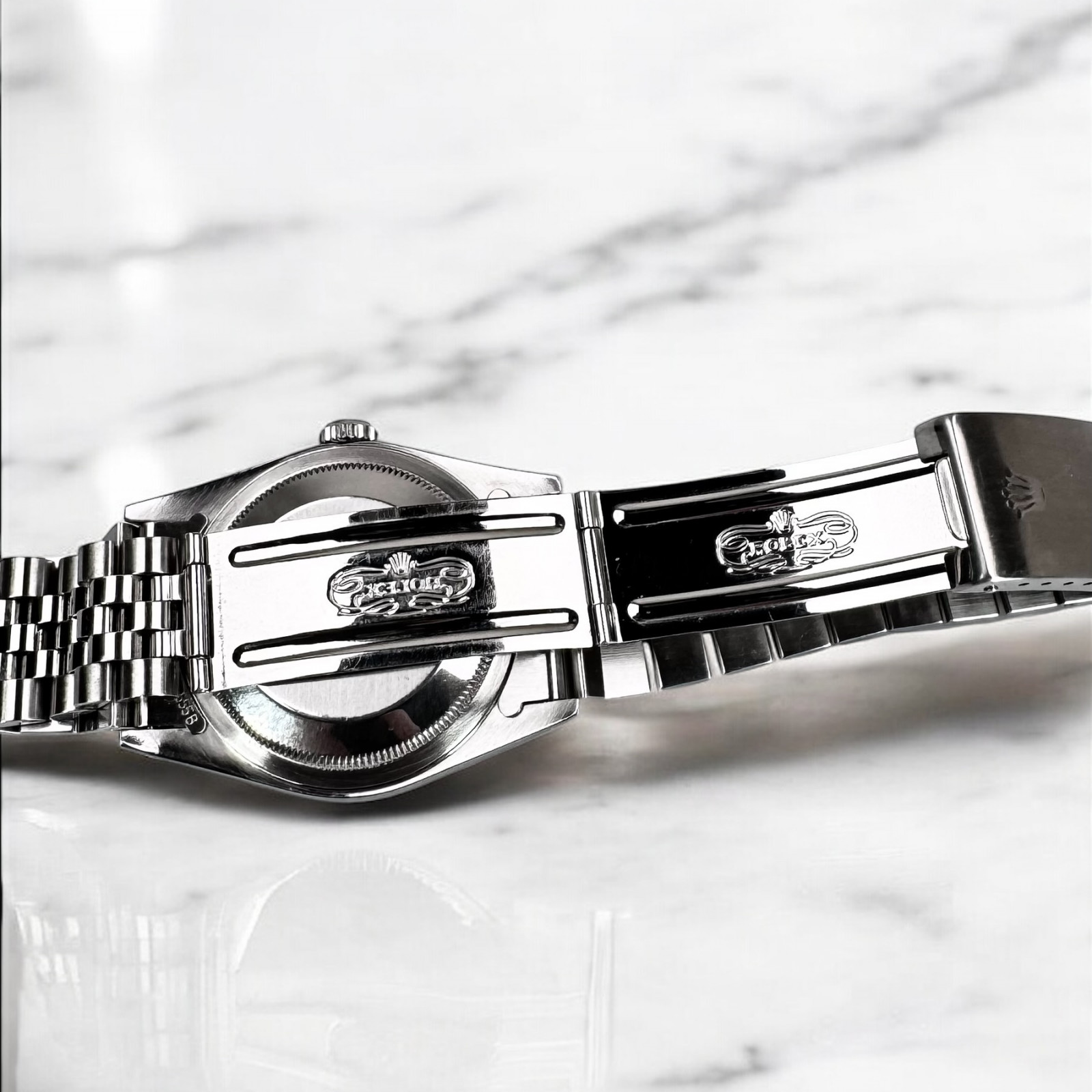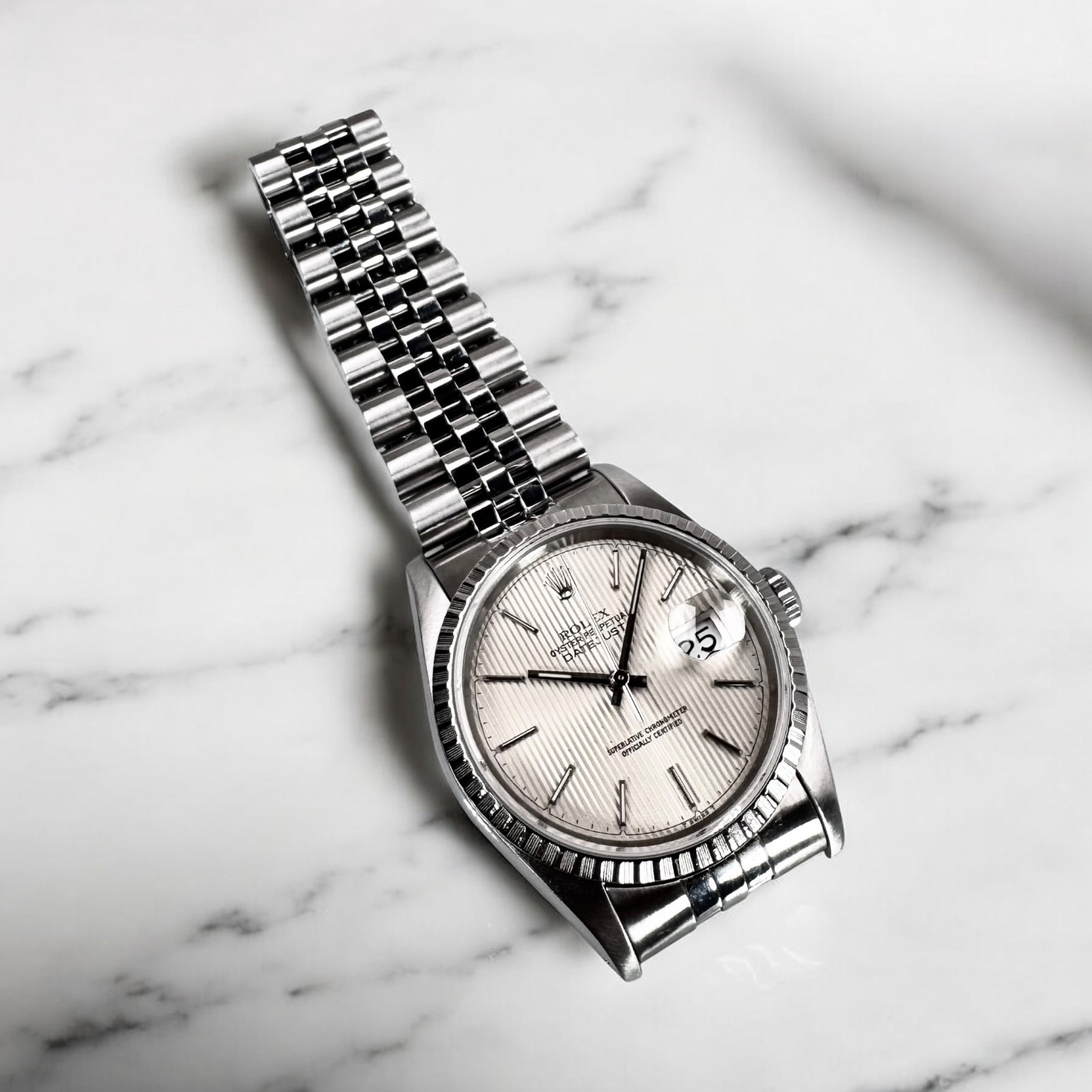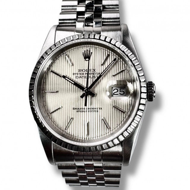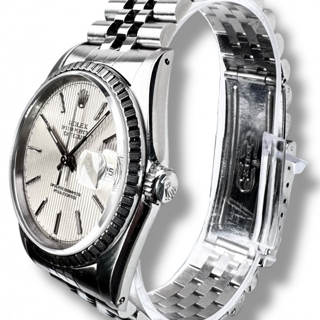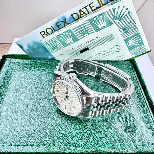 The watch is beautifully complemented with the inclusion of the Jubilee bracelet style 62510 - a quintessential offering by Rolex. Crafted for longevity and timeless appeal, this five-piece metal bracelet ensures a snug fit while offering undeniably reliable robustness, taking the aesthetic allure of the Rolex Datejust model 16220 up a notch.