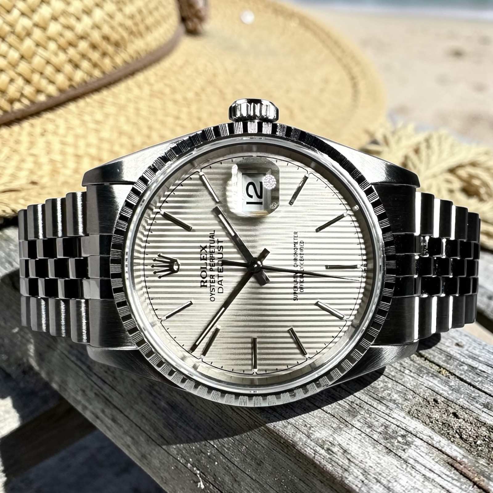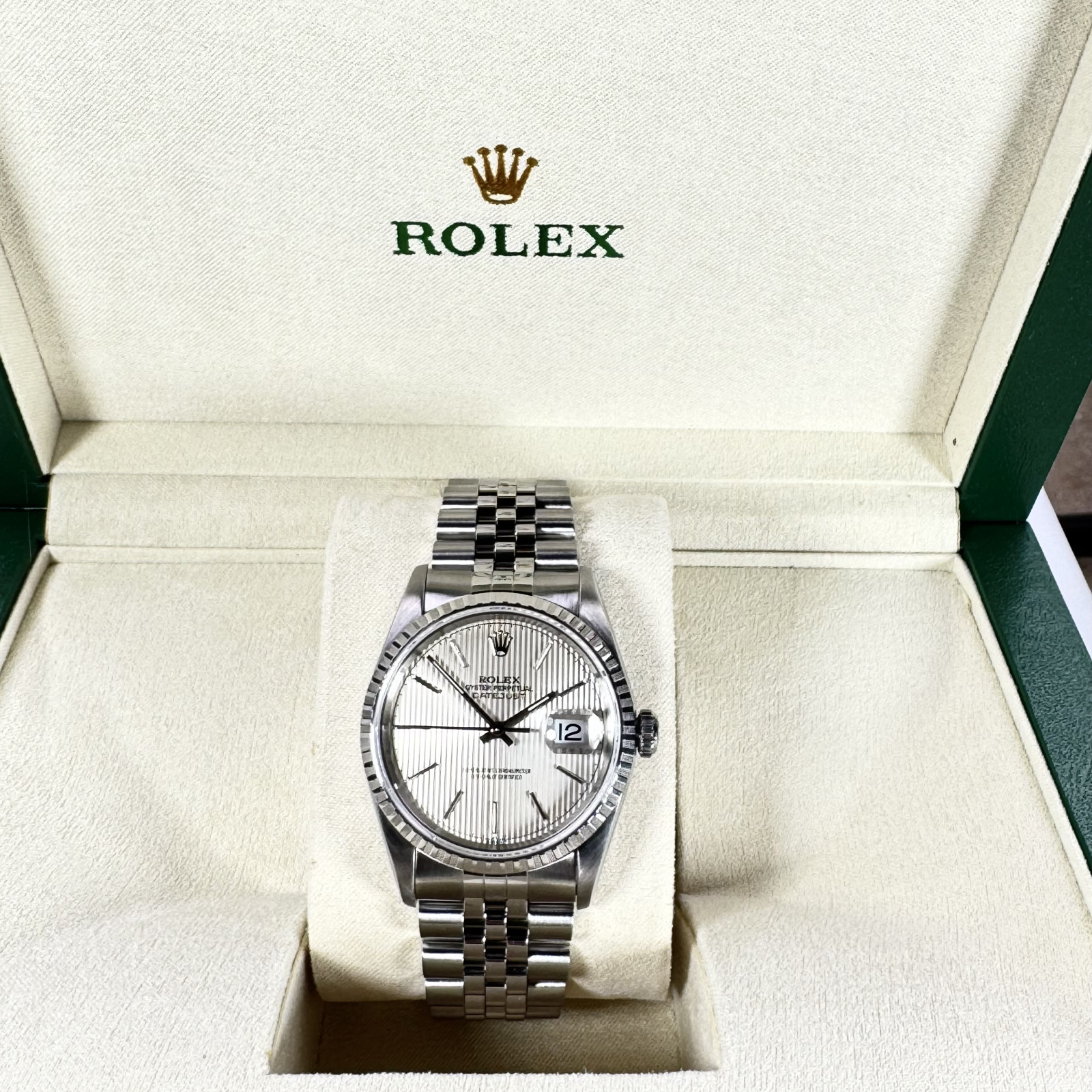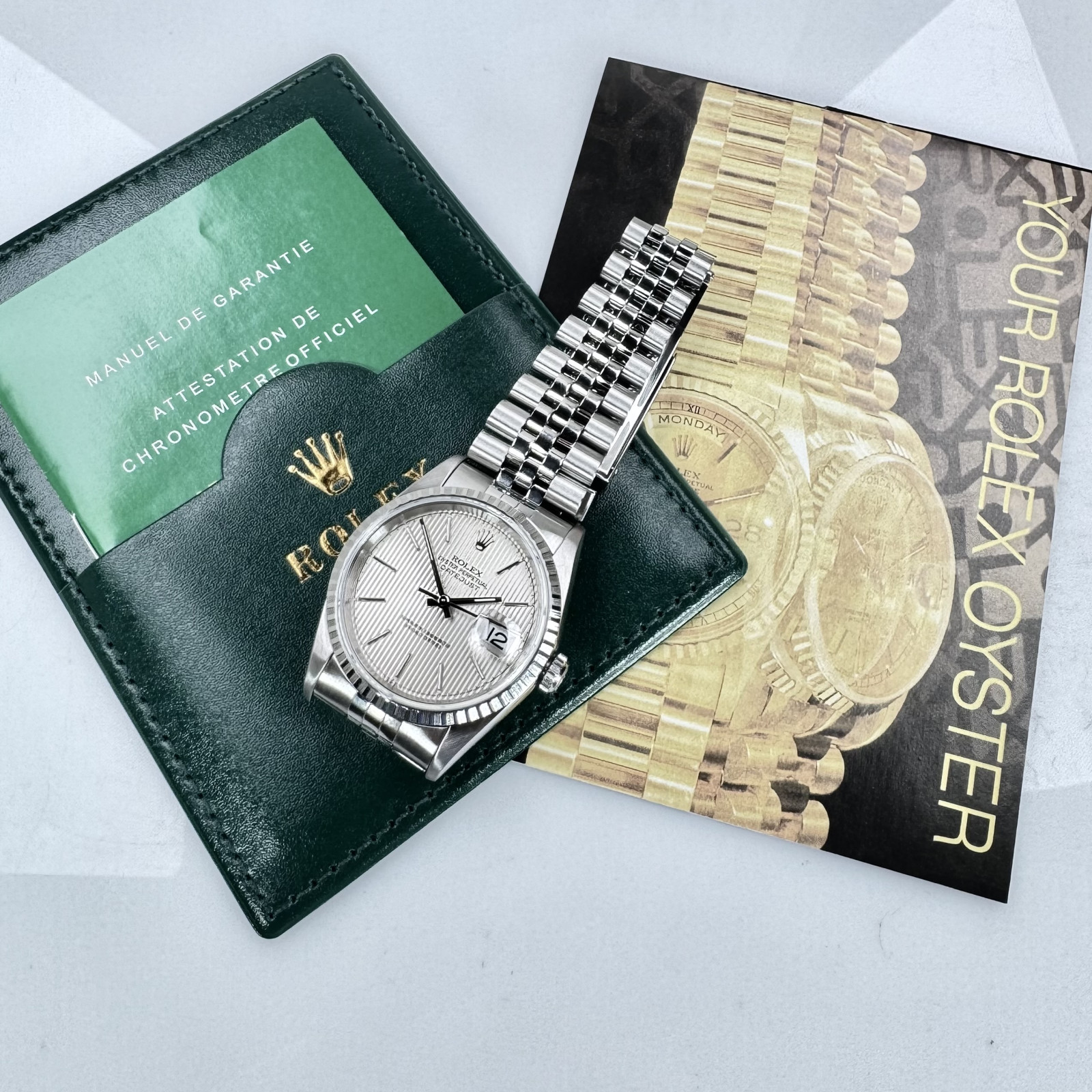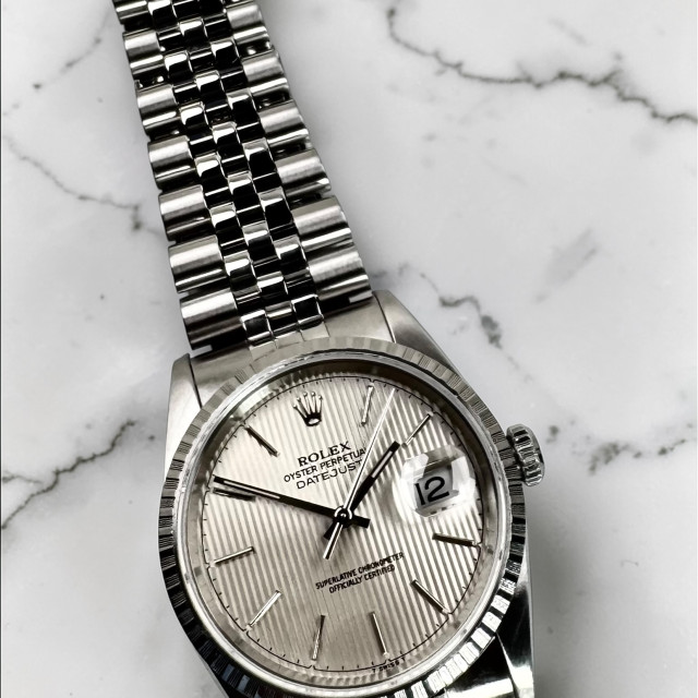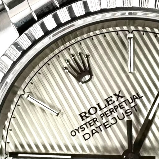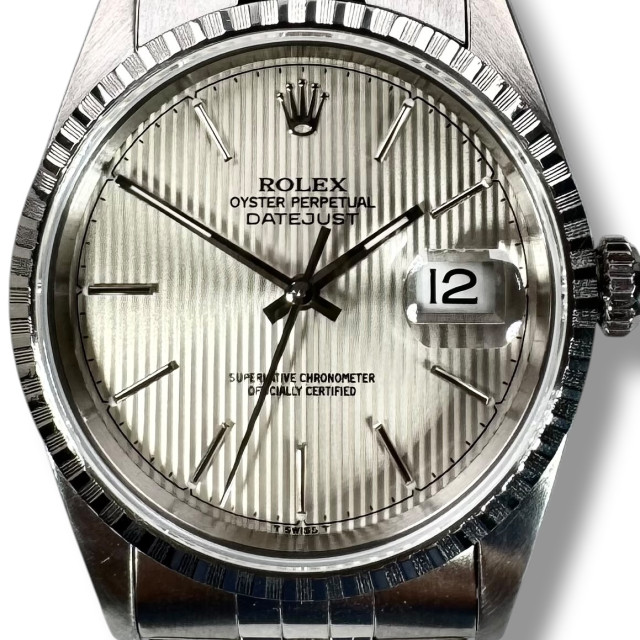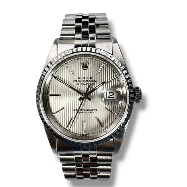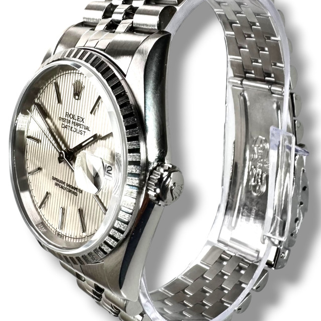 To sum up, the Rolex Datejust model 16220 with Silver Tapestry Dial is the epitome of Rolex's enduring horological excellence. An amalgamation of exceptional materials and timeless design aspects results in this masterpiece, with a striking appearance and eminent performance. Every meticulously crafted detail of this watch signifies Rolex's staunch commitment to maintaining the highest quality standards. A paragon of horological mastery, this extraordinary Rolex wristwatch is indeed a cherished treasure that would augment any watch collector's compilation.