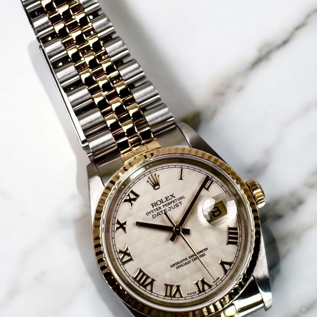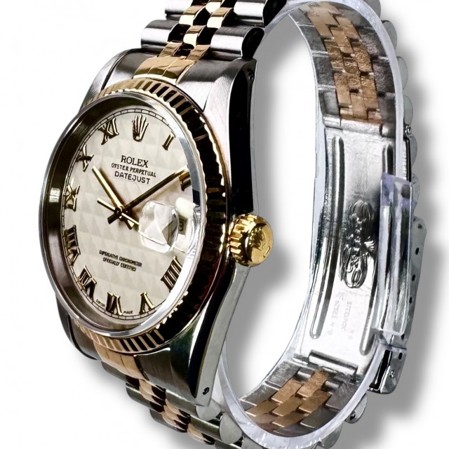 Introducing a truly captivating masterpiece in the realm of timekeeping—the Rolex 16233 Datejust with a luminous Ivory Pyramid Dial. As part of Rolex's stellar lineage of breathtaking timepieces, the 16233 Datejust is a magnificent display of splendor and function intertwined. Its measured elegance of 36 mm is perfect for creating a bold yet unimposing presence on the wrist of its wearer, an unusual balance that has come to be associated with Rolex watches.