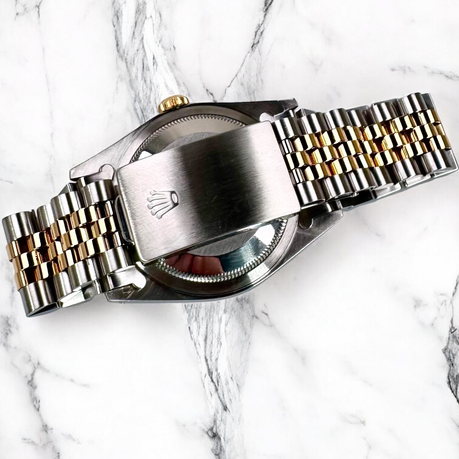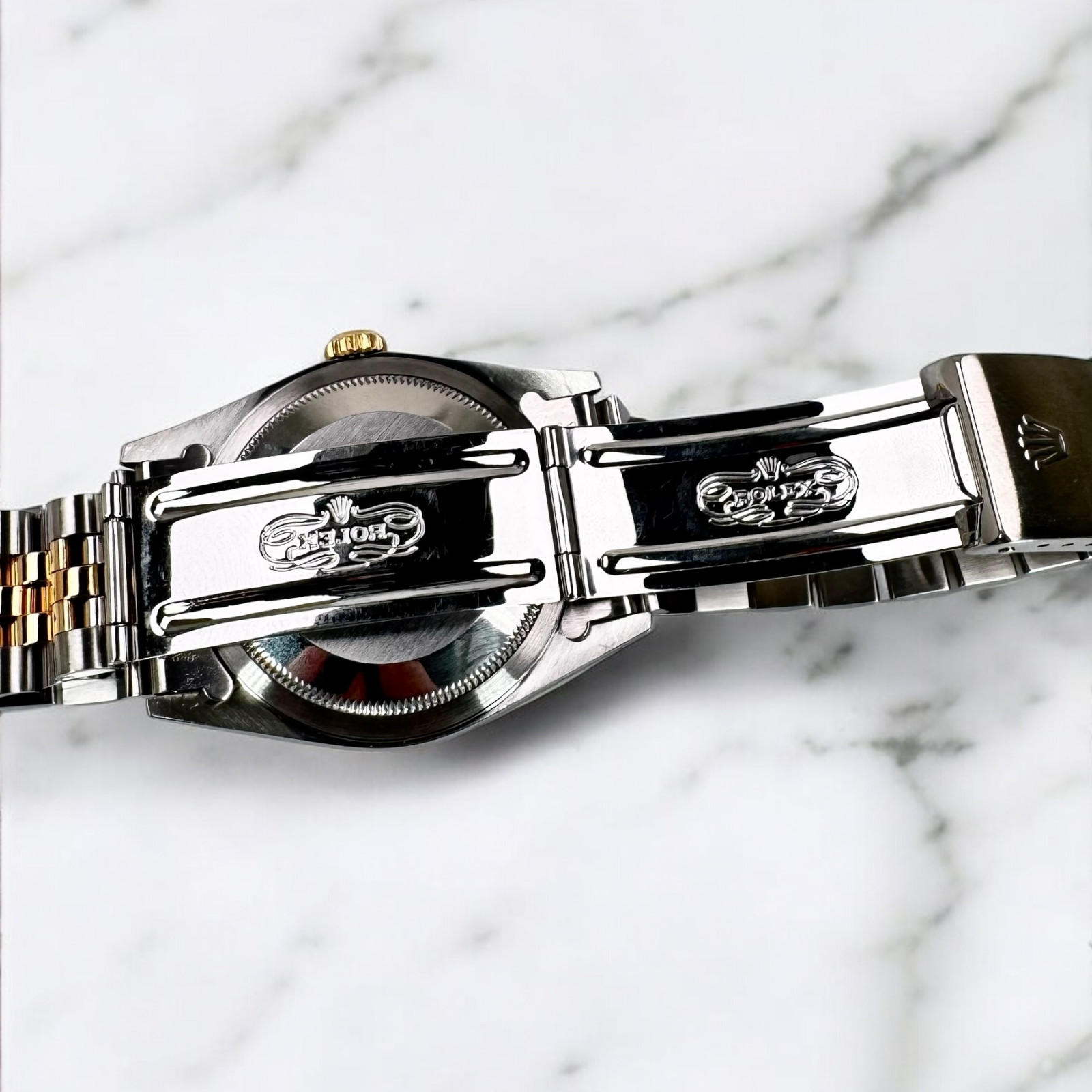The watch conceals a refined automatic movement within its conspicuously robust Oyster case. Esteemed for its incredible defensive attributes against water, dust, and pressure, the Oyster case of the Rolex Datejust 16233 ensures the inner workings of the watch remain undisturbed. This mechanical heart of the timepiece is the reason for its unwavering timekeeping precision, exuding a blend of aesthetic allure and mechanical prowess.