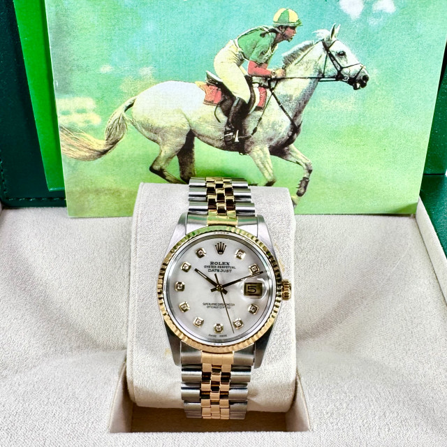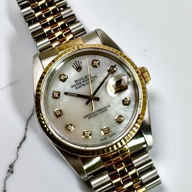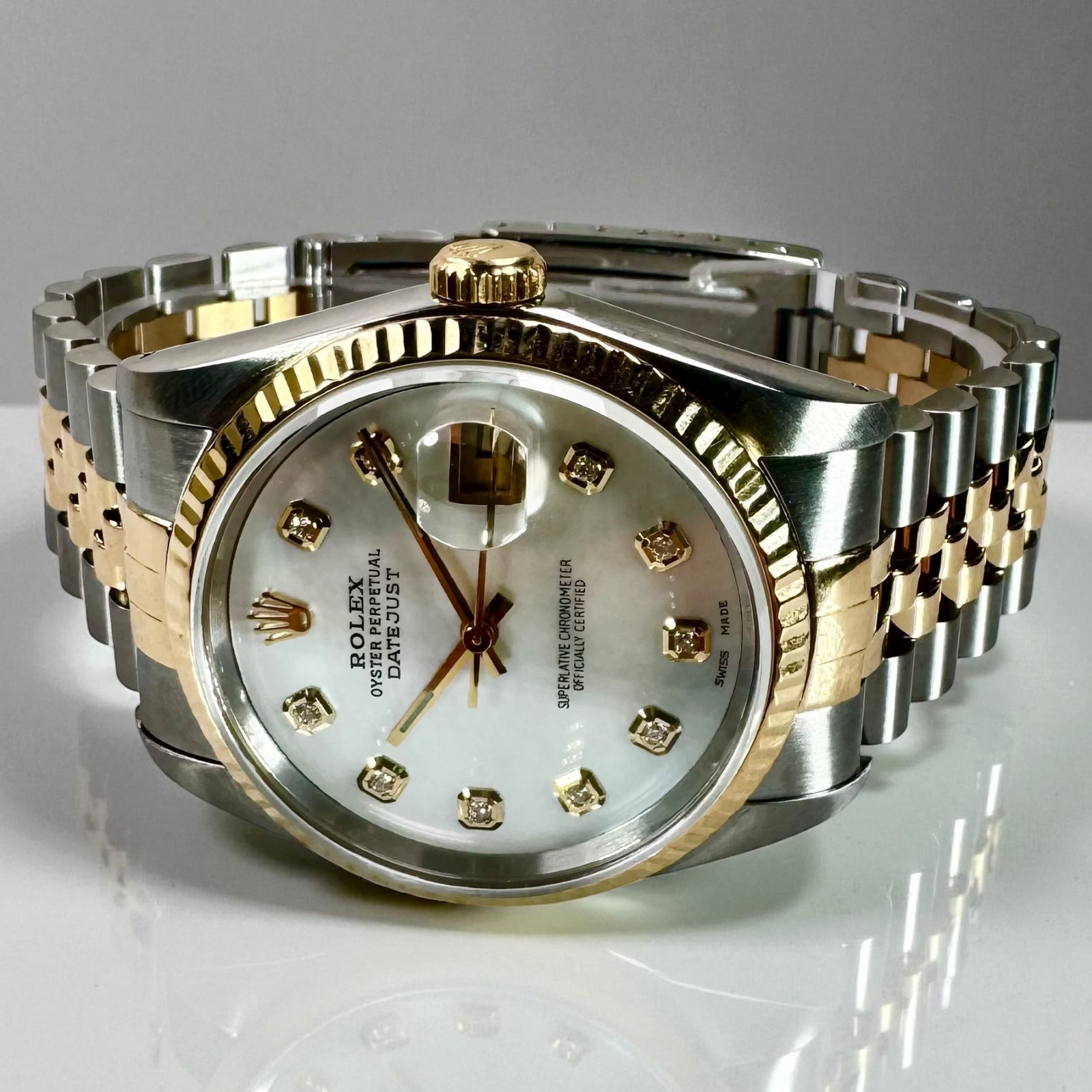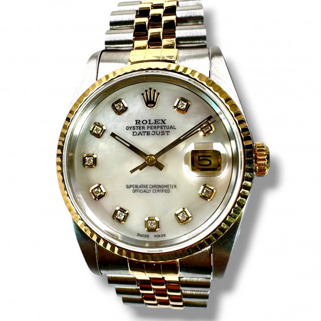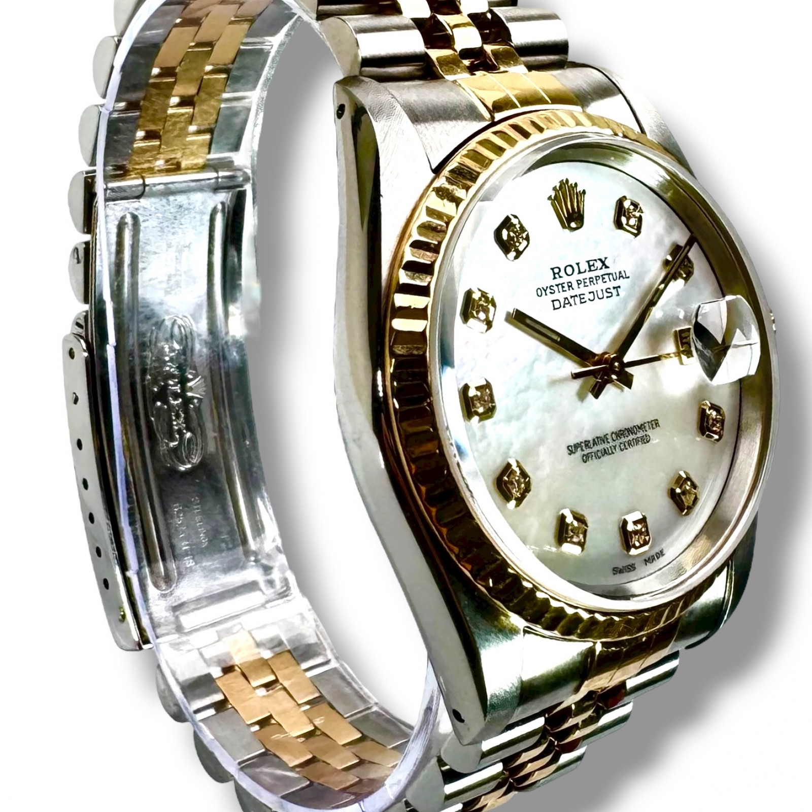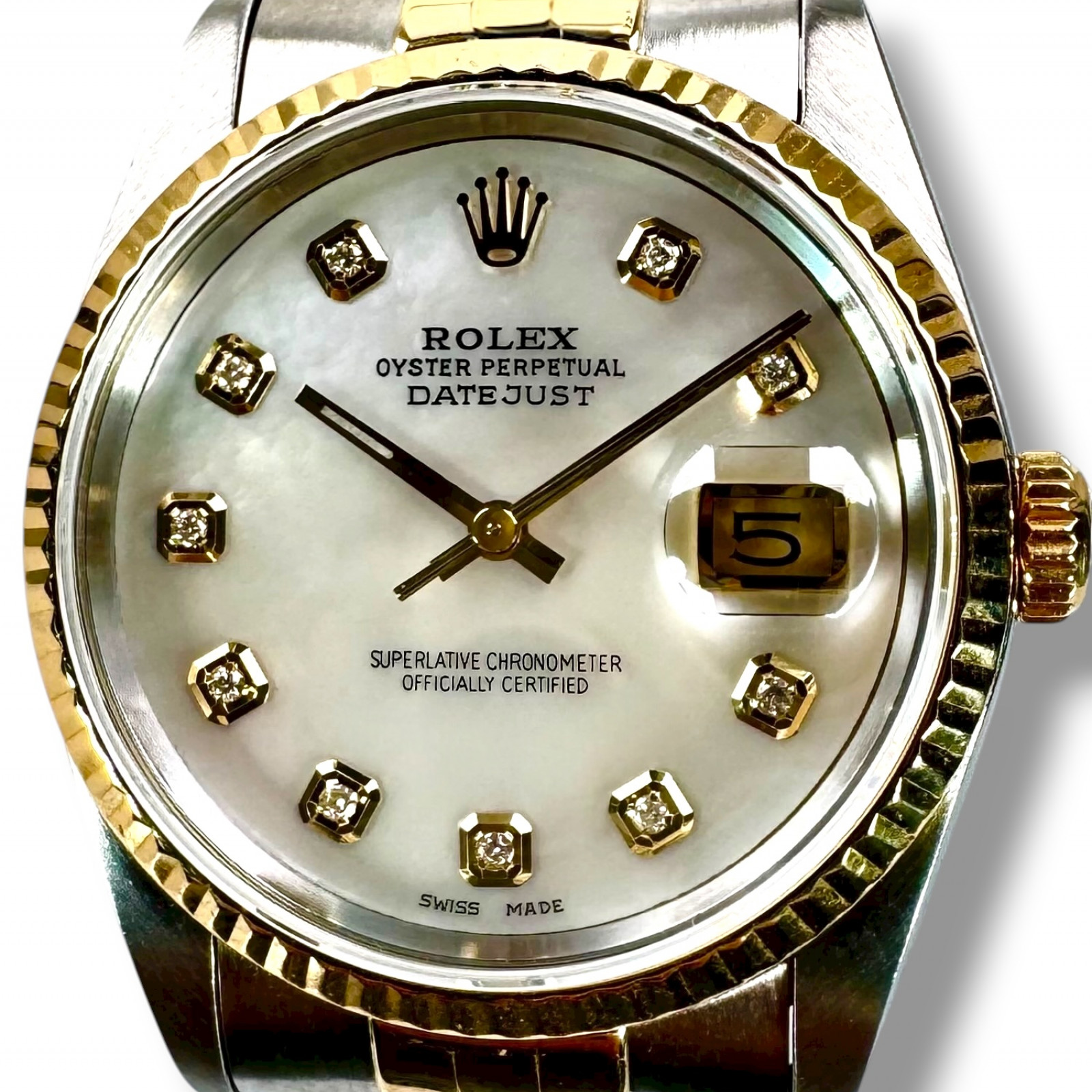 Celebrated as a paragon of world-class craftsmanship and transcendent design, the Rolex 16233 Datejust is an unassailable masterpiece eternally imprinted in the history of horology. Showcasing a bespoke mother of pearl diamond dial, this meticulously fashioned timepiece is presented in supreme condition and embodies the impecable quality and timeless prestige associated with Rolex's enduring heritage.