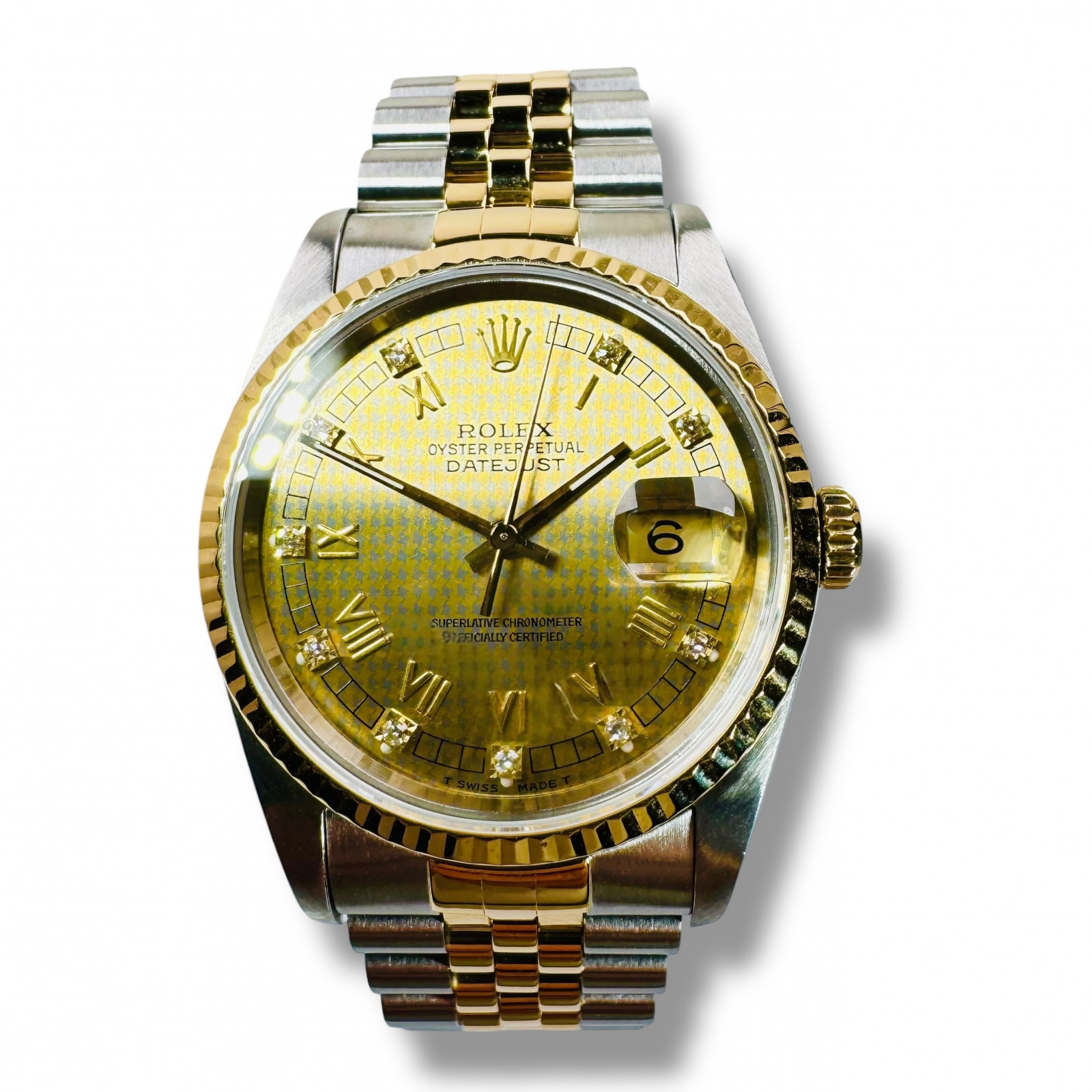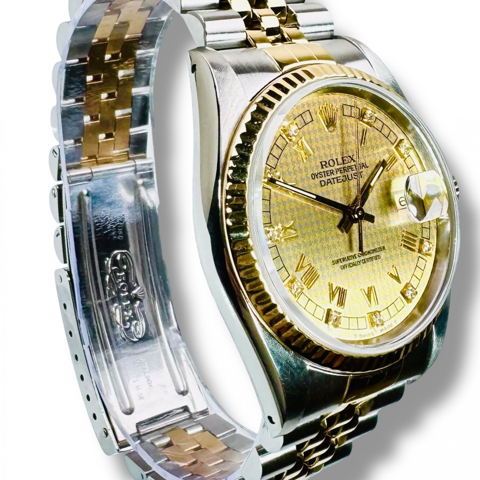 Introducing the regal Rolex 16233 Datejust – an embodiment of luxury, precision, and craftsmanship like no other. This timepiece is adorned with a stunningly elegant Hounds Tooth diamond dial, an aesthetic rarity only found in select Rolex models. Defined by its transcendent blend of modern appeal and traditional opulence, this Rolex Datejust is – beyond any doubt – a state-of-the-art accessory that epitomizes refinement and prestige.