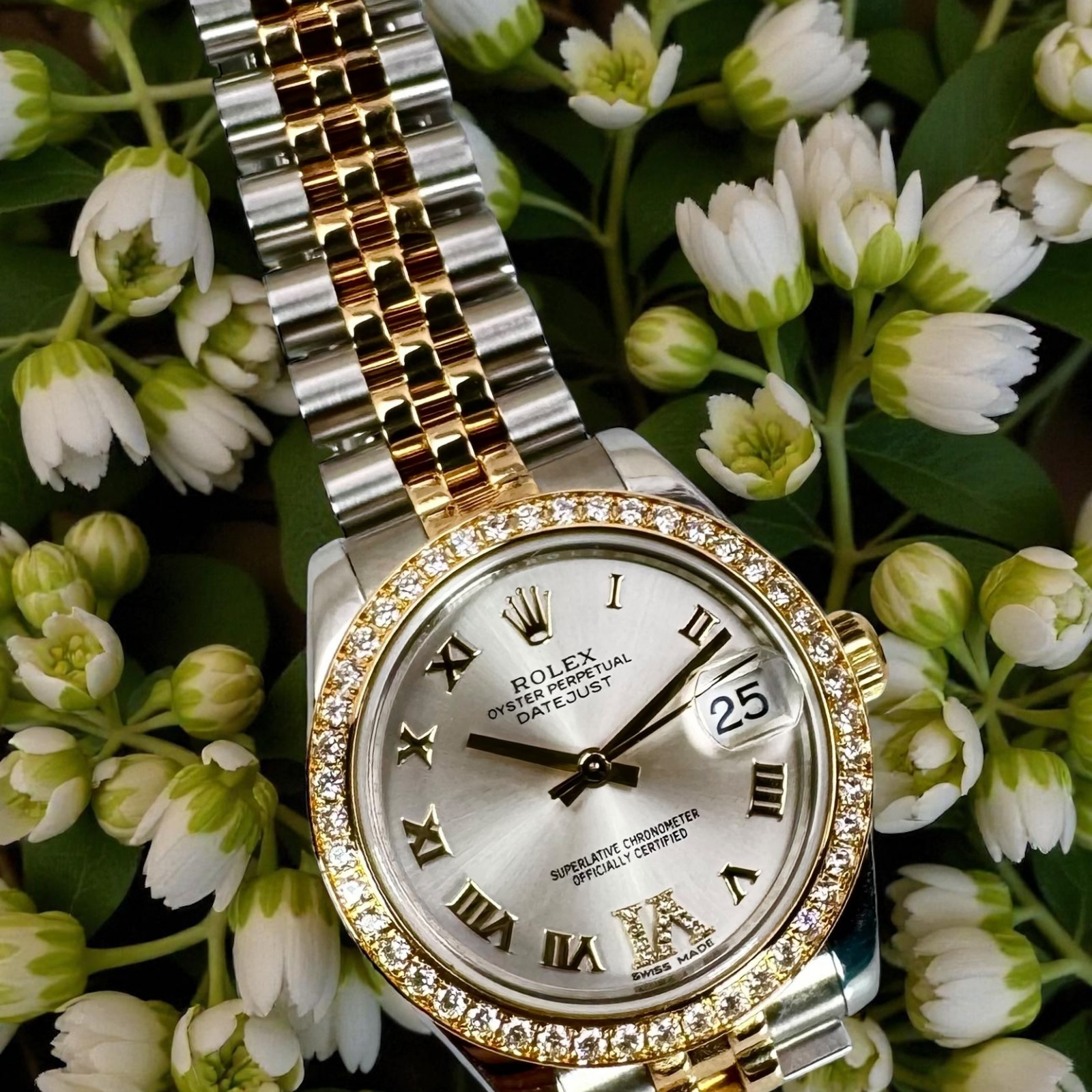 Presenting a magnificent timepiece, the Rolex model 178383, designed with an air of supreme sophistication for tasteful individuals who truly appreciate profound styling. This intricate creation is highlighted by a factory-set diamond bezel, serving as a testament to the Rolex name and its rich heritage of quality and precision.
