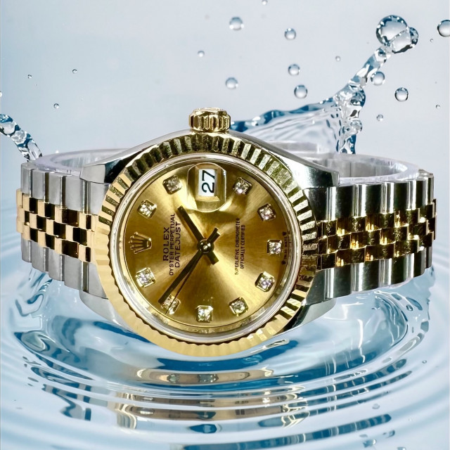 With a water resistance up to 330 feet (100 meters), this Rolex Datejust, a waterproof wristwatch, is suitable for swimmers or recreational divers. However, it is not designed for intense deep-sea diving.