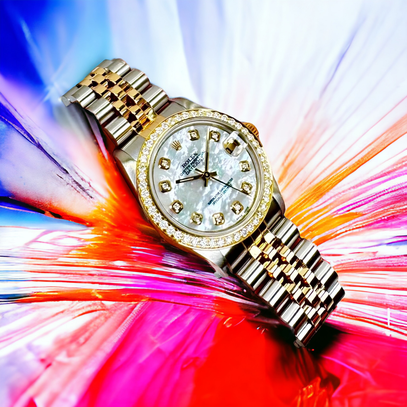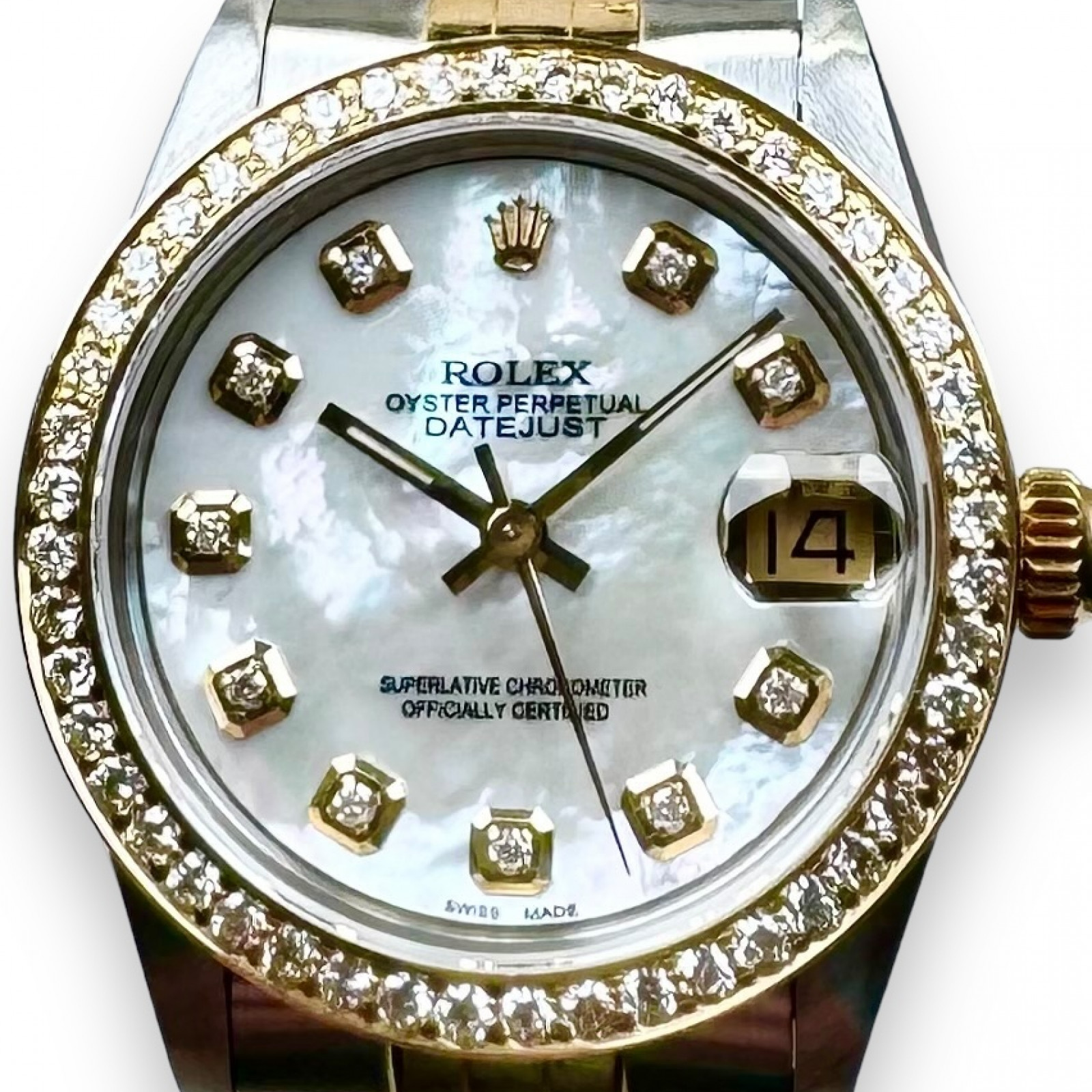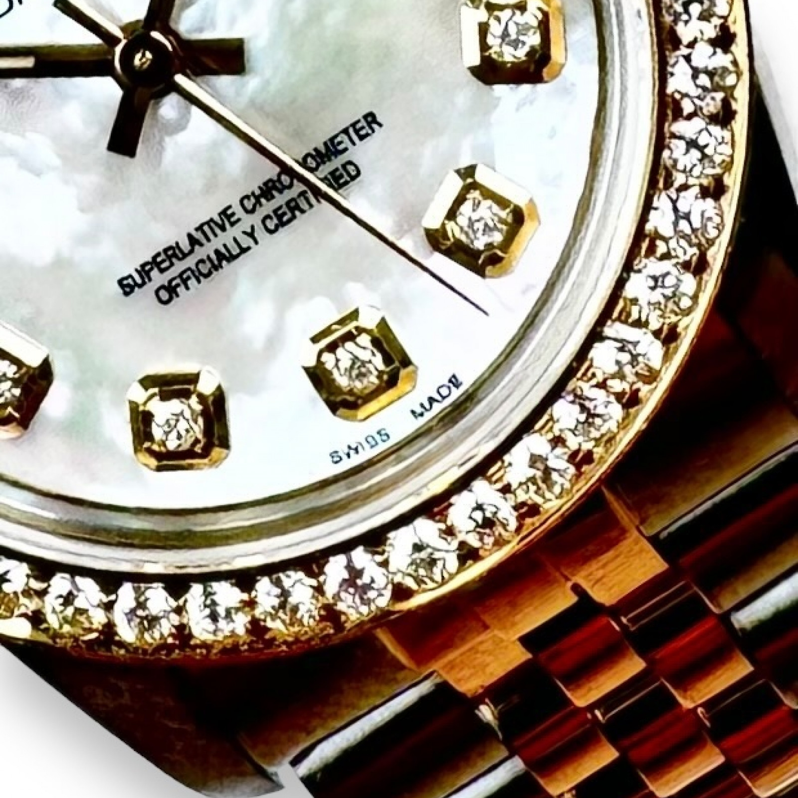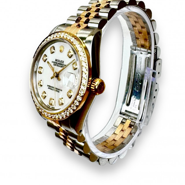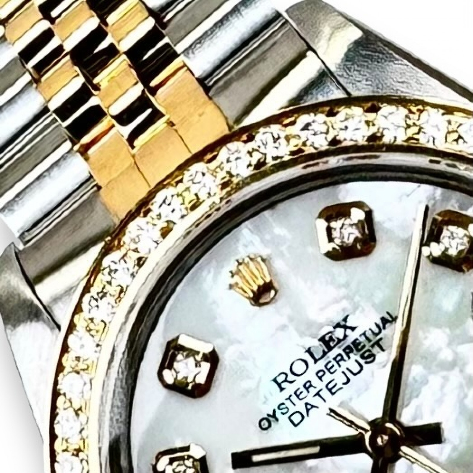 The Rolex 68273 Datejust proudly showcases a captivating Mother Of Pearl dial that shimmers with a carefully curated selection of diamond inlays. With such fine embellishments, this wristwatch transcends the constraints of regular timepieces, clearly asserting its distinctiveness and extraordinary craftsmanship through its breathtaking aesthetics and mechanical superiority.