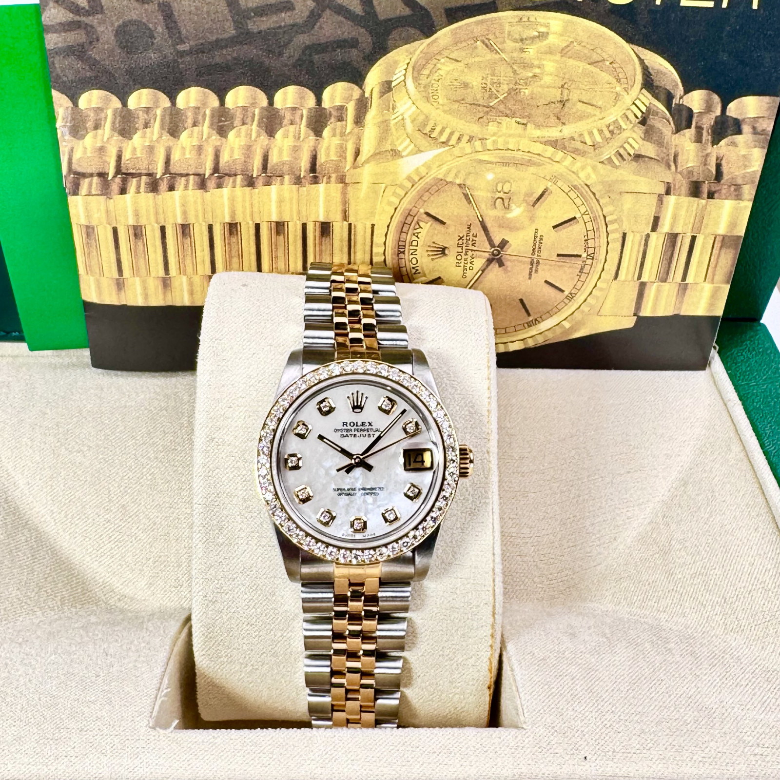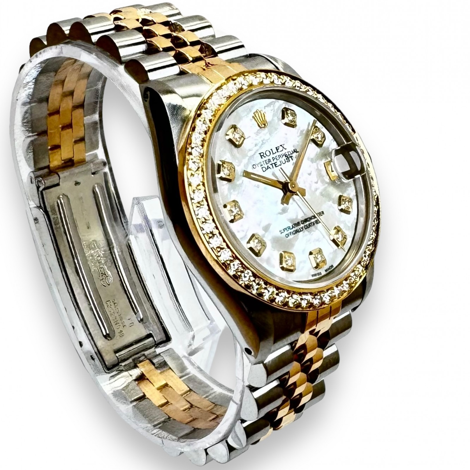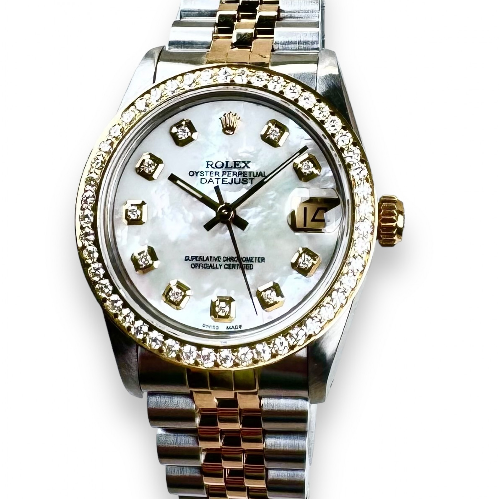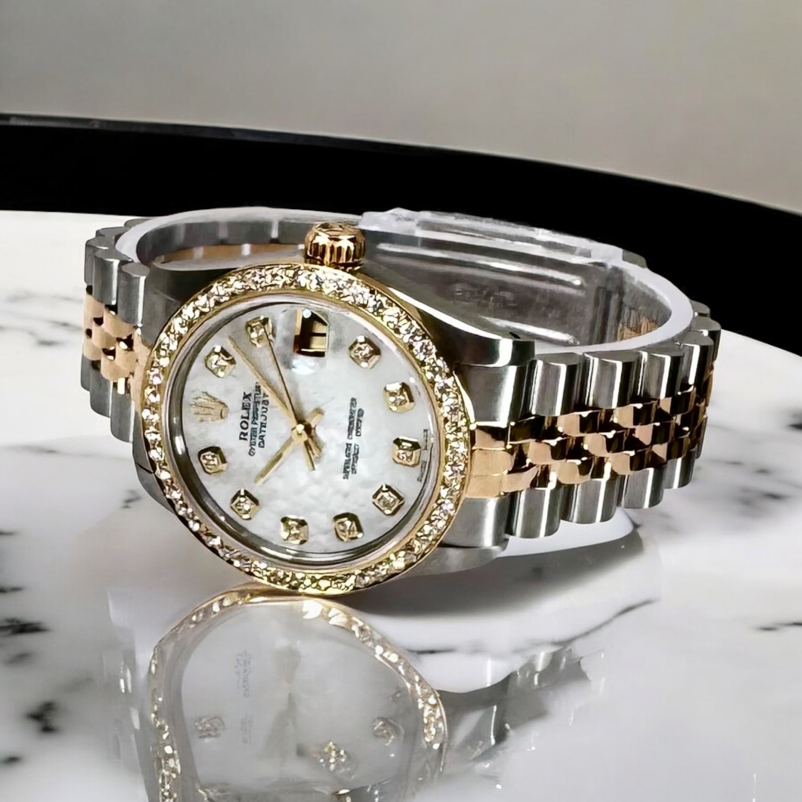 The Rolex 68273 Datejust proudly showcases a captivating Mother Of Pearl dial that shimmers with a carefully curated selection of diamond inlays. With such fine embellishments, this wristwatch transcends the constraints of regular timepieces, clearly asserting its distinctiveness and extraordinary craftsmanship through its breathtaking aesthetics and mechanical superiority.