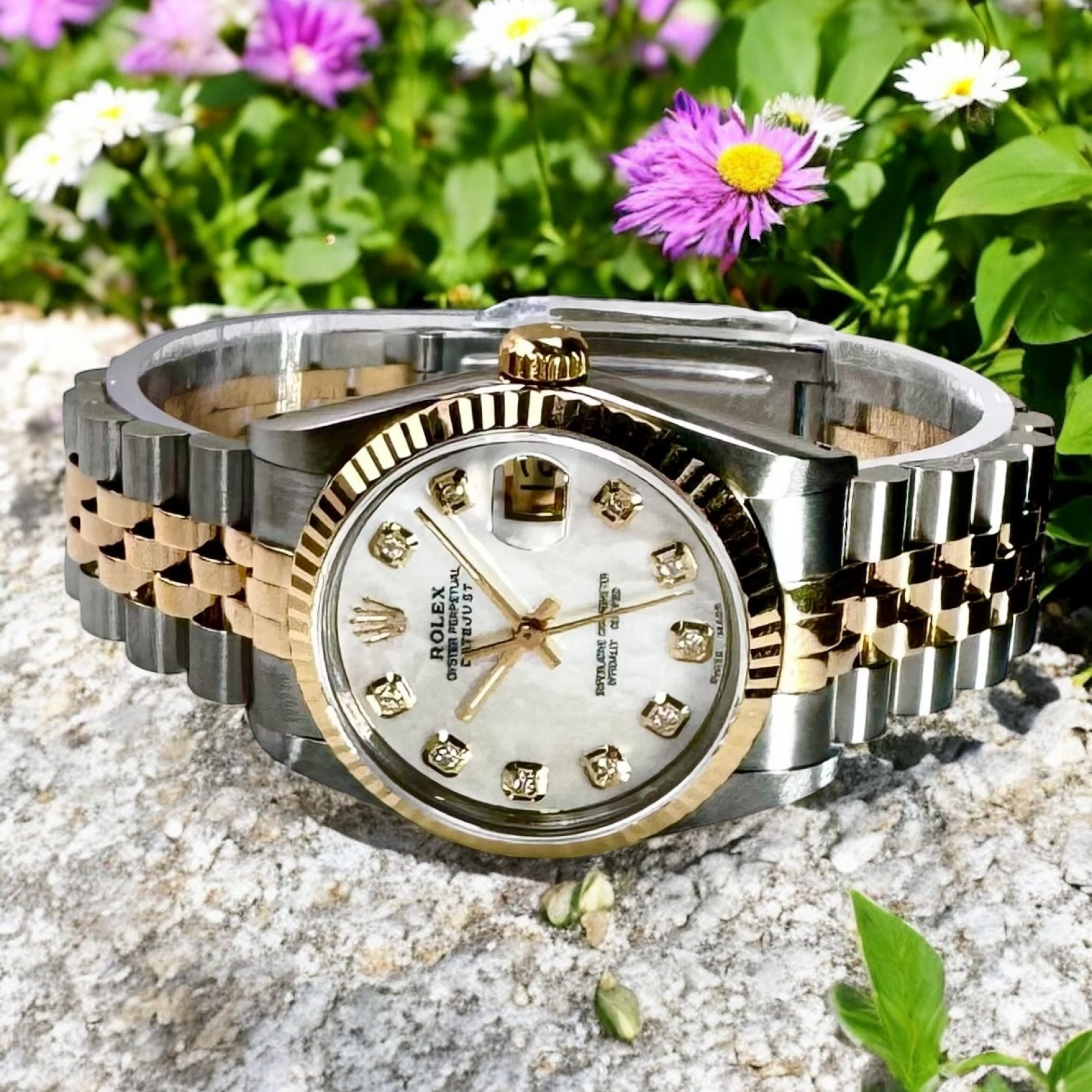 This mesmerizing timepiece is adorned with a magnificent custom Mother of Pearl Diamond Dial, flawlessly expressing the sacred amalgamation of technical prowess and aesthetic appeal that has consistently distinguished Rolex within the realm of luxury timepieces. The minute detailing meticulously etched onto the dial beckon and captivate the observer, revealing a complex microcosm of precision, elegance and superior craftsmanship that symbols the essence of prestige and sophistication linked with this internationally recognized manufacturer.