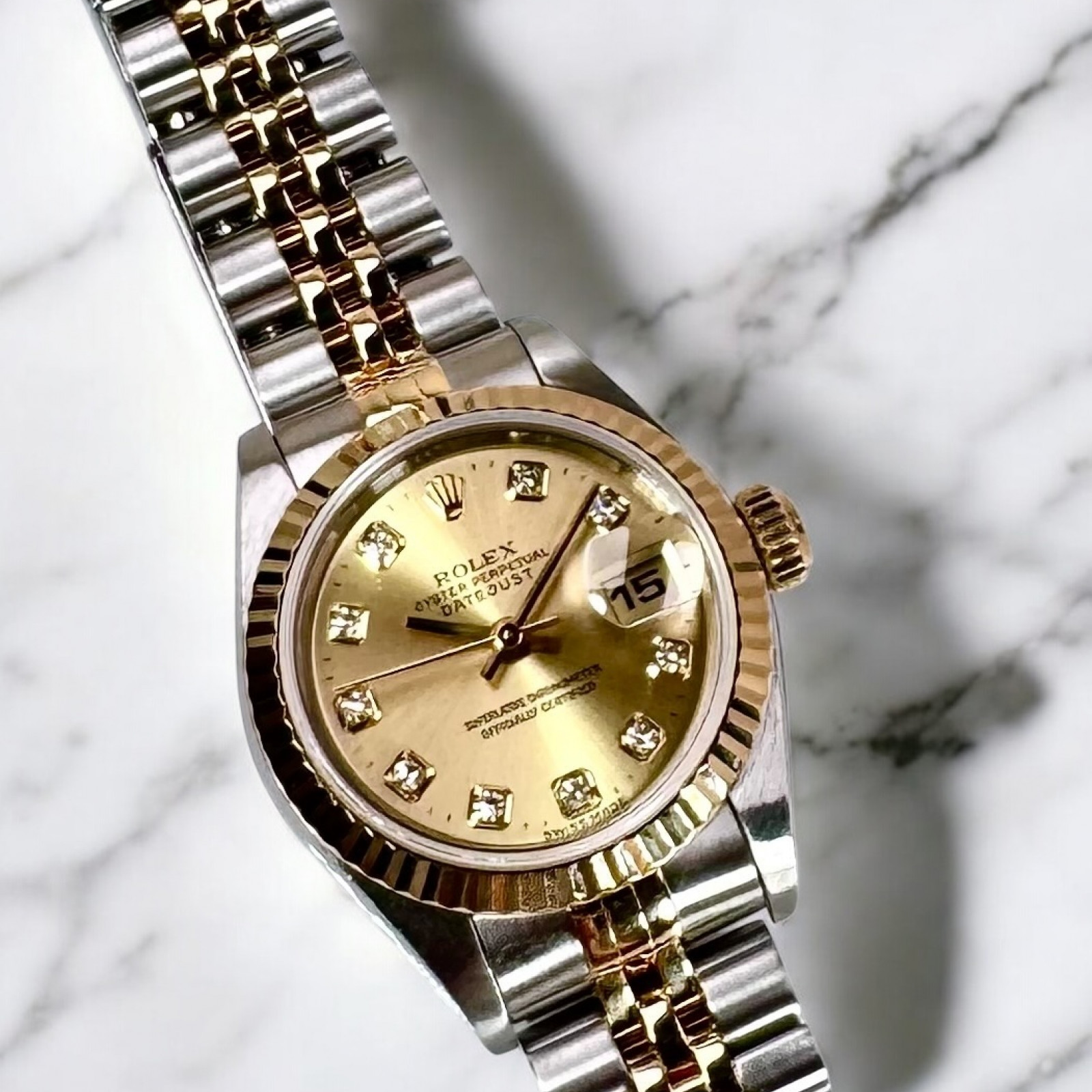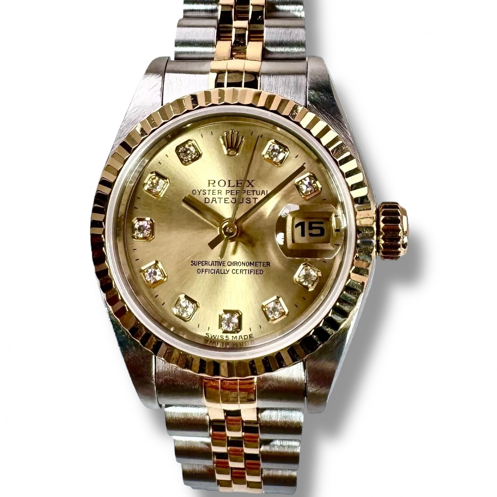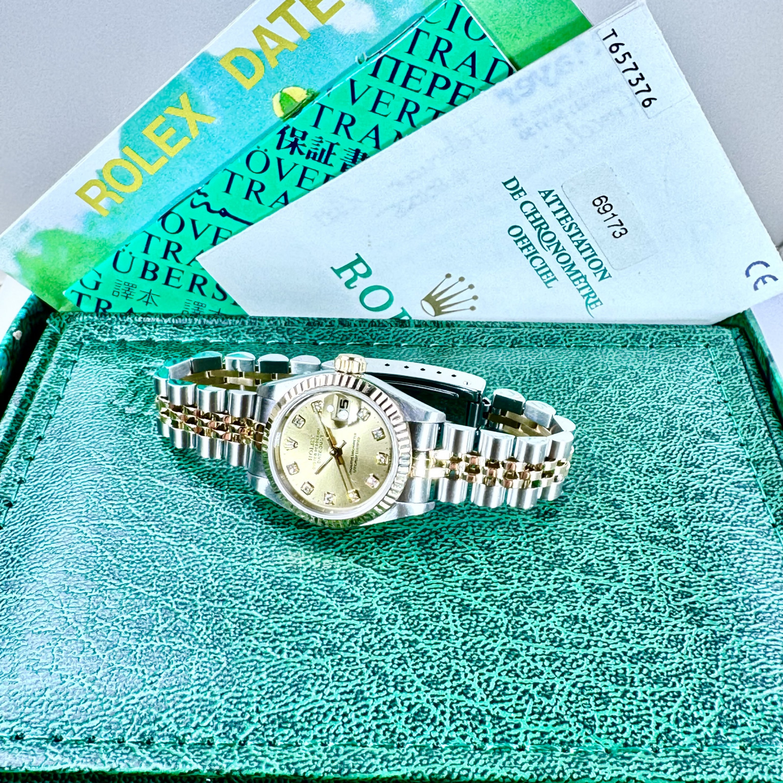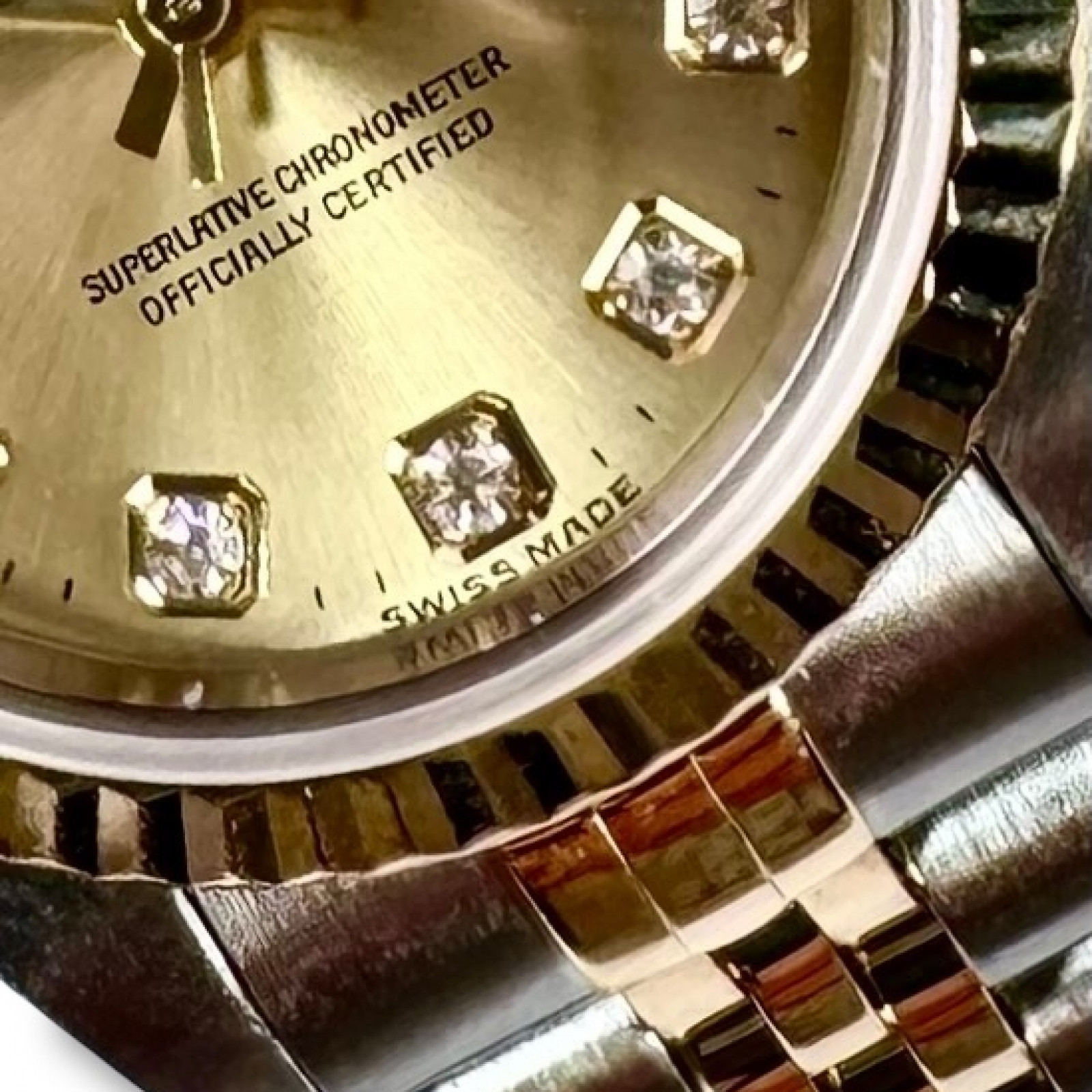 Step into a world of timeless elegance and remarkable excellence with the iconic Rolex 69173 Datejust and its radiant Champagne Diamond Dial. Not merely serving as an ornamental accessory, this prodigious luxury wristwatch is a testament to centuries of painstakingly curated expertise, meticulous precision, and unrivaled excellence that has catapulted Rolex to the pinnacle of horological mastery. The 69173 Datejust, bona fide to its celebrated repute, distinctively stands as a remarkable feat of Swiss craftsmanship, having been precisely serviced and dutifully maintained by adept Rolex technicians. This ensures that it embodies the perfect synergy of traditional artistry and contemporary prowess, delivering unerring, flawless performance consistently and reliably.