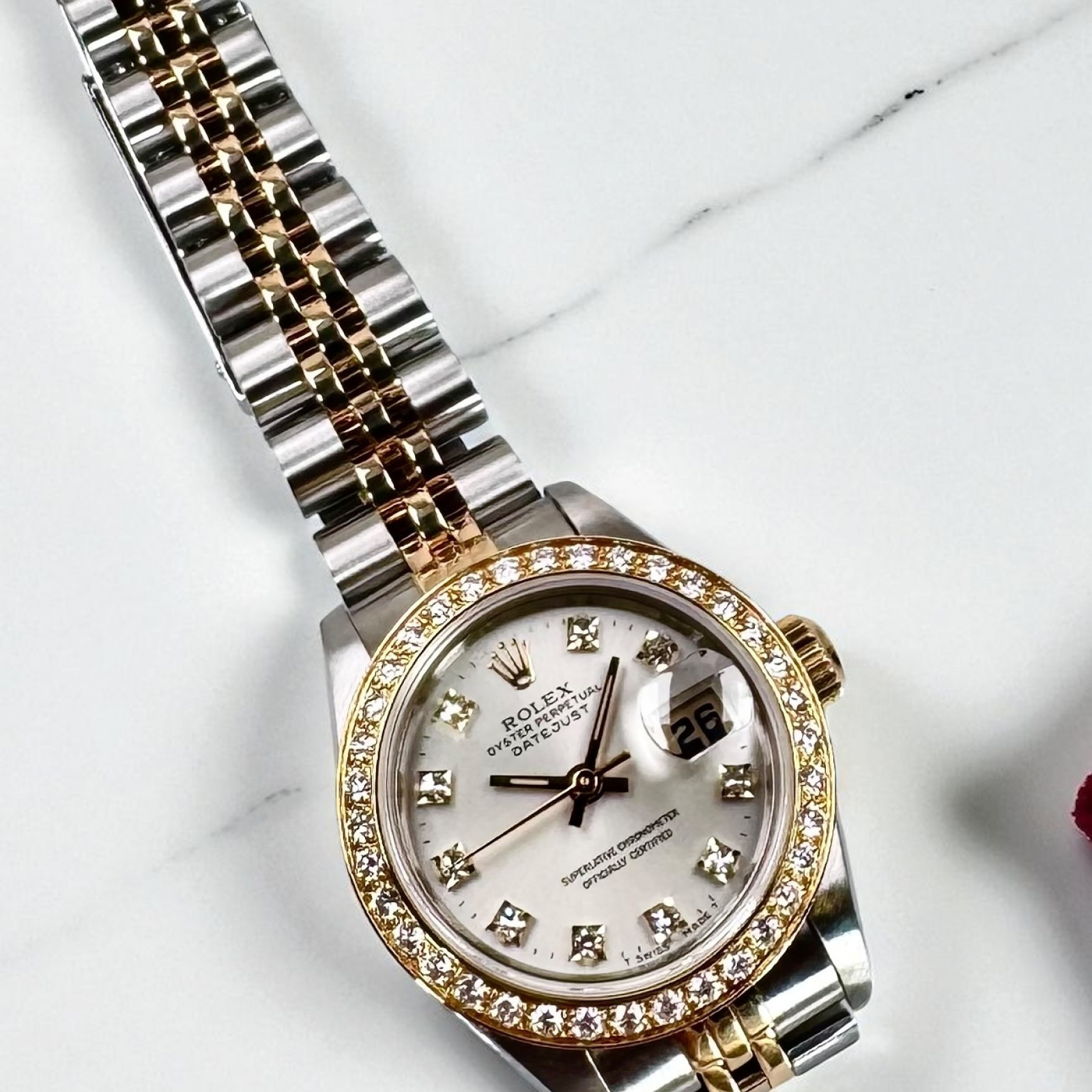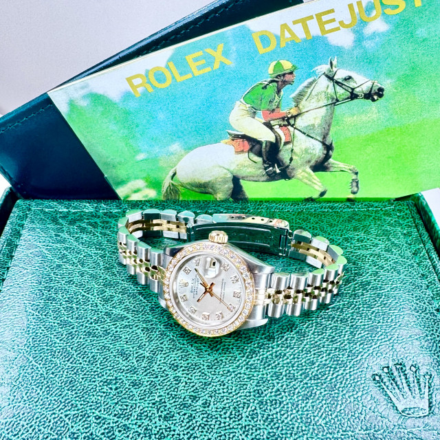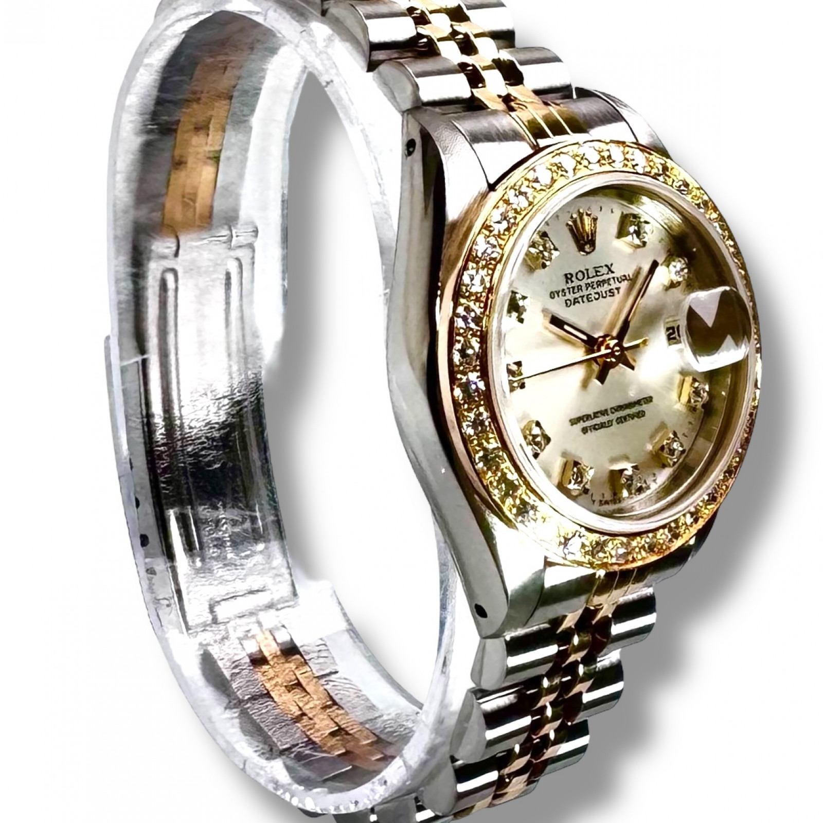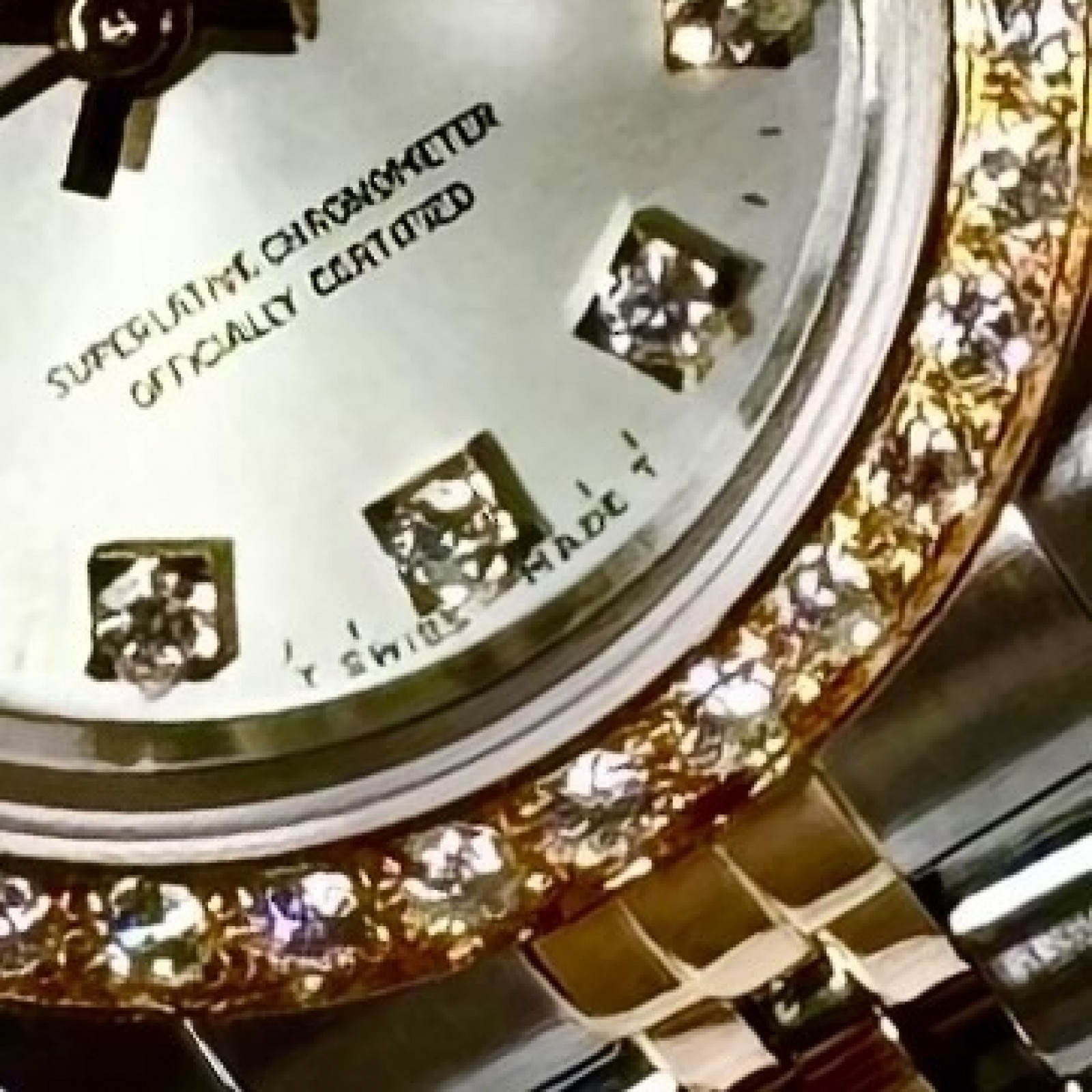 Introducing the incomparable Rolex 69173 Datejust, a true exemplar of timeless, luxury timepieces and an exceptional blend of style and function. At first glance, this timeless beauty boasts a factory Silver Diamond Dial complemented by an exquisite custom Diamond bezel, all housed within a casing that calls attention to its impressive craftsmanship.