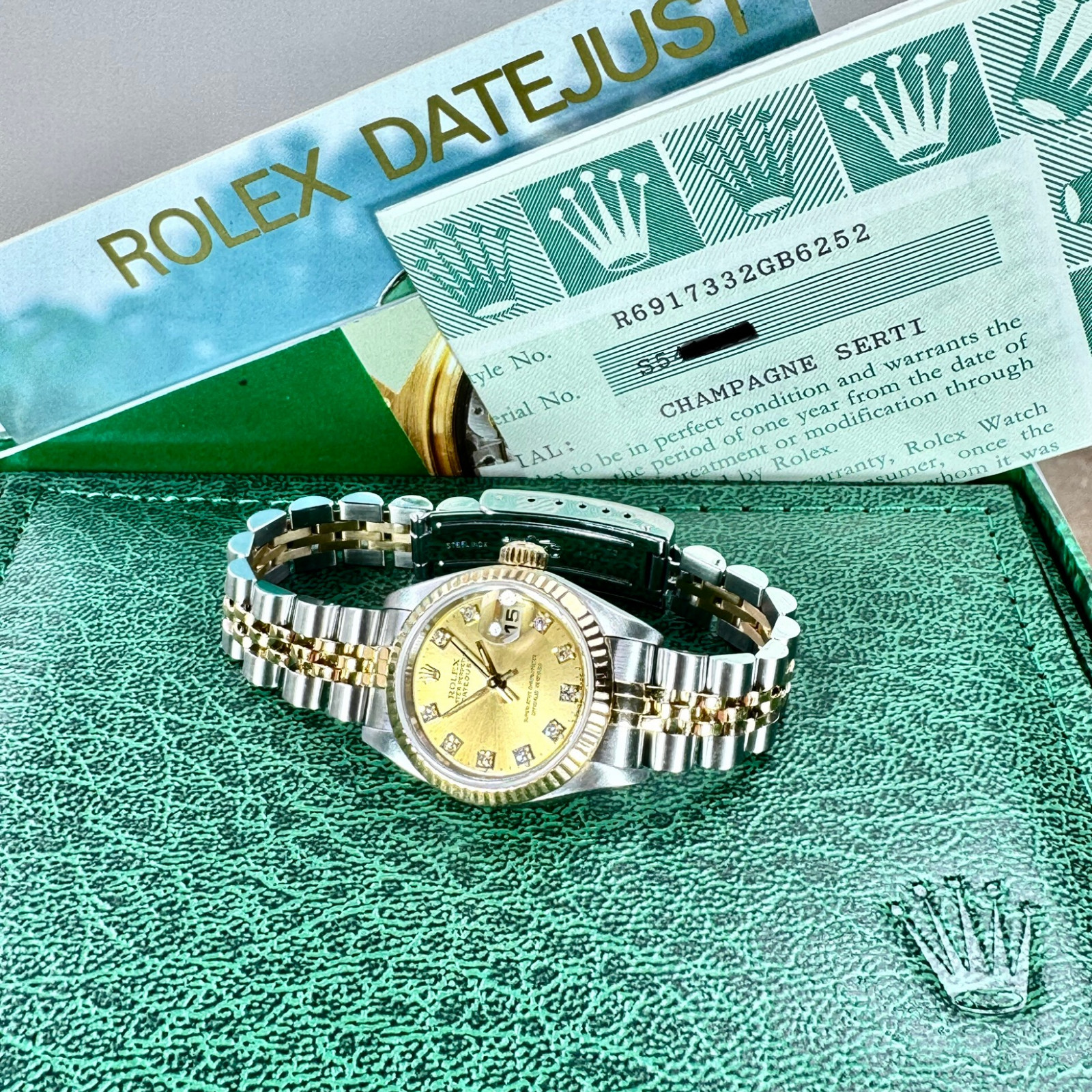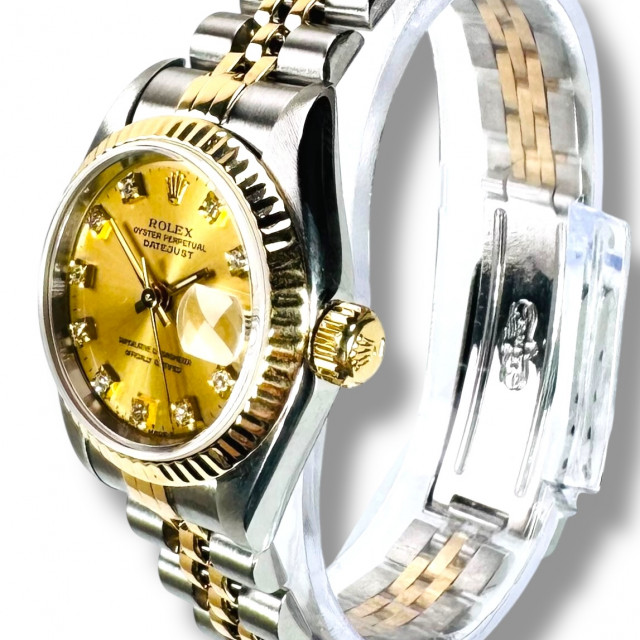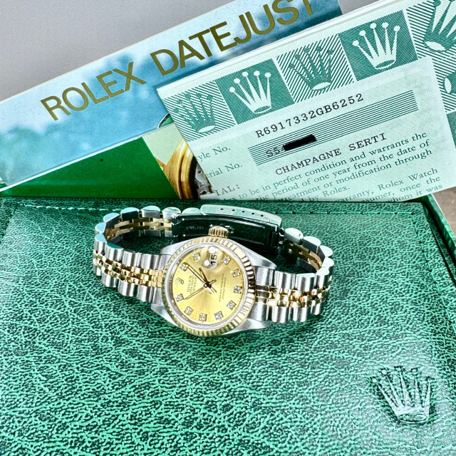 Step into a world of timeless elegance and remarkable excellence with the iconic Rolex 69173 Datejust and its radiant Champagne Diamond Dial. Not merely serving as an ornamental accessory, this prodigious luxury wristwatch is a testament to centuries of painstakingly curated expertise, meticulous precision, and unrivaled excellence that has catapulted Rolex to the pinnacle of horological mastery. The 69173 Datejust, bona fide to its celebrated repute, distinctively stands as a remarkable feat of Swiss craftsmanship, having been precisely serviced and dutifully maintained by adept Rolex technicians. This ensures that it embodies the perfect synergy of traditional artistry and contemporary prowess, delivering unerring, flawless performance consistently and reliably.