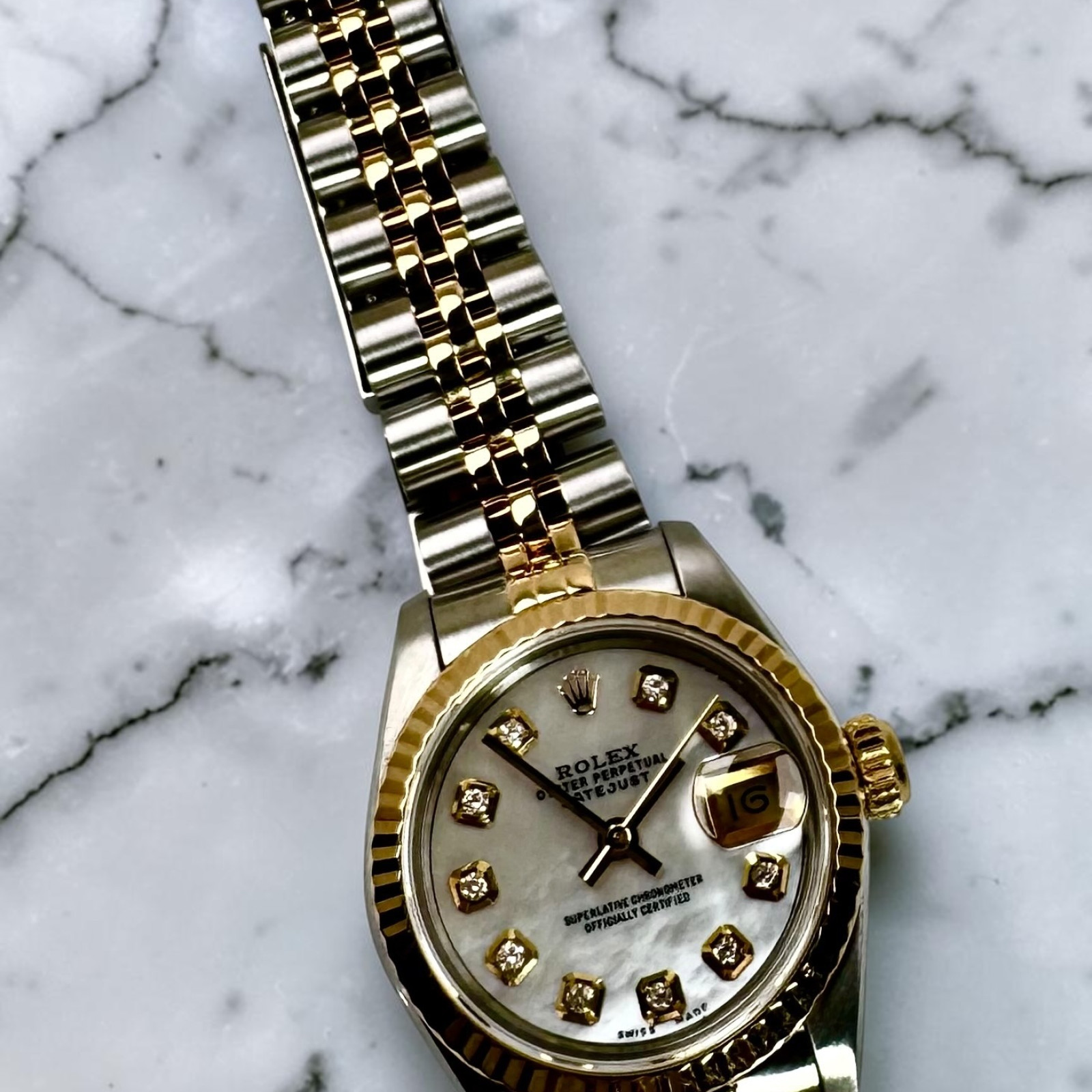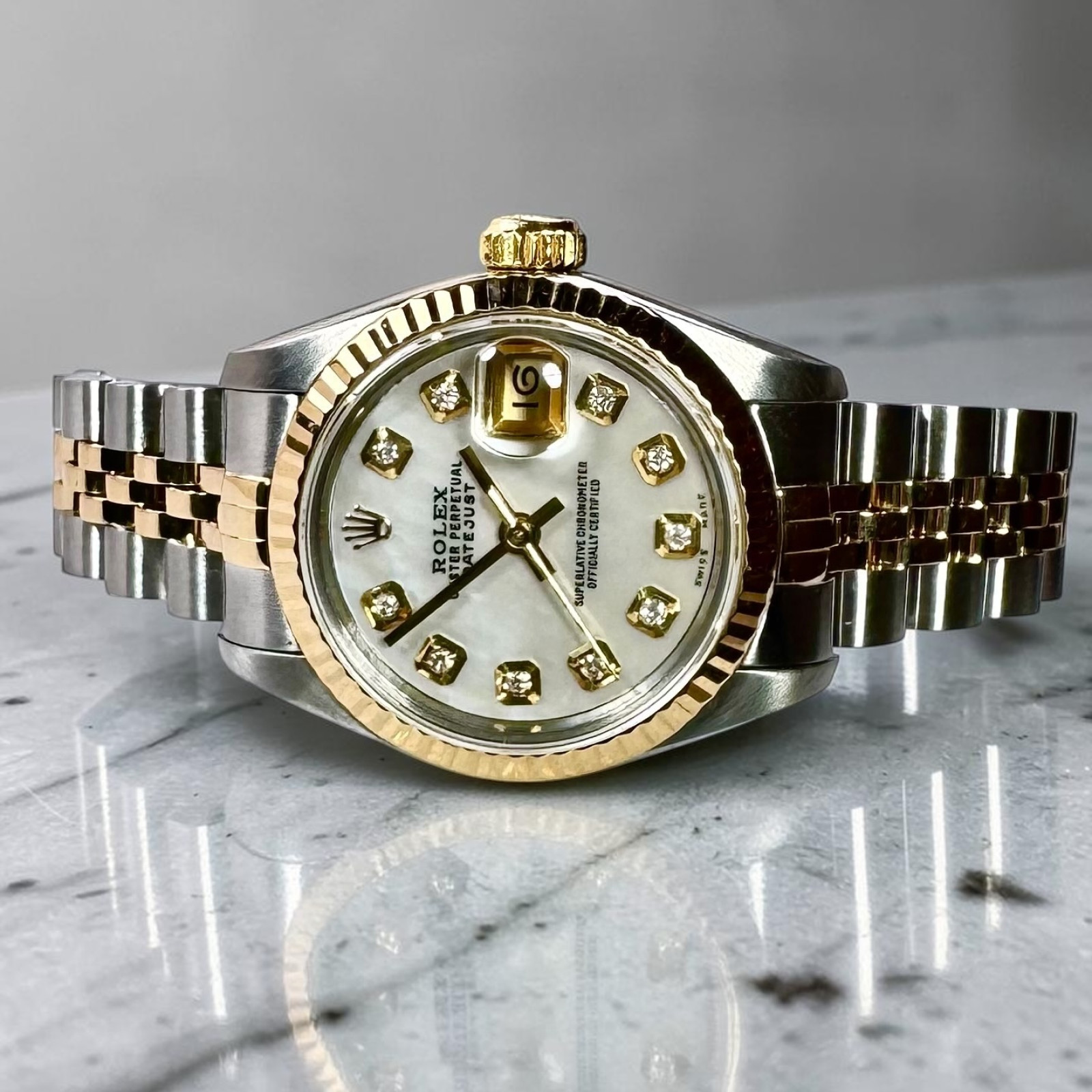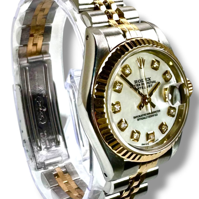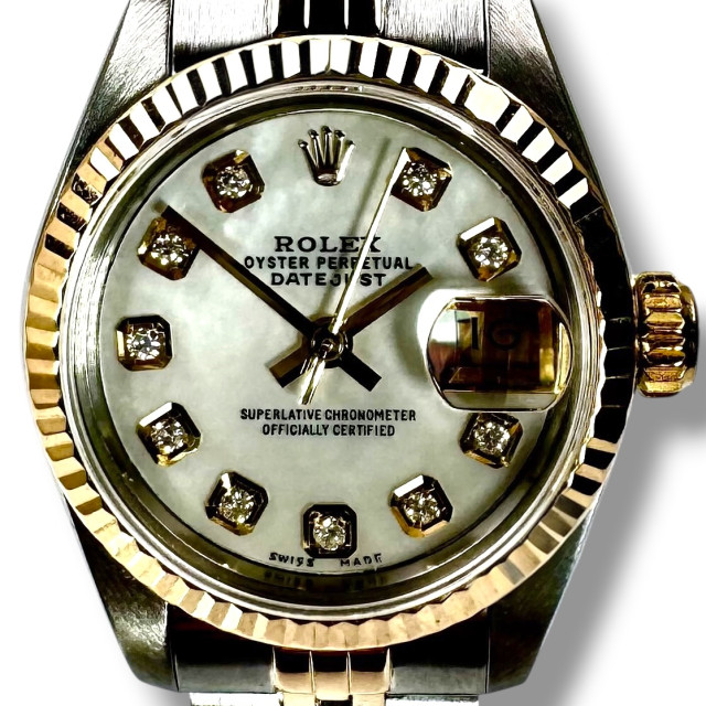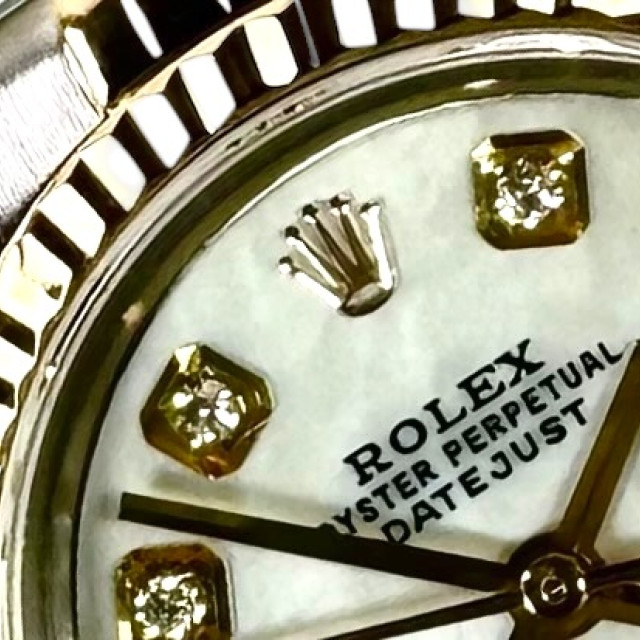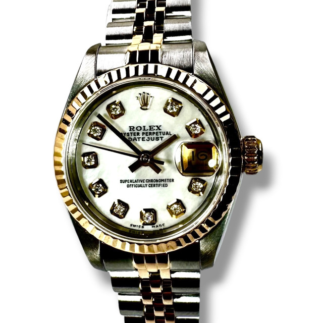 Delve deeper into the majestic realm of horological brilliance with the distinctive Rolex 69173 Datejust - an epitome of timeless elegance and superior craftsmanship that has long defined the iconic Rolex brand. This breathtaking timepiece stands as a testament to Rolex's rich legacy of refined aesthetic and meticulous precision. Its captivating allure is flawlessly encapsulated within a custom radiant Mother of Pearl diamond dial, which displays an undeniable grandeur and sophistication distinctly Rolex in character. The watch's immaculate condition reflects the devoted care and meticulous attention given to preserving its perfection over the years, thereby enhancing its alluring charm and covetous appeal.