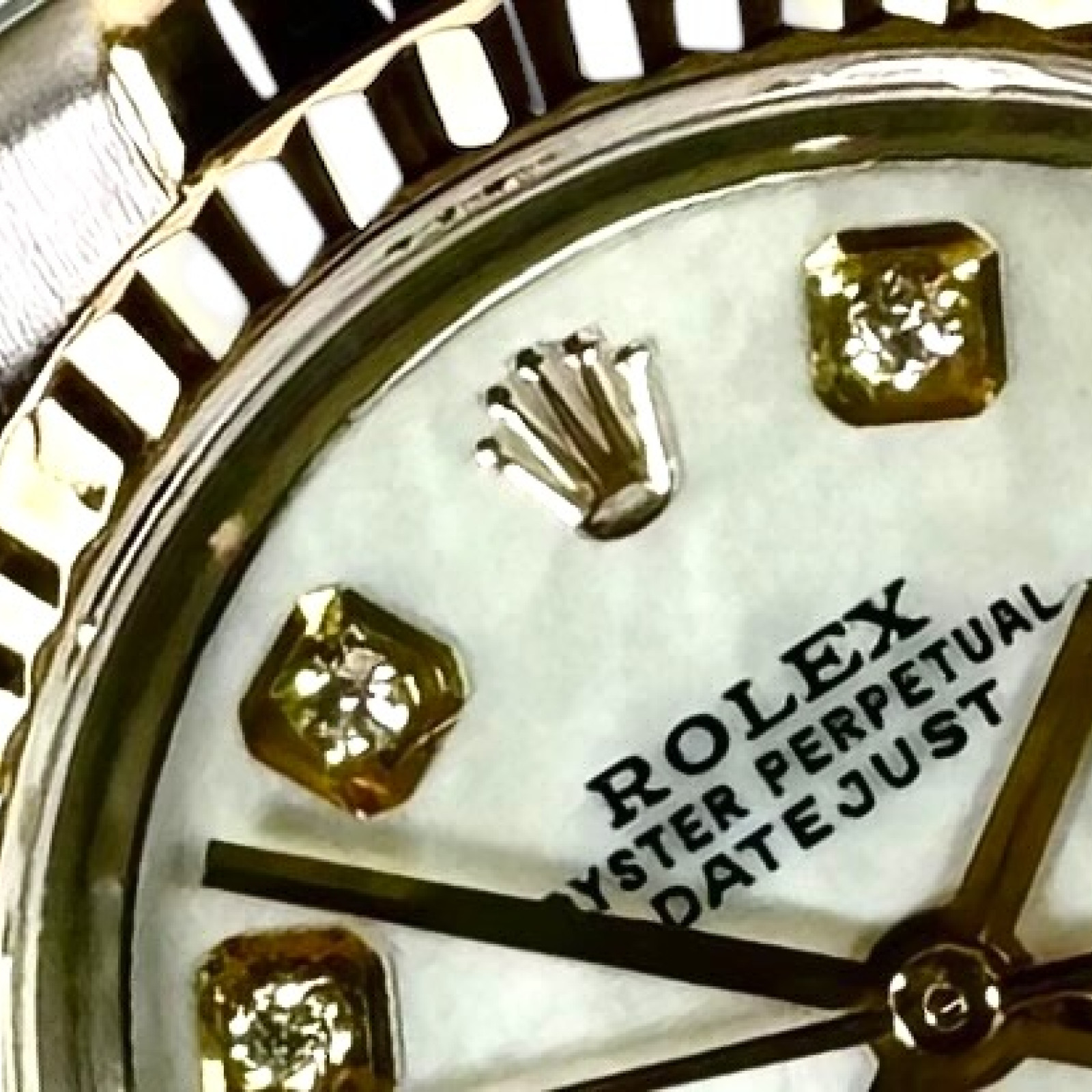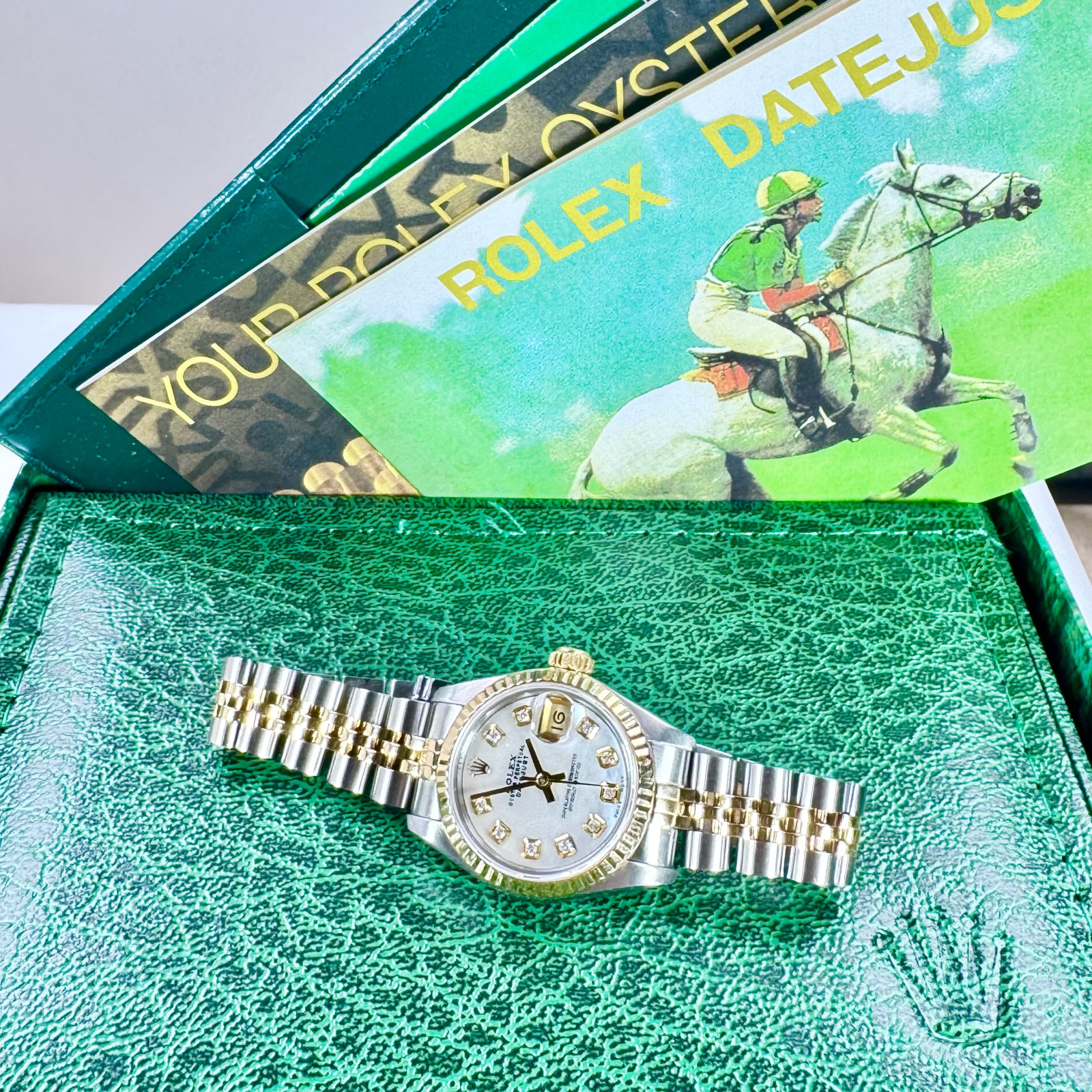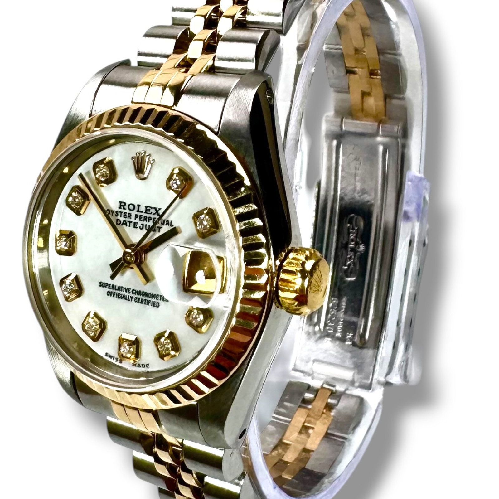 Delve deeper into the majestic realm of horological brilliance with the distinctive Rolex 69173 Datejust - an epitome of timeless elegance and superior craftsmanship that has long defined the iconic Rolex brand. This breathtaking timepiece stands as a testament to Rolex's rich legacy of refined aesthetic and meticulous precision. Its captivating allure is flawlessly encapsulated within a custom radiant Mother of Pearl diamond dial, which displays an undeniable grandeur and sophistication distinctly Rolex in character. The watch's immaculate condition reflects the devoted care and meticulous attention given to preserving its perfection over the years, thereby enhancing its alluring charm and covetous appeal.