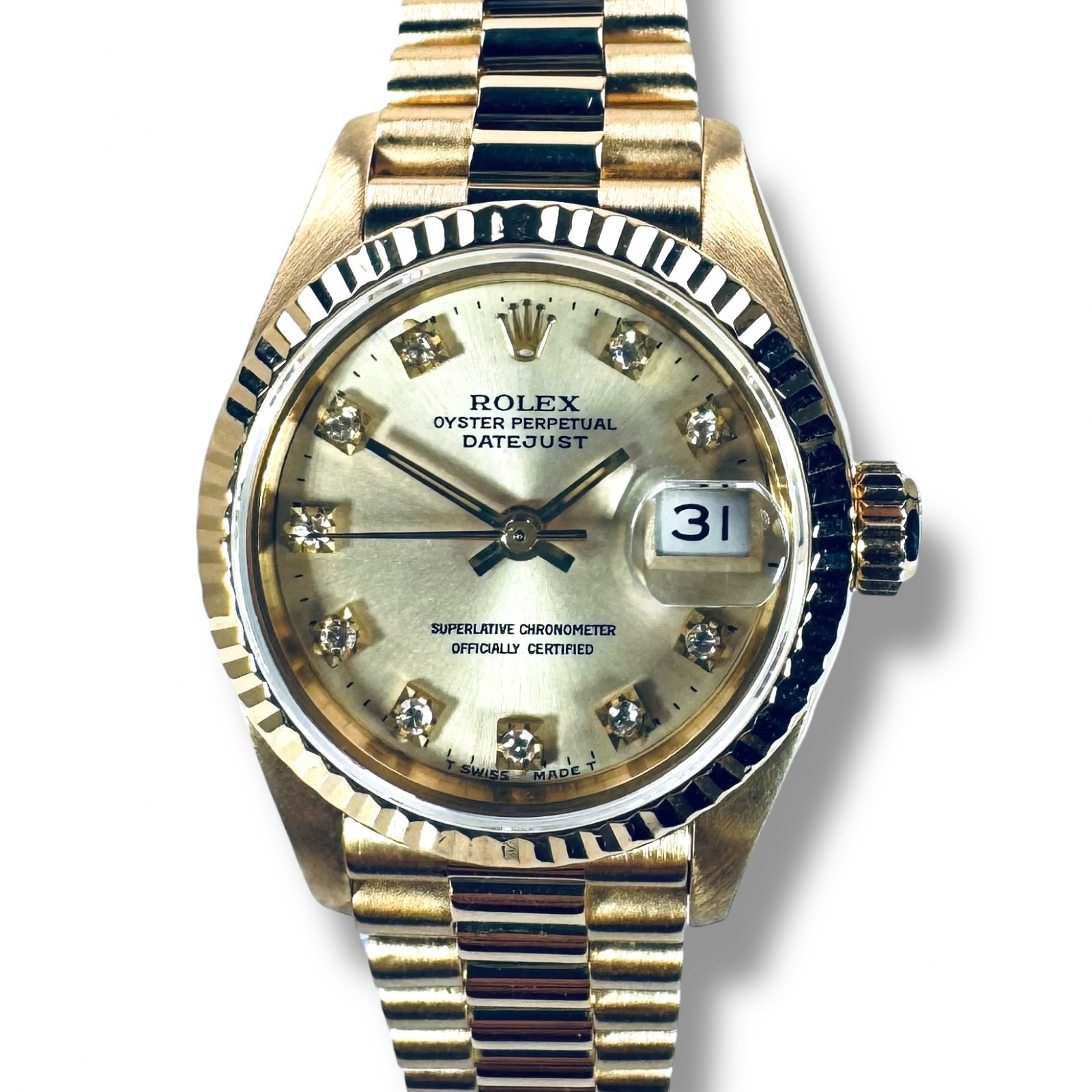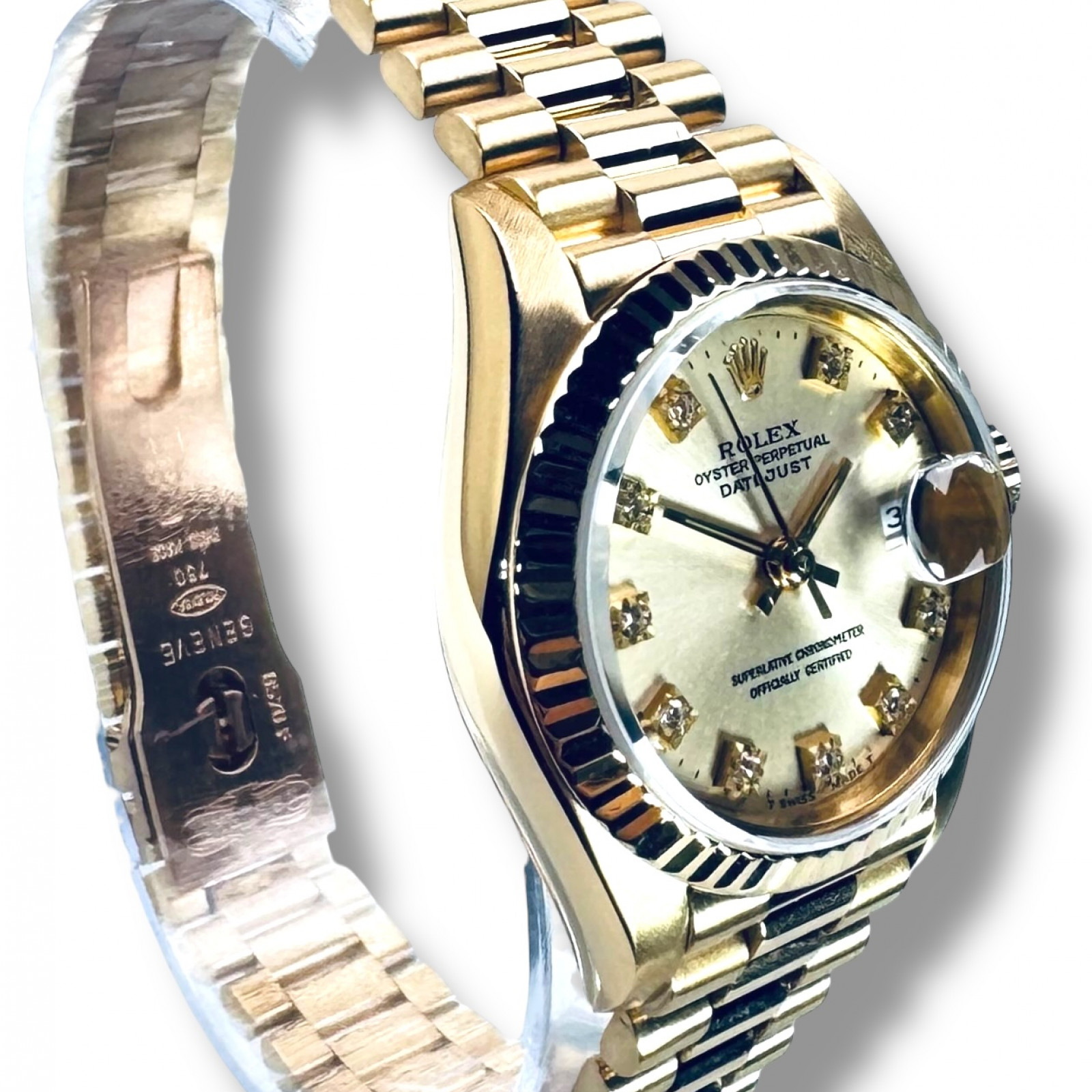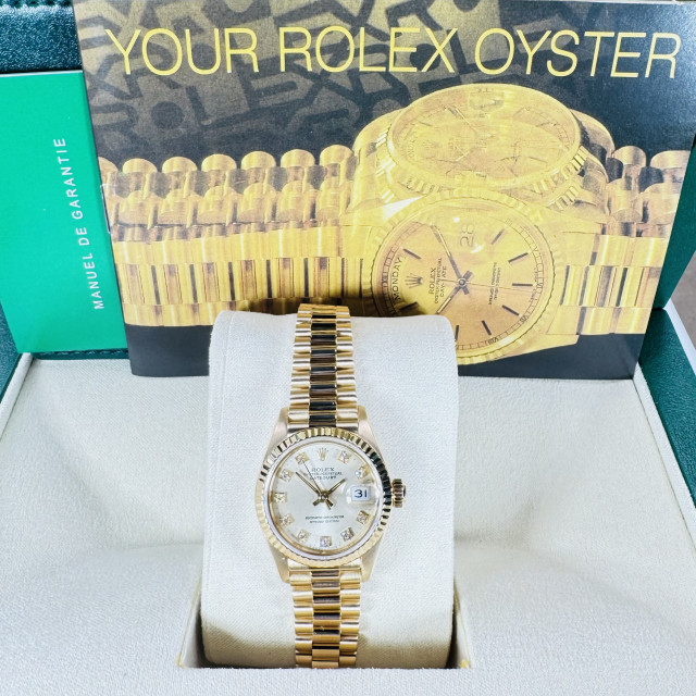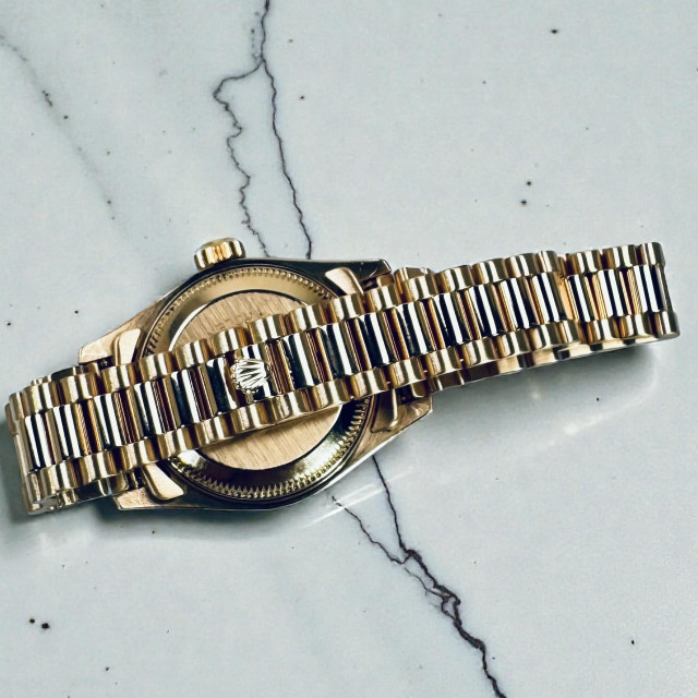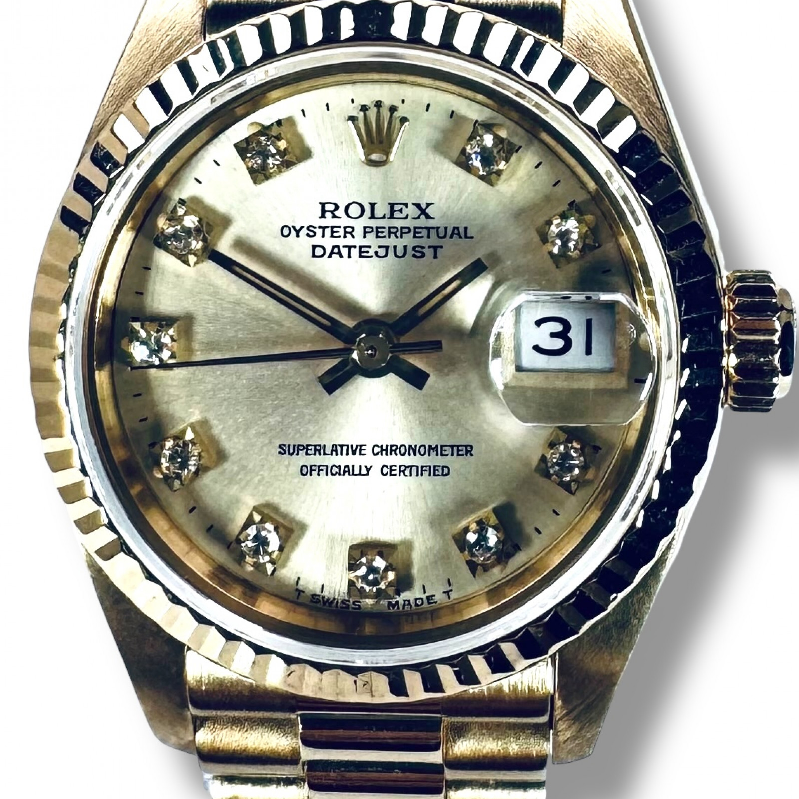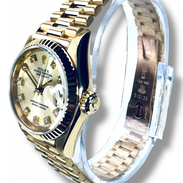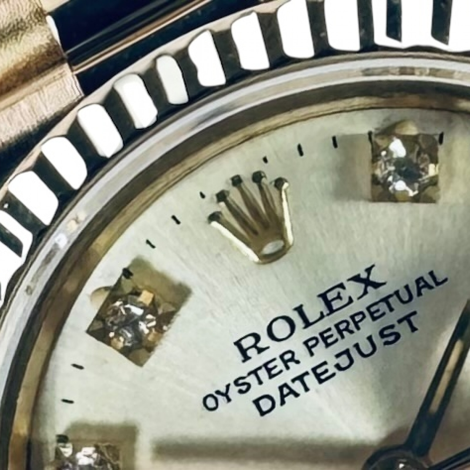Mirroring the durable spirit of its interior mechanisms, the Rolex Model 69178 Diamond Watch is flawlessly fashioned from a solid substance of premium 18-carat gold. This superior metal alloy not only confers immense longevity but also exudes an exquisite aesthetic patina that considerably amplifies the watch's overall appeal.