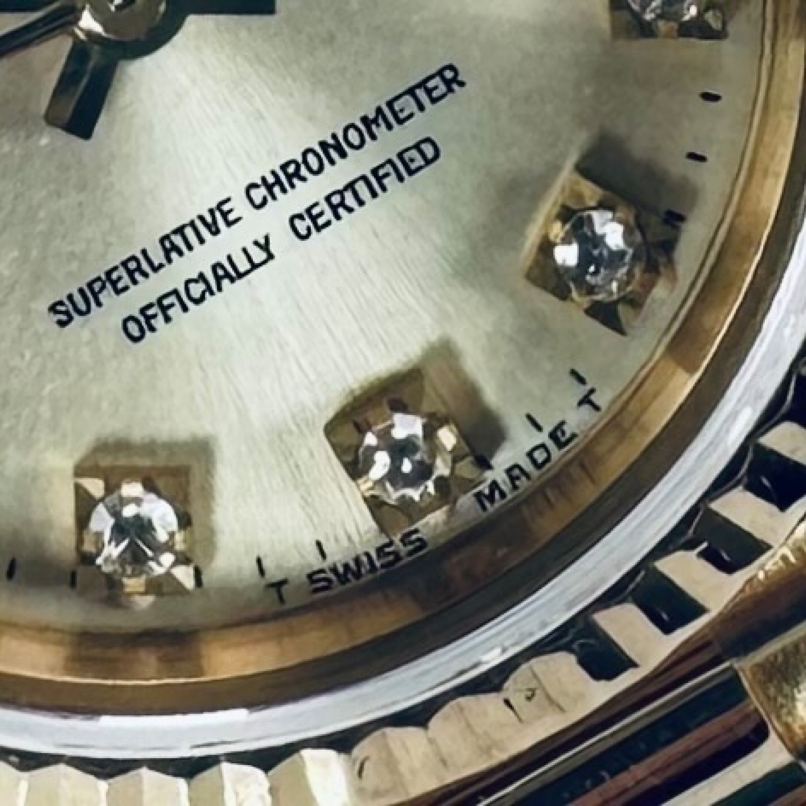 The Rolex Model 69178 Diamond Watch also offers a power reserve capacity of up to 44 hours. The automatic, perpetual movement highlights the watch's self-winding attribute, thereby exempting the wearer from the chore of manual winding and ensuring unfailing accuracy in timekeeping.