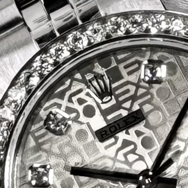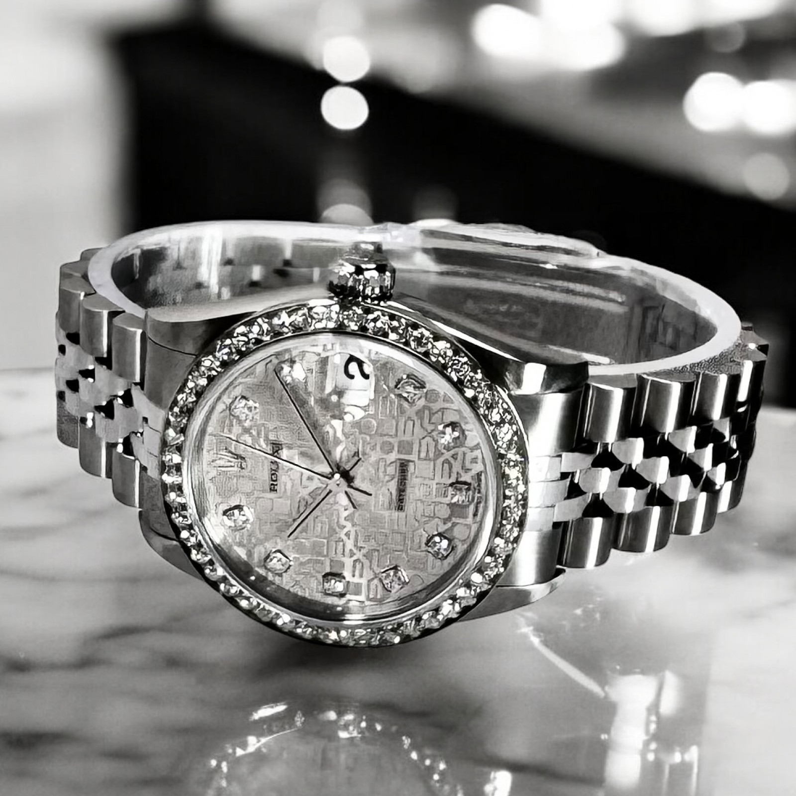 The uniqueness of this particular Rolex watch is accentuated by its custom Diamond bezel, masterfully crafted to perfection, adding an element of opulence and grandiosity to this outstanding piece. This feature significantly enhances the watch's visual appeal and makes it stand out among other luxury timepieces.