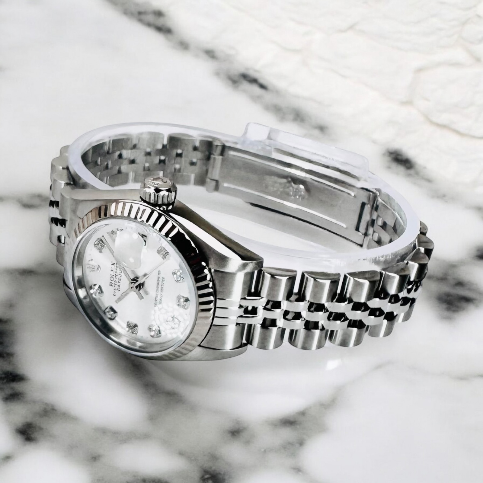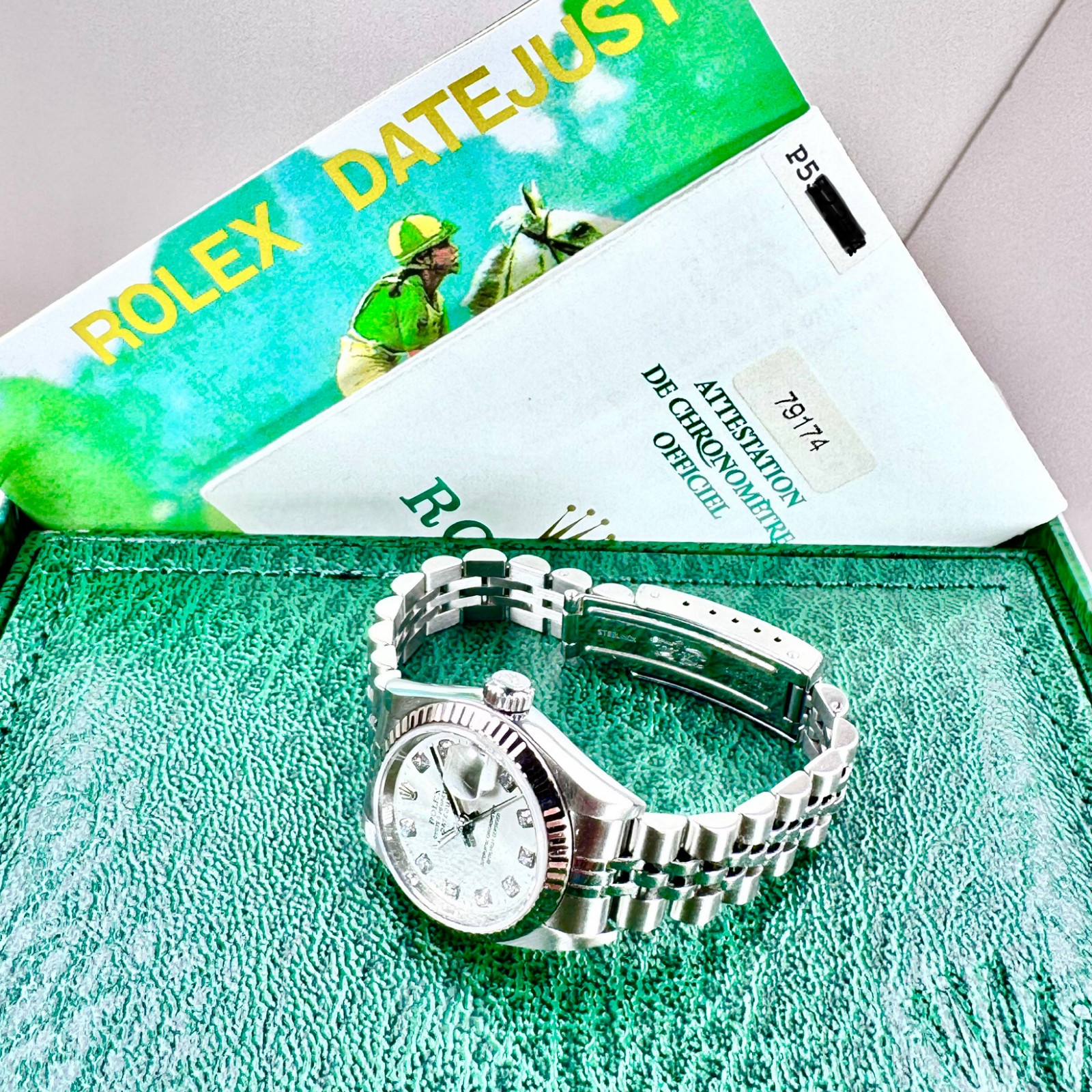 Delve deeper into the eminent splendor of Rolex with the seductively sophisticated and impeccably designed 79174 Datejust model. This illustrious wristpiece, gloriously adorned with a mesmerizing silver diamond dial, is meticulously crafted to ensnare your gaze and captivate your senses. Hailing from the globally acclaimed deluxe watch manufacturer Rolex, this iconic timepiece remains in an enviable state of prime, almost crystal-like condition; a testament to its intensive care and meticulous preservation. Rest assured, it has been thoroughly serviced with the utmost care to certify its flawless performance and unrivaled reliability. It's worth noting that the Rolex Datejust 79174 stands tall as it proudly flaunts the eminent heritage of the legendary Datejust lineage, thus establishing itself as a distinctive titan in the sprawling cosmos of horological masterpieces.