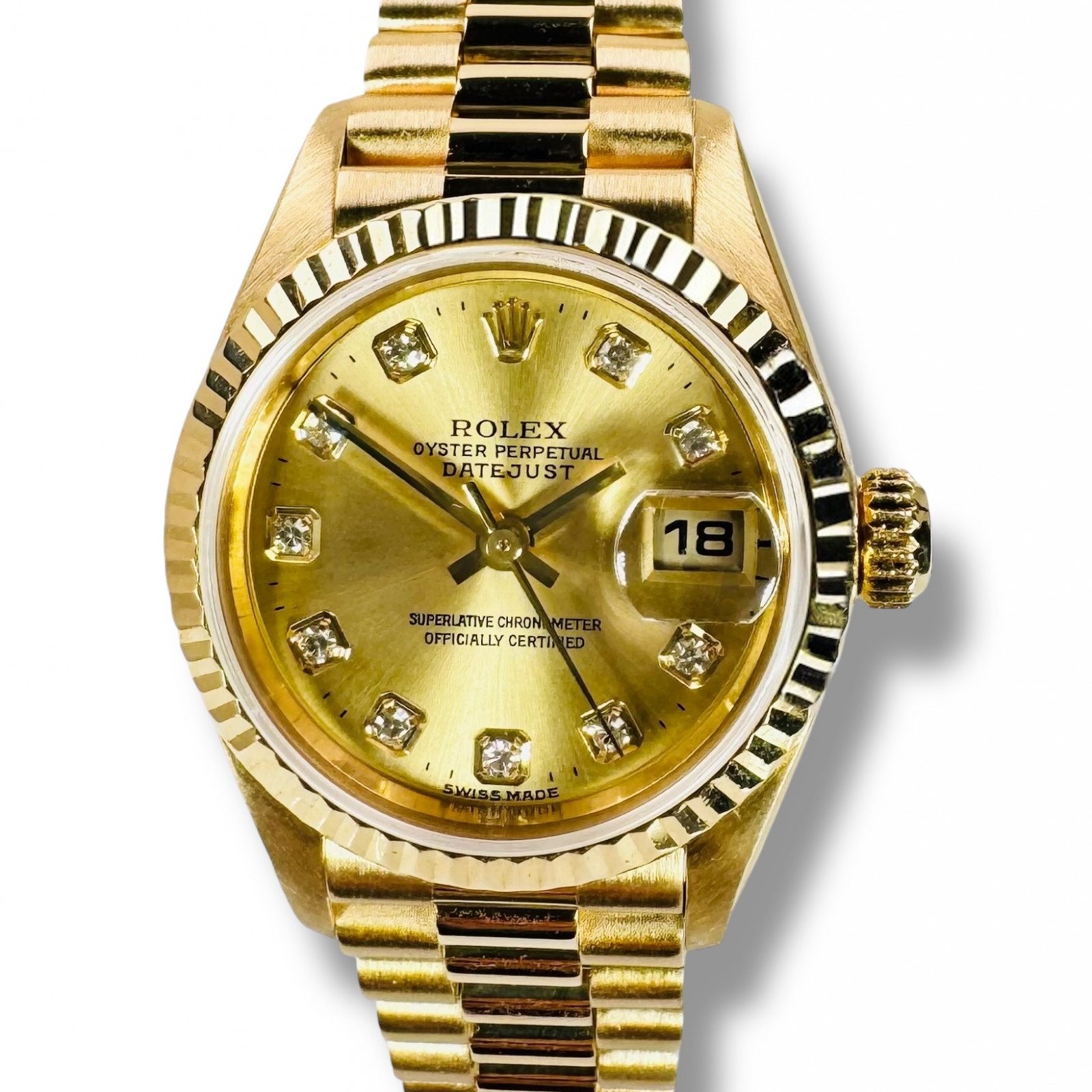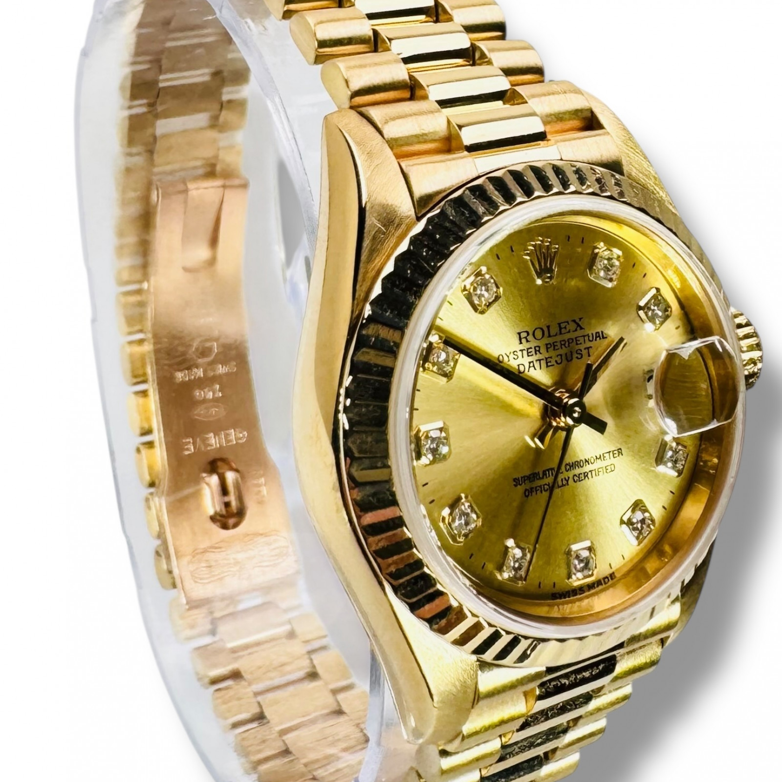 Presenting the luxurious Rolex President watch model number 79178, which is a symbol of prestige and sophistication. The stunning timepiece highlights a radiant Champagne Diamond dial that catches the eye instantly. This Rolex model was produced in the year 2003, making it an exquisite piece for those who have an inclination for vintage watches.