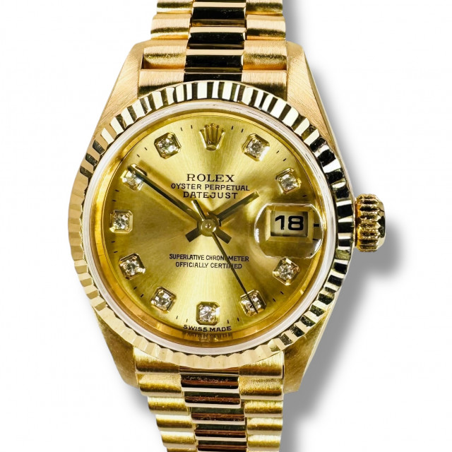 The Rolex President 79178 proudly flaunts its meticulously embedded diamond markers on the Champagne Diamond dial, adding a touch of elegance and refinement to its overall aesthetics. Precisely engineered, this Rolex watch embodies the exemplary craftsmanship synonymous with the esteemed Rolex brand.