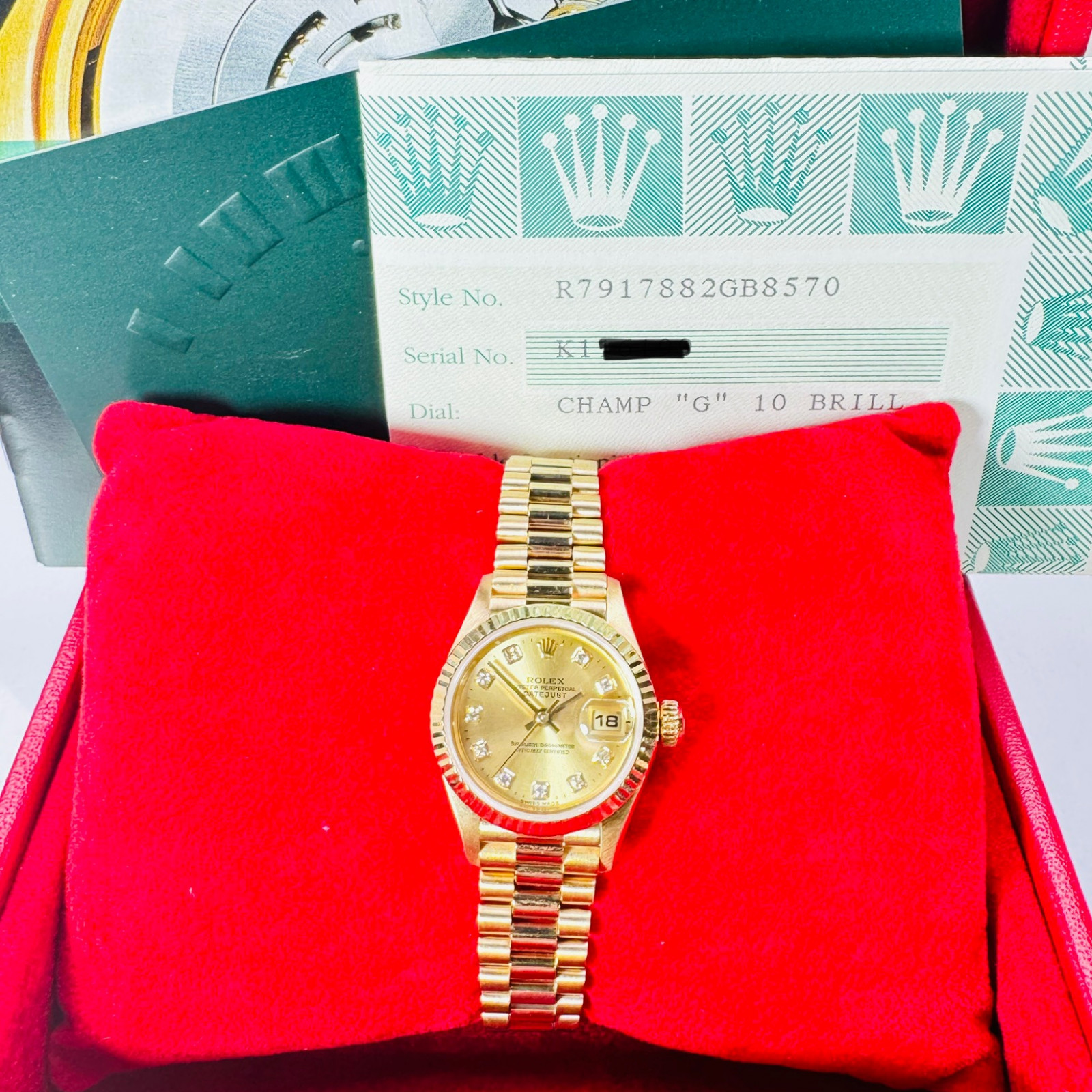 This jewel of horology is a full set offering, accompanying its original Rolex box and official papers. The box is a testament to Rolex's attention to detail while the authentication papers signify its authentic heritage. The Rolex President 79178 Champagne Diamond Dial would be a charming addition to any watch collection or could be a perfect gift for special occasions.
