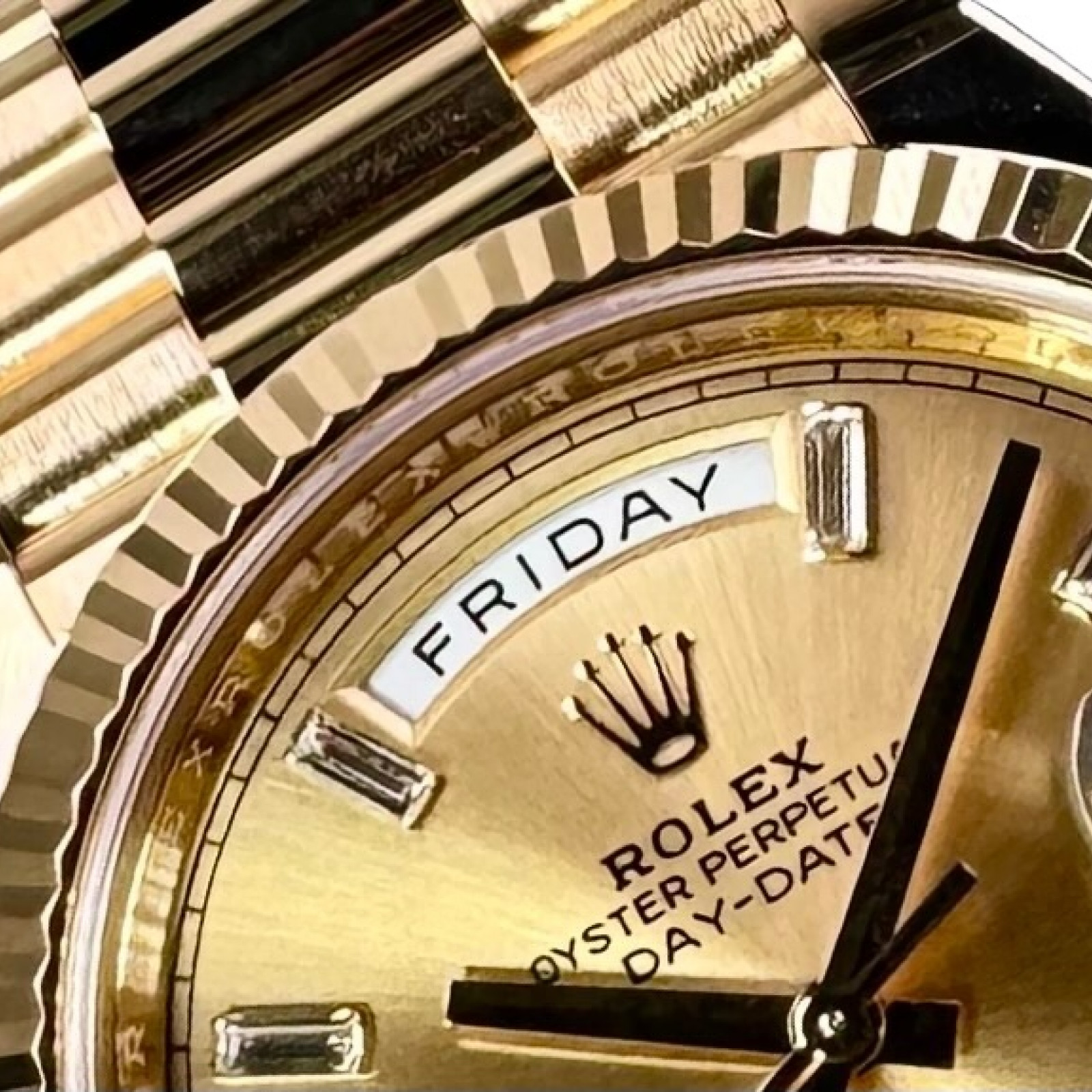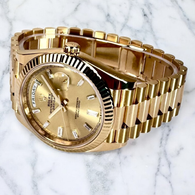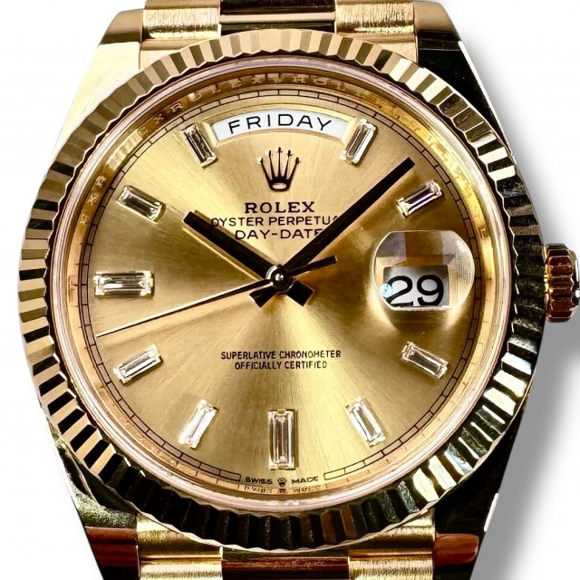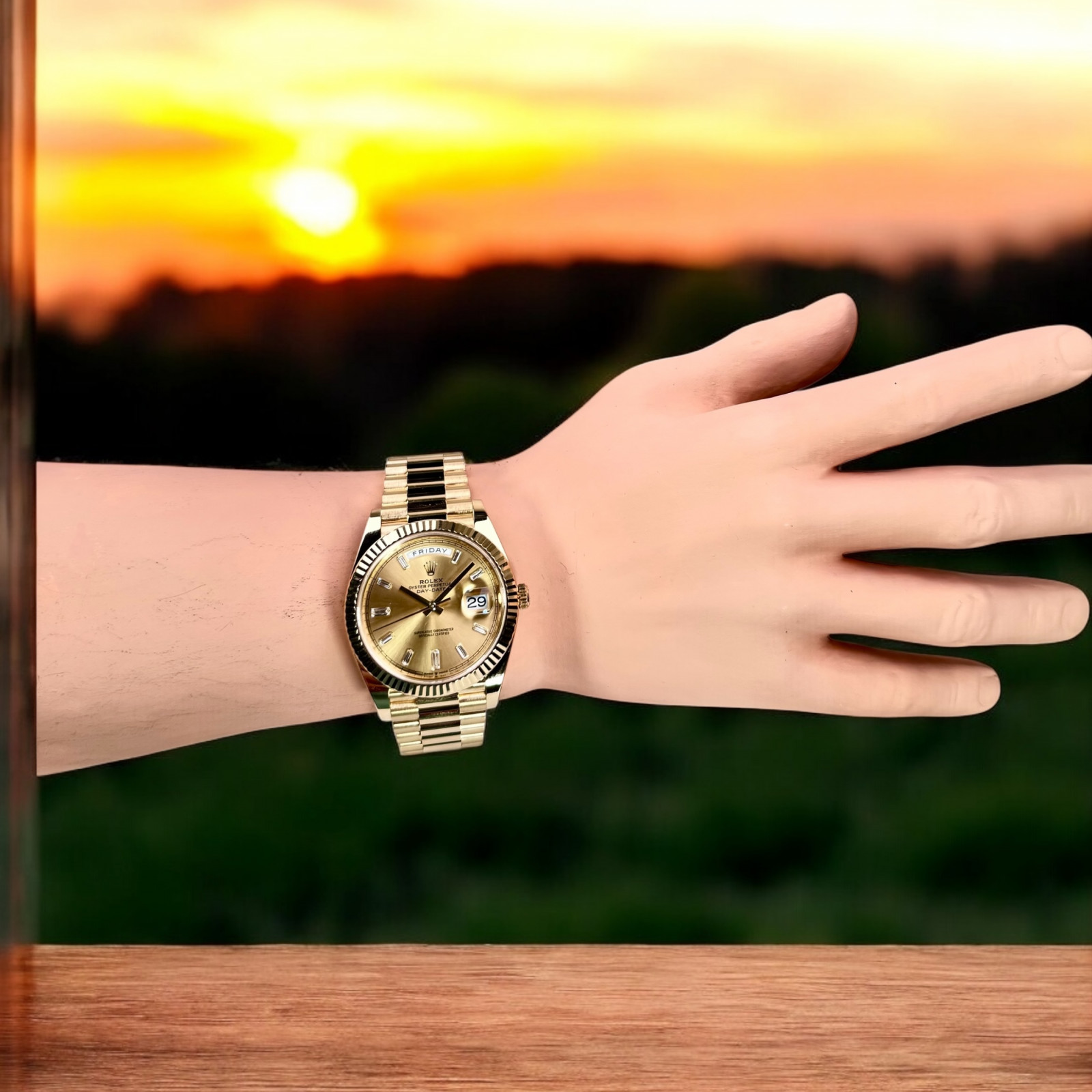 At the heart of this emblematic timepiece lies its meticulously designed 18-karat gold, 40 mm case, adorned with a beautifully fluted bezel. The rich hue of the gold gives a timeless appeal to the watch and underlines Rolex's continuous commitment to perfection and detail. The size of the case offers a confident presence on the wrist, making sure it doesn't go unnoticed.