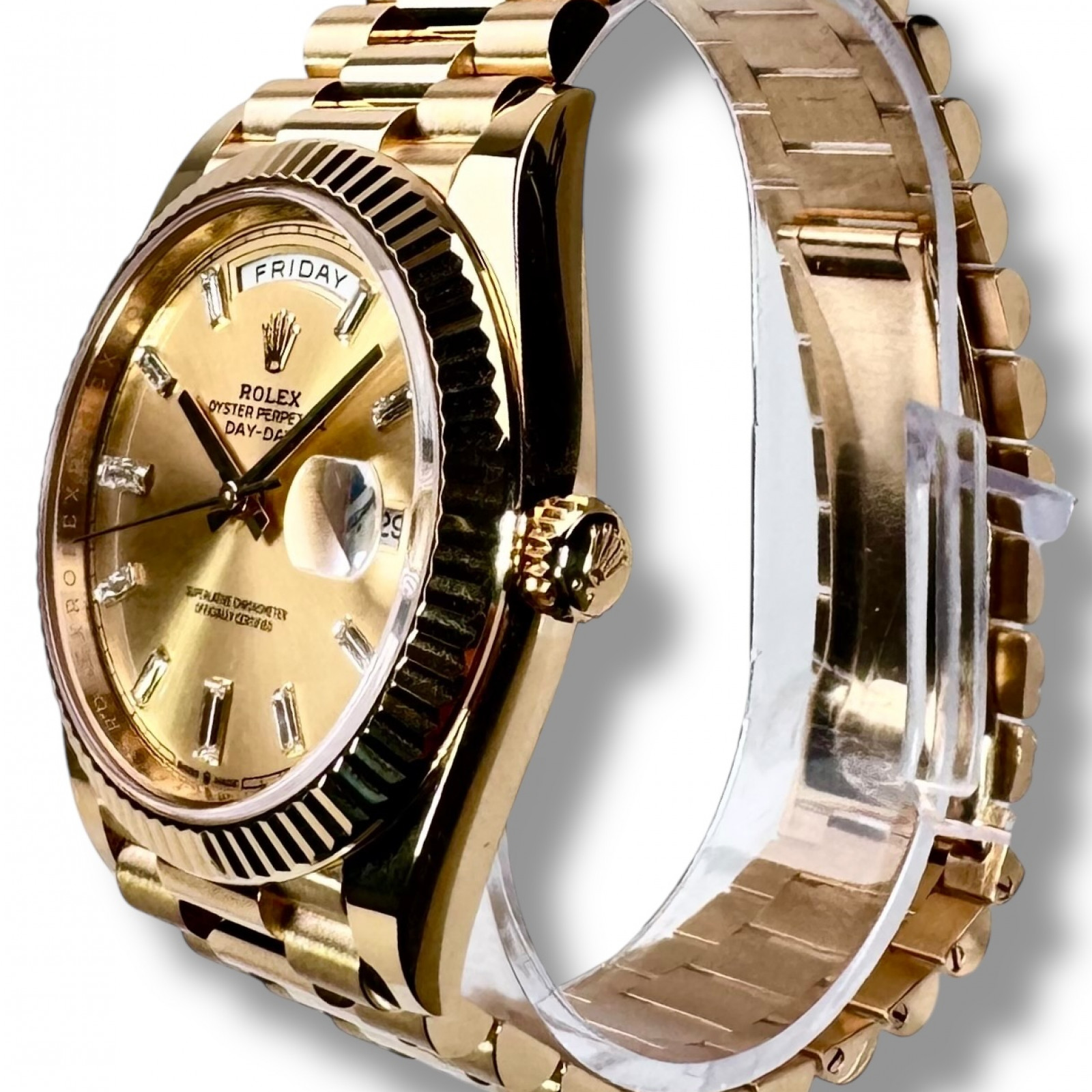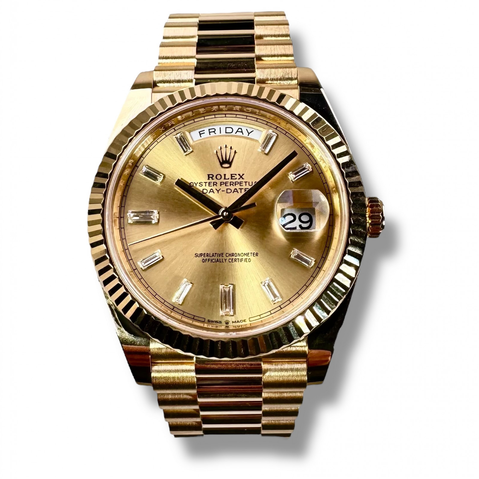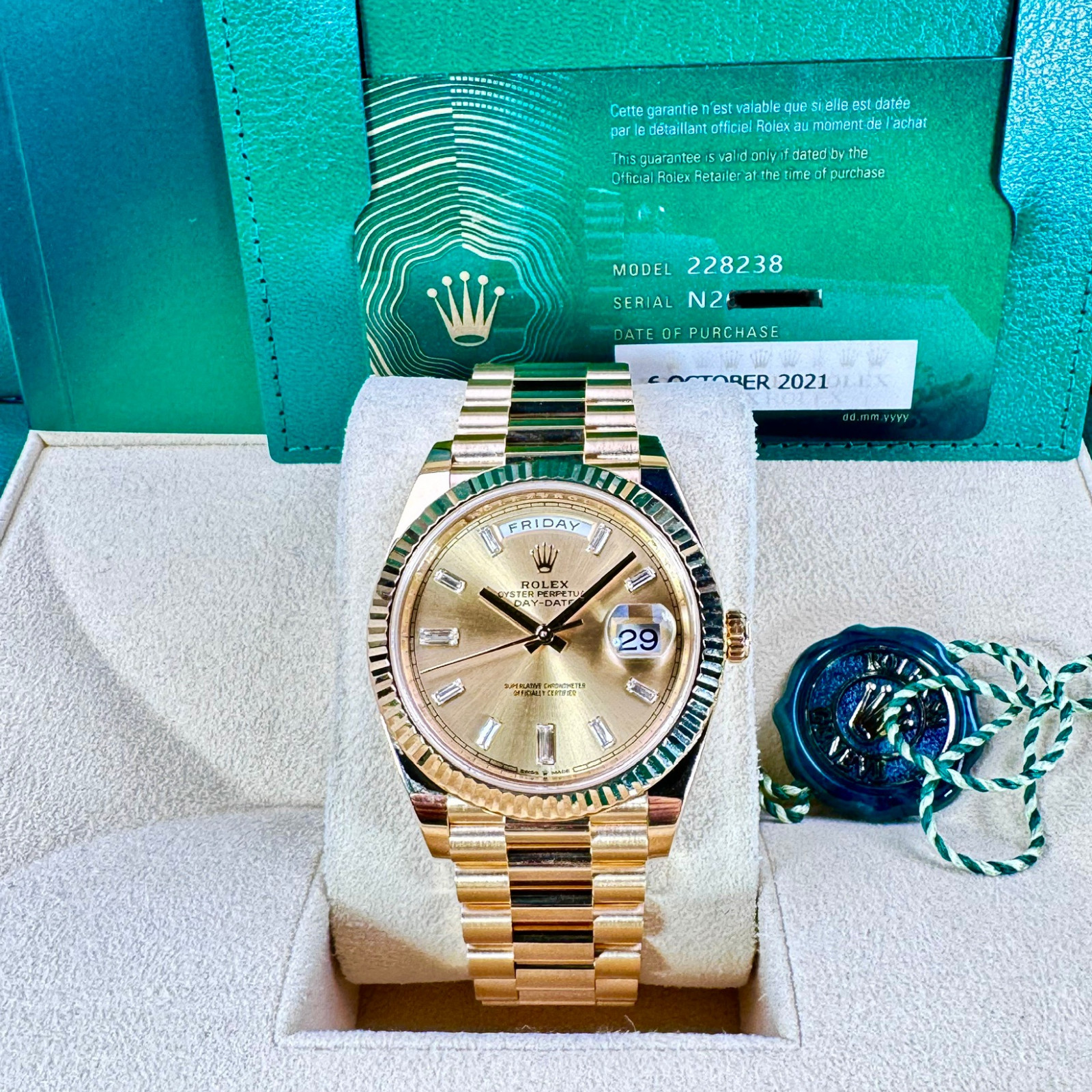 Introducing the captivating Rolex 228238 - a luxurious timepiece that presents a perfect blend of exceptional craftsmanship and world-class performance. This classic piece, recognized for its refined design and superior quality, stands out with its distinctive Champagne Diamond Baguettes Dial, adding a touch of elegance and sophistication to both formal and casual attire.