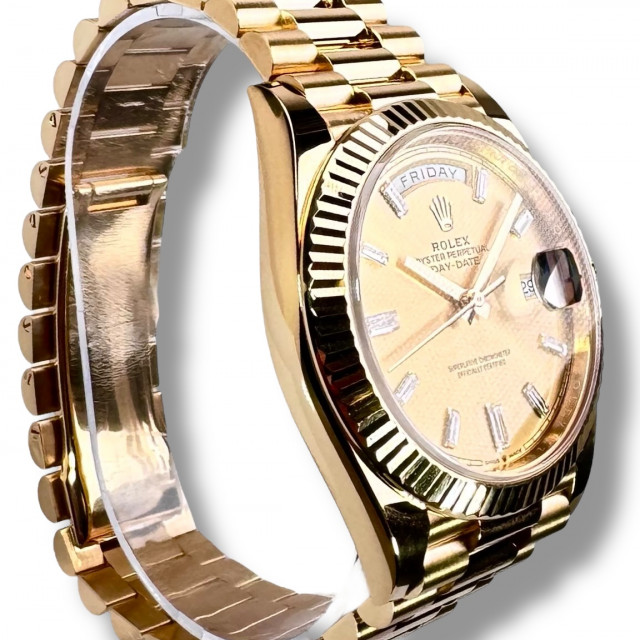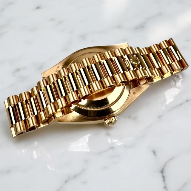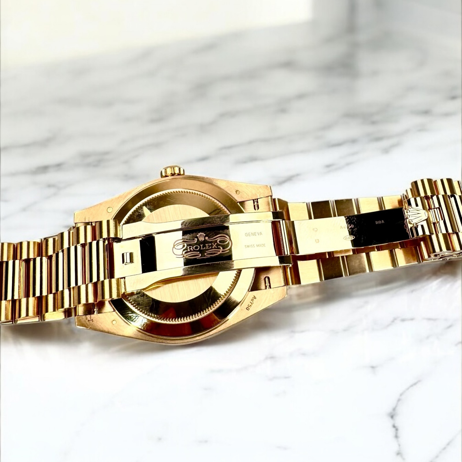 The watch boasts an 18-karat yellow gold Presidential style bracelet, a classic choice for Rolex watches of superior class. The bracelet, known for both its aesthetic appeal and reliability, wraps around the wrist gracefully, providing the wearer unrivaled comfort and satisfaction.