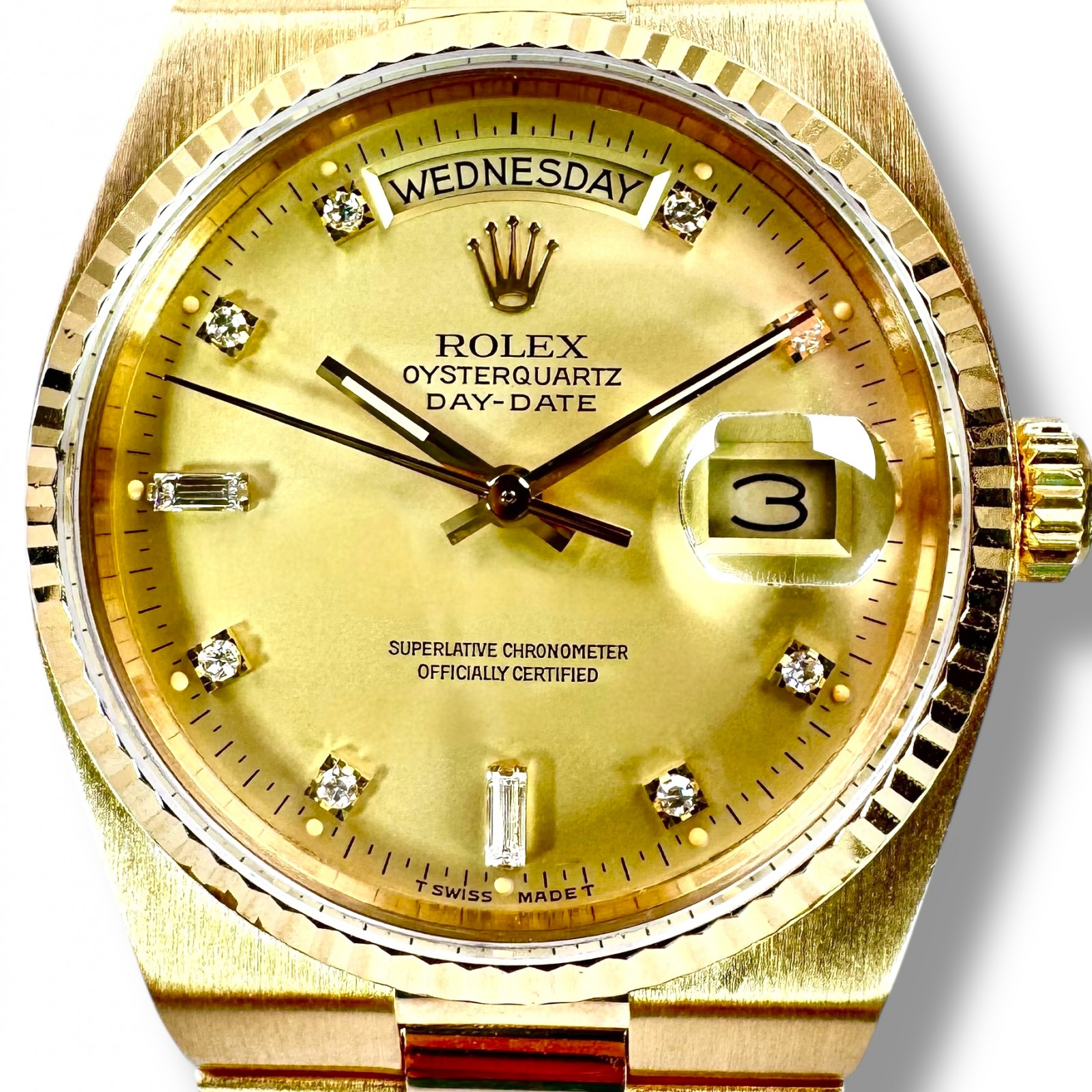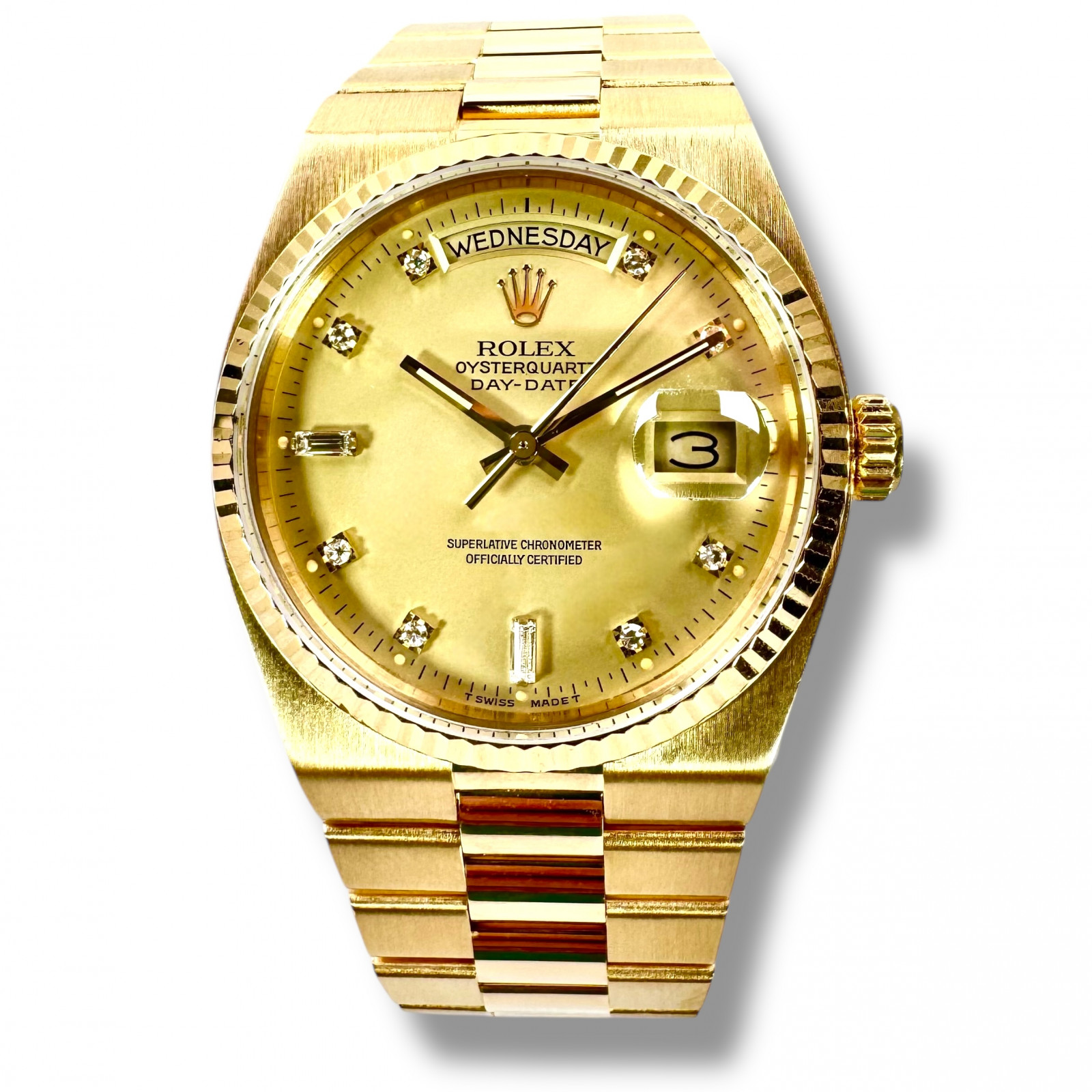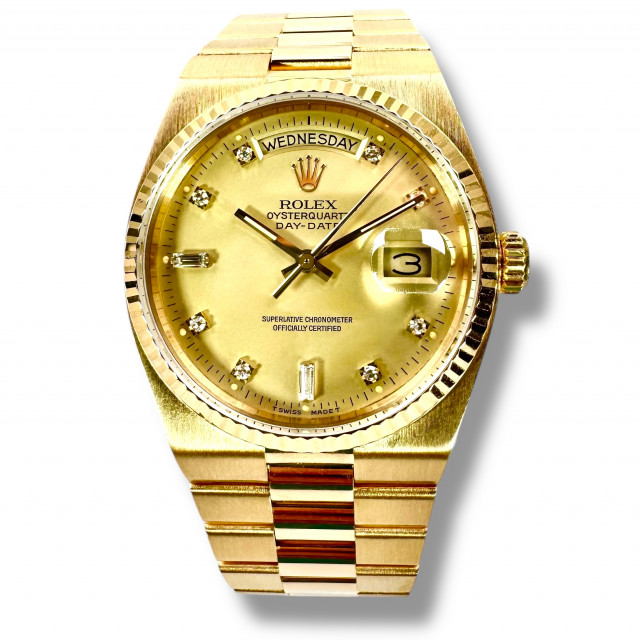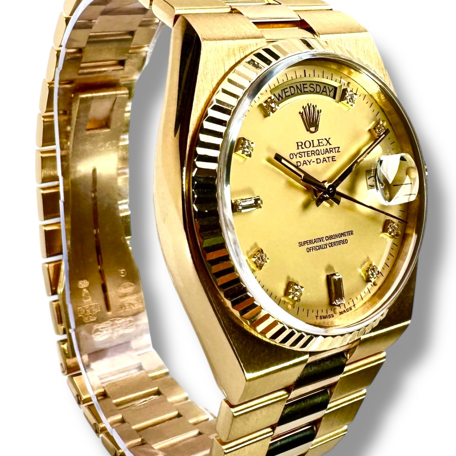 The spectacular Rolex Oysterquartz President Day-Date Yellow Gold watch takes on a royal demeanor with its exquisite champagne diamond dial, lavishing your wrist with a luxurious sparkle. The dial delivers enhanced readability with its elevated gold baton hour markers, ensuring easy time reading. Enhanced with user convenience in mind, the date window is accurately placed at 3 o'clock, and the day window is conveniently displayed at 12 o'clock.