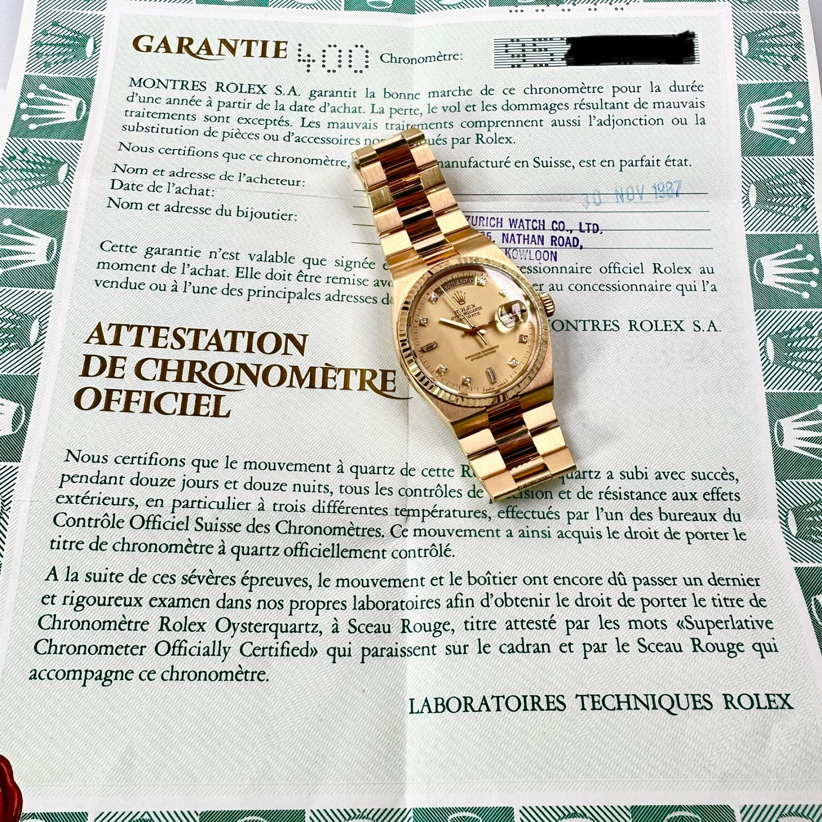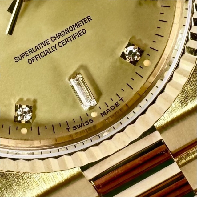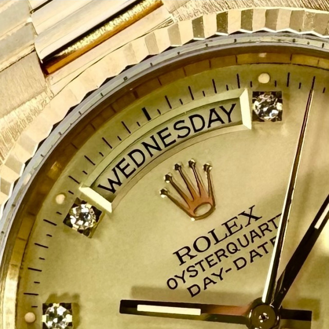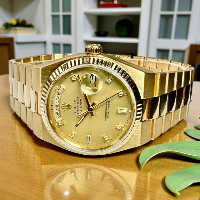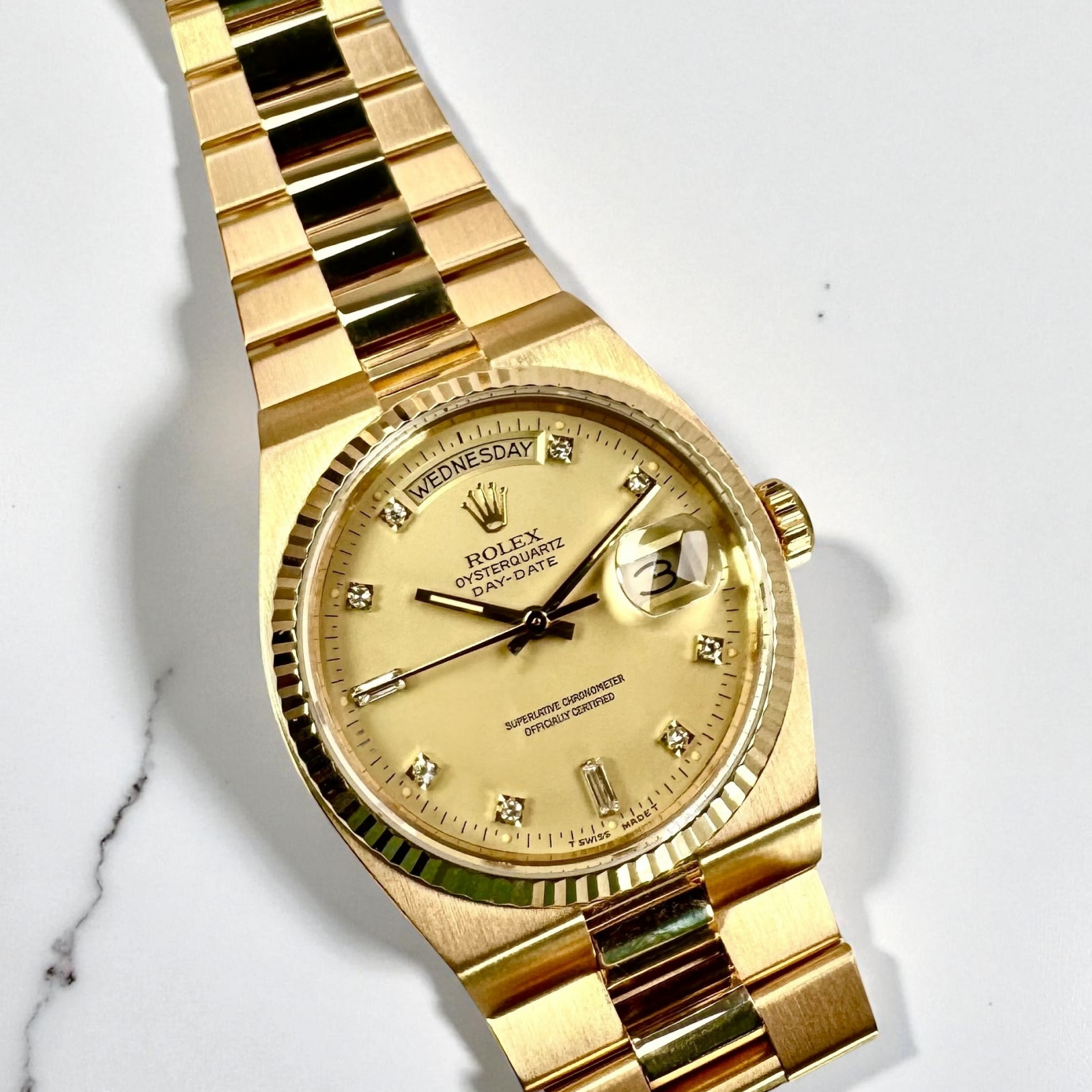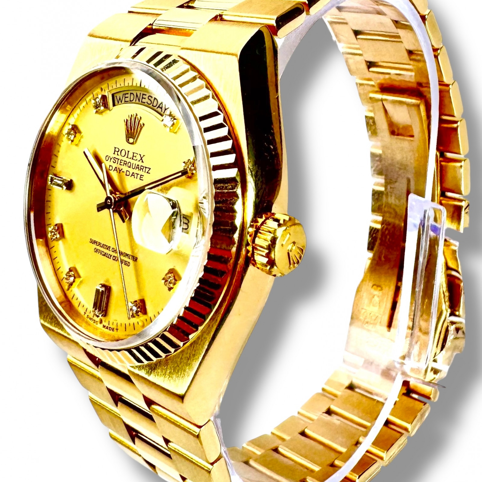 The spectacular Rolex Oysterquartz President Day-Date Yellow Gold watch takes on a royal demeanor with its exquisite champagne diamond dial, lavishing your wrist with a luxurious sparkle. The dial delivers enhanced readability with its elevated gold baton hour markers, ensuring easy time reading. Enhanced with user convenience in mind, the date window is accurately placed at 3 o'clock, and the day window is conveniently displayed at 12 o'clock.