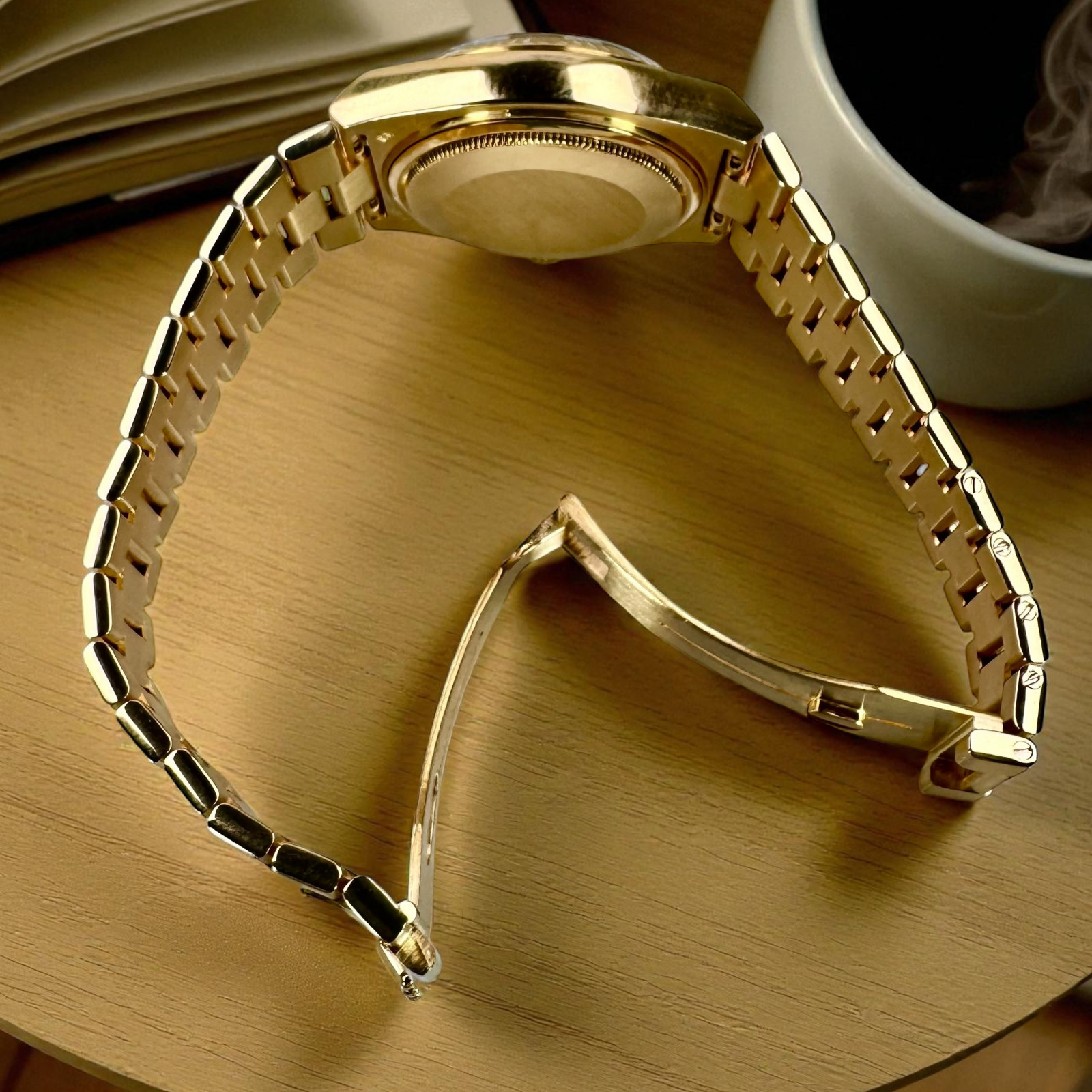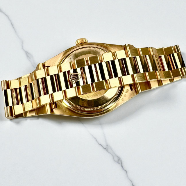 This Rolex President Day-Date watch's grandeur extends to its 18k yellow gold Oysterquartz bracelet that subtly complements the timepiece's overall aesthetics. Resilient in nature and promising utmost comfort, this bracelet ensures secure wear for every occasion. The inclusion of a concealed deployant clasp harmoniously amalgamates the bracelet, keeping the watch secured without compromising its streamlined, classic look.