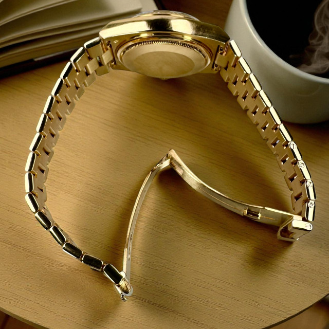 A significant attribute that distinguishes the Rolex men's watch from its contemporaries is the illustrious Rolex logo, finely etched on the surface of the crown. The case is encircled by a finely engineered 18k yellow gold fluted bezel that exemplifies elegance and frames the watch's face with a scratch-resistant sapphire crystal, precisely crafted with a Cyclops magnifier to meticulously enhance every detail.